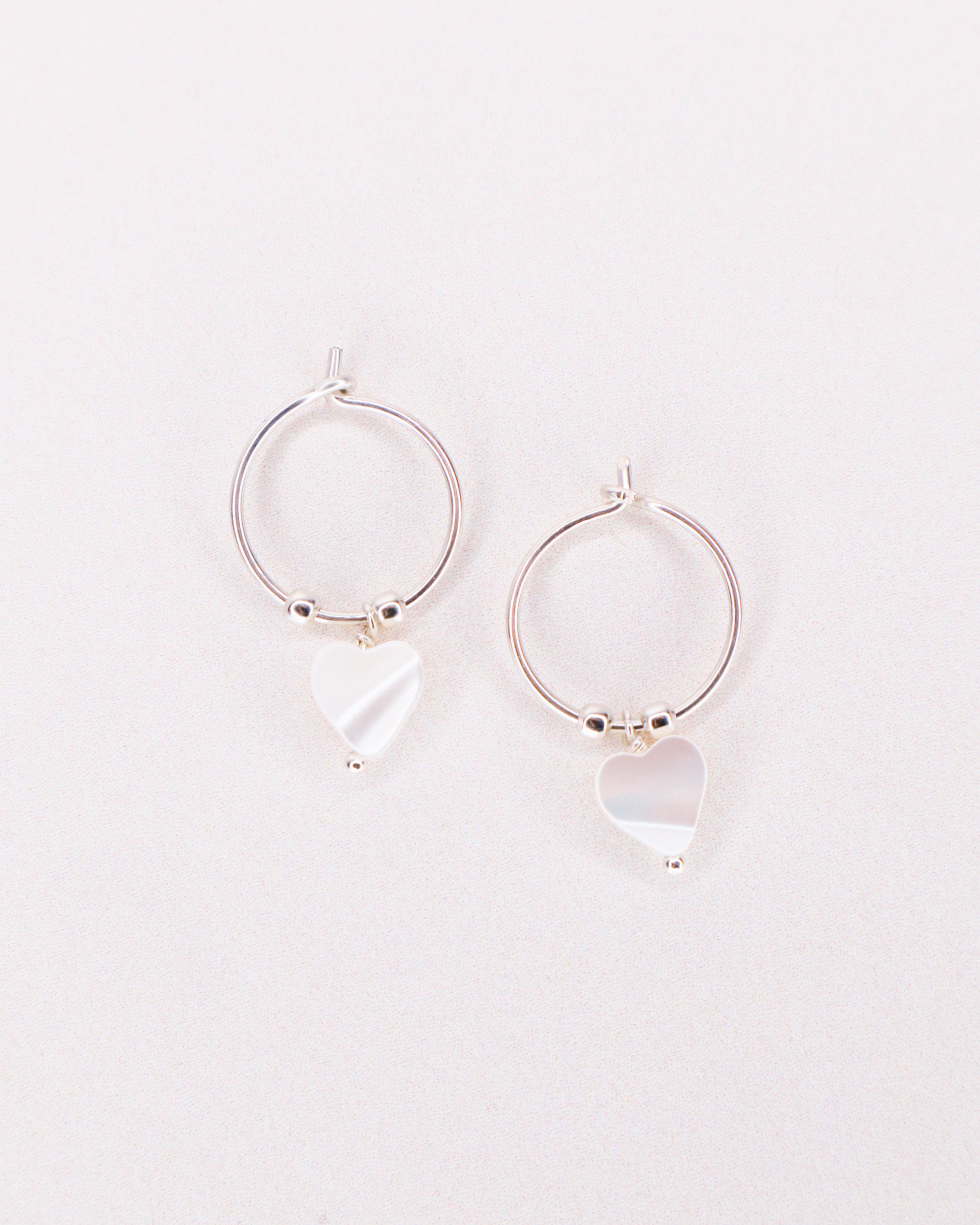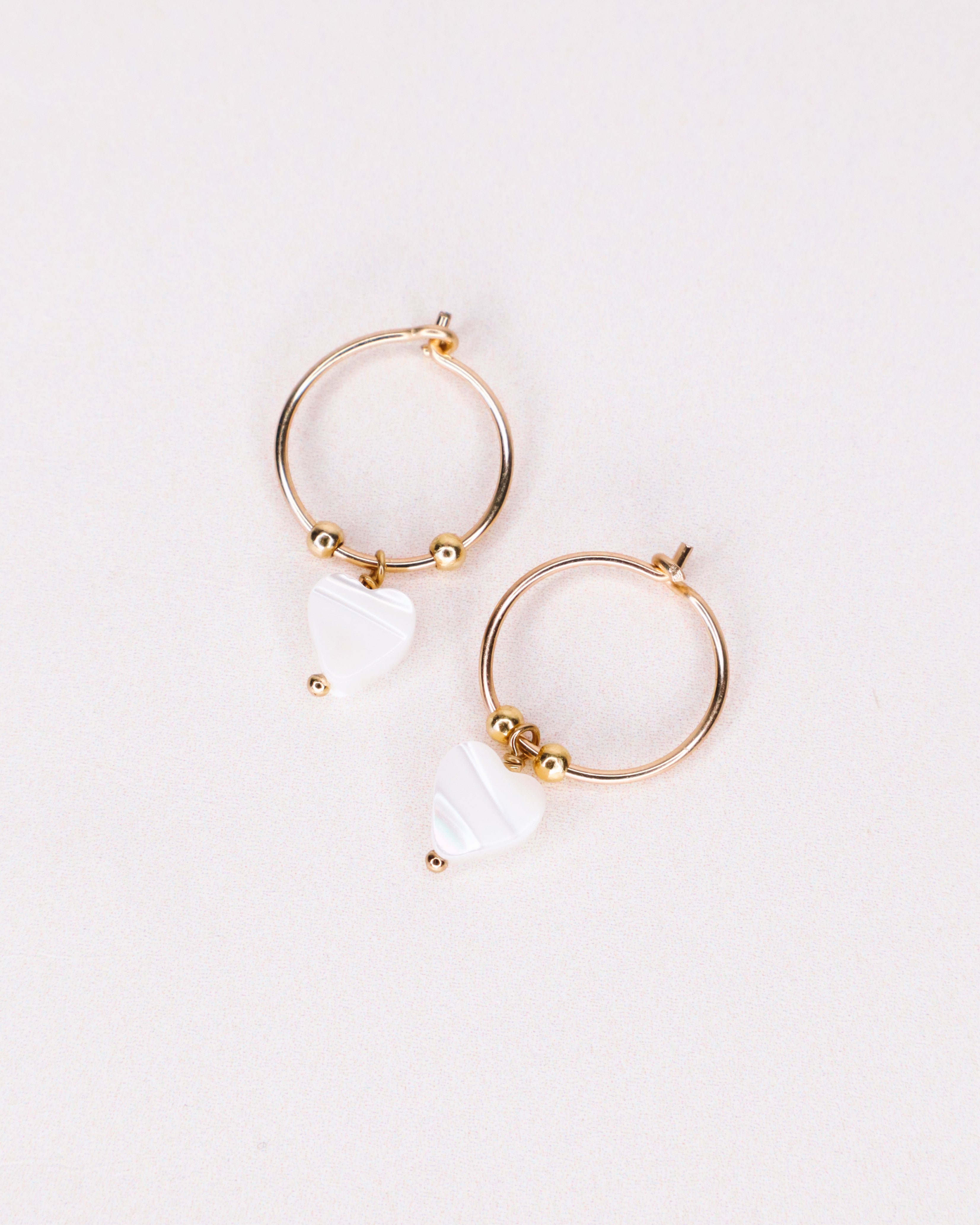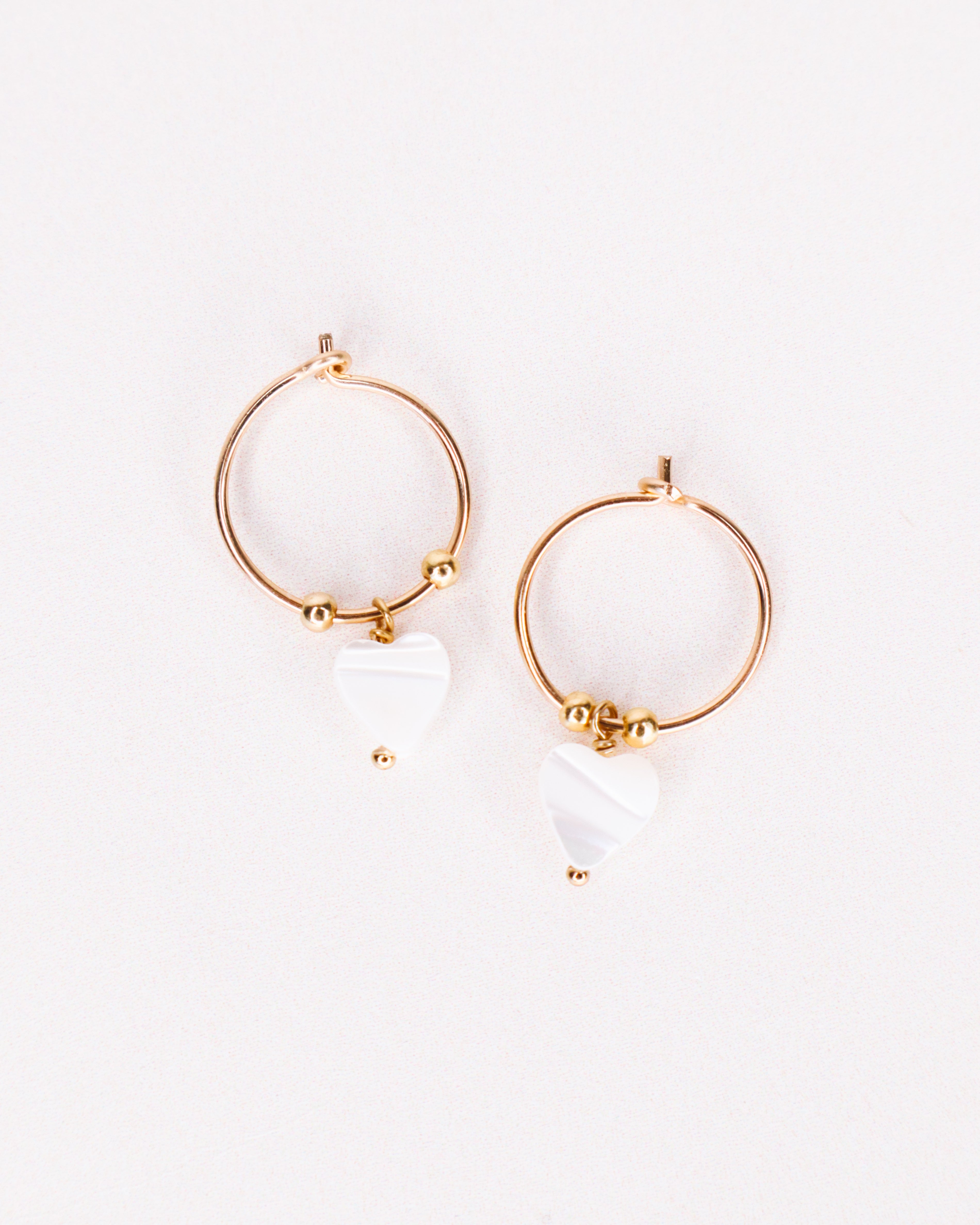Fabriquées à partir d'or laminé 14ct ou d'argent 925, ces créoles sont ornées de pampilles en nacre blanche taillées en cœur. Les boucles ont un diamètre de 1,3cm.