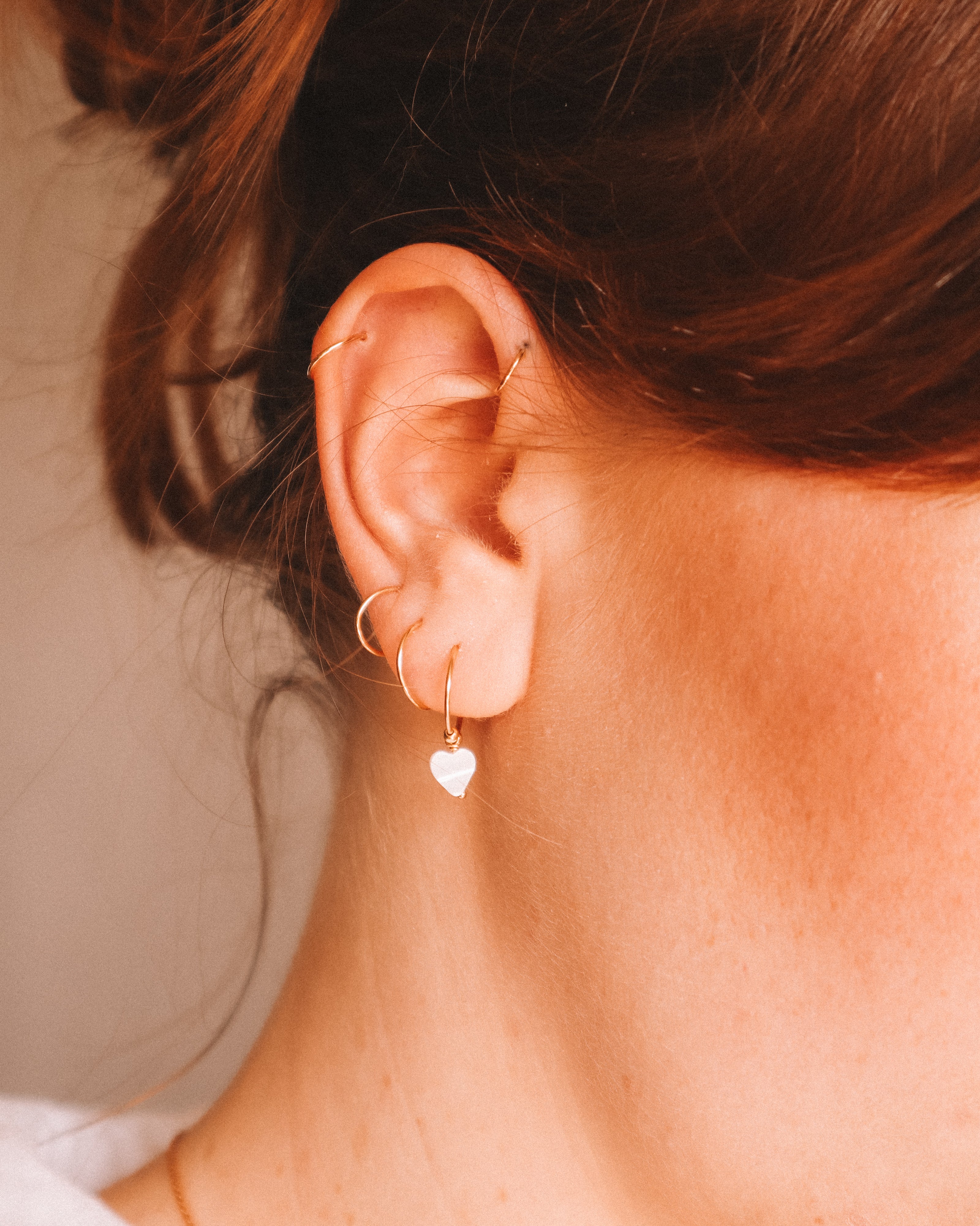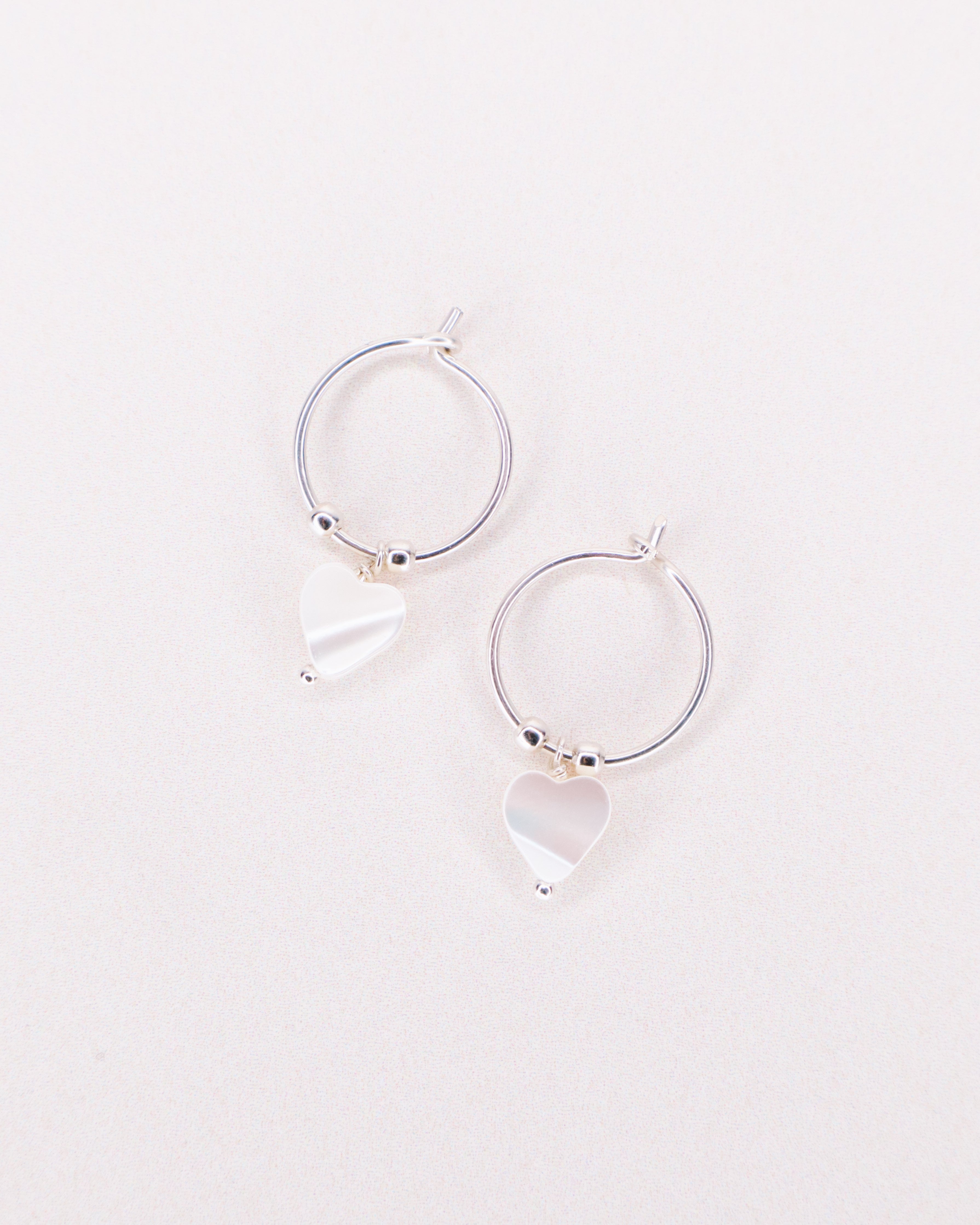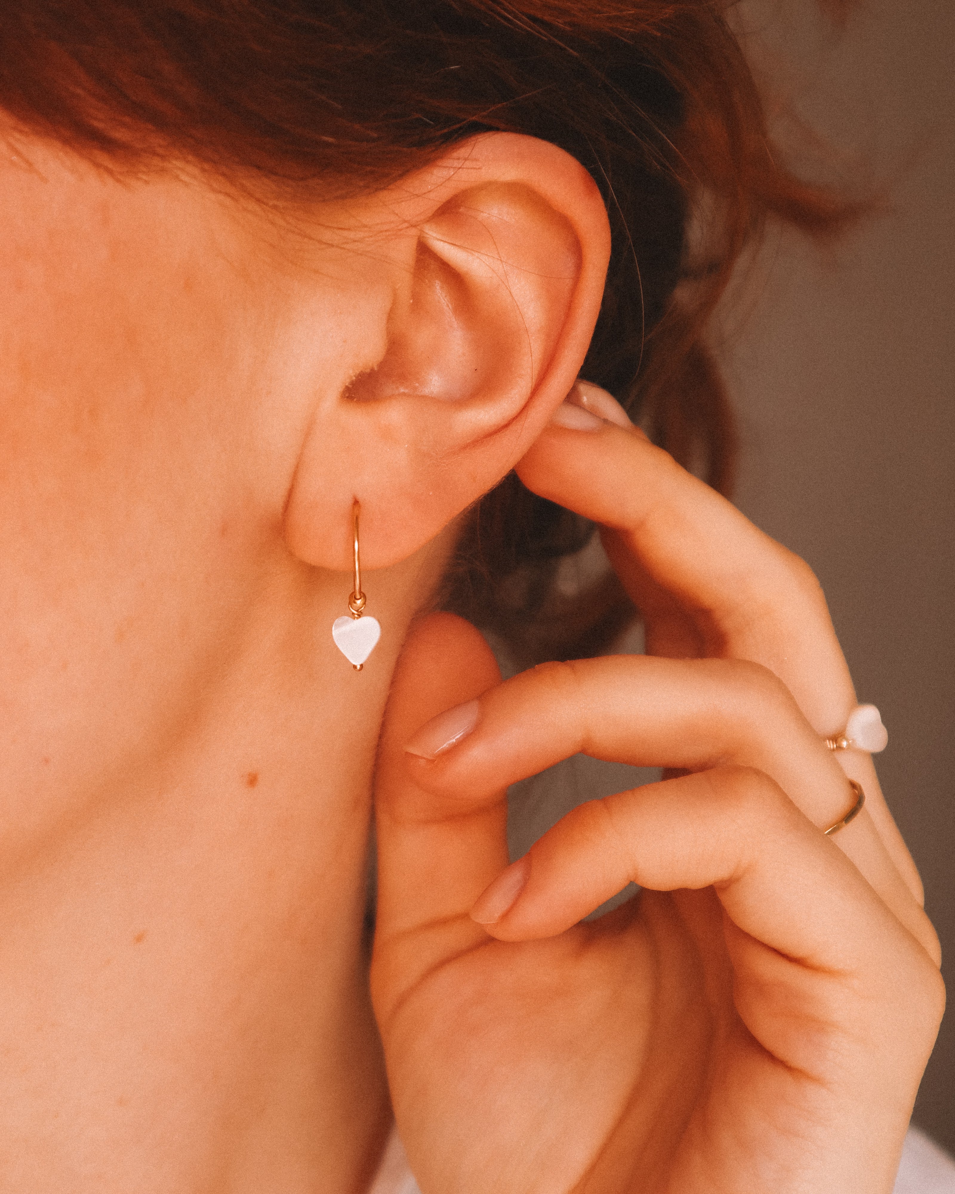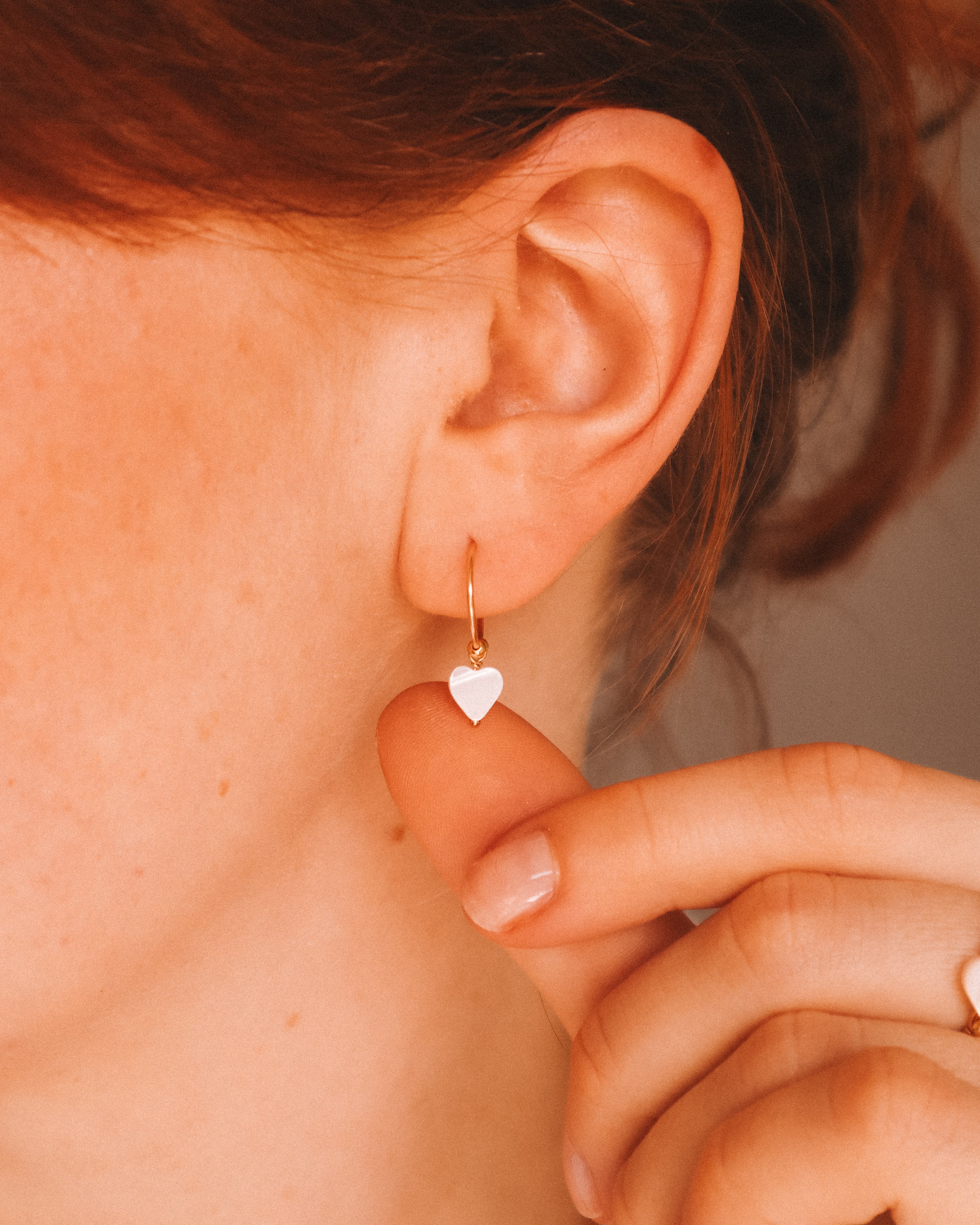 Fabriquées à partir d'or laminé 14ct ou d'argent 925, ces créoles sont ornées de pampilles en nacre blanche taillées en cœur. Les boucles ont un diamètre de 1,3cm.