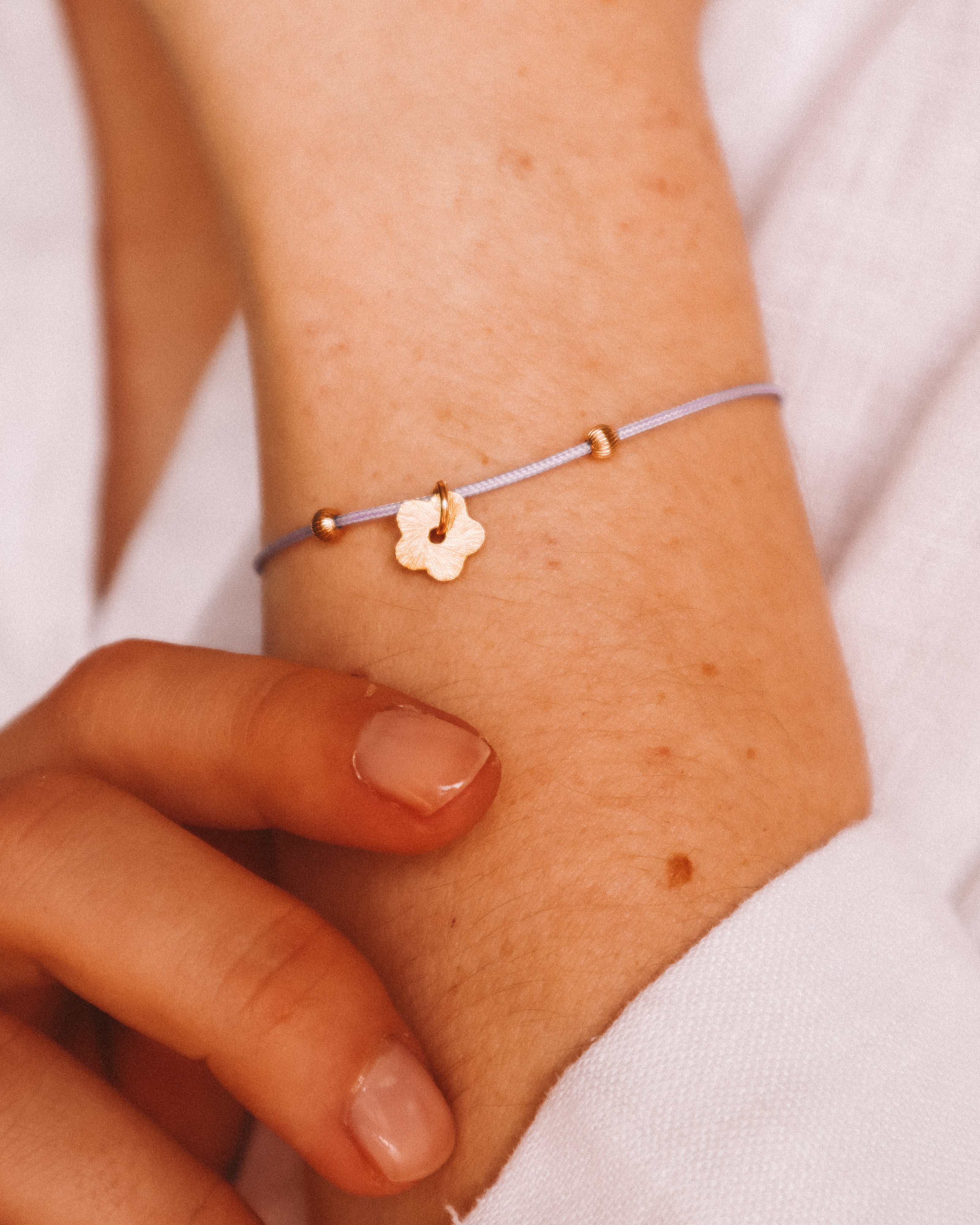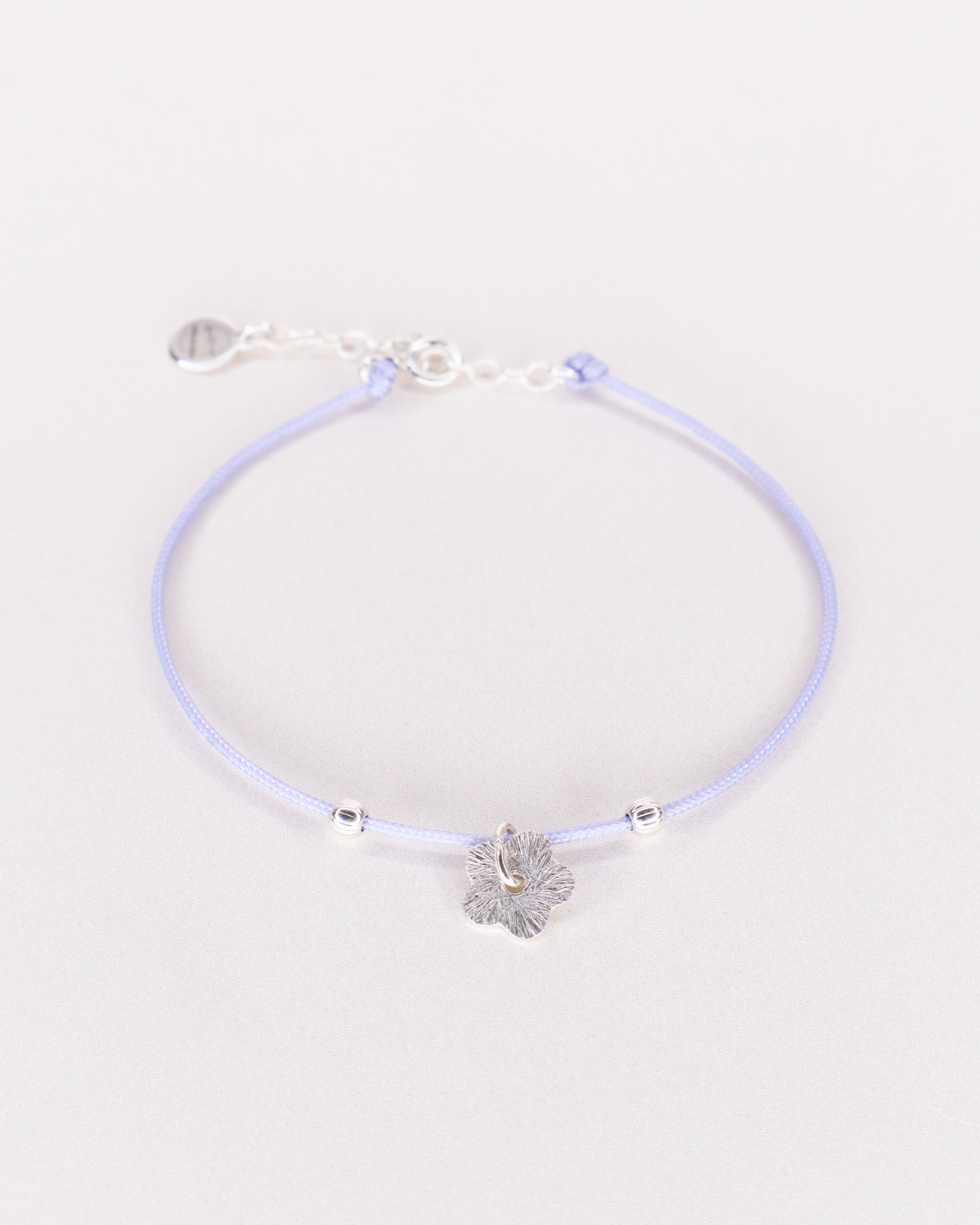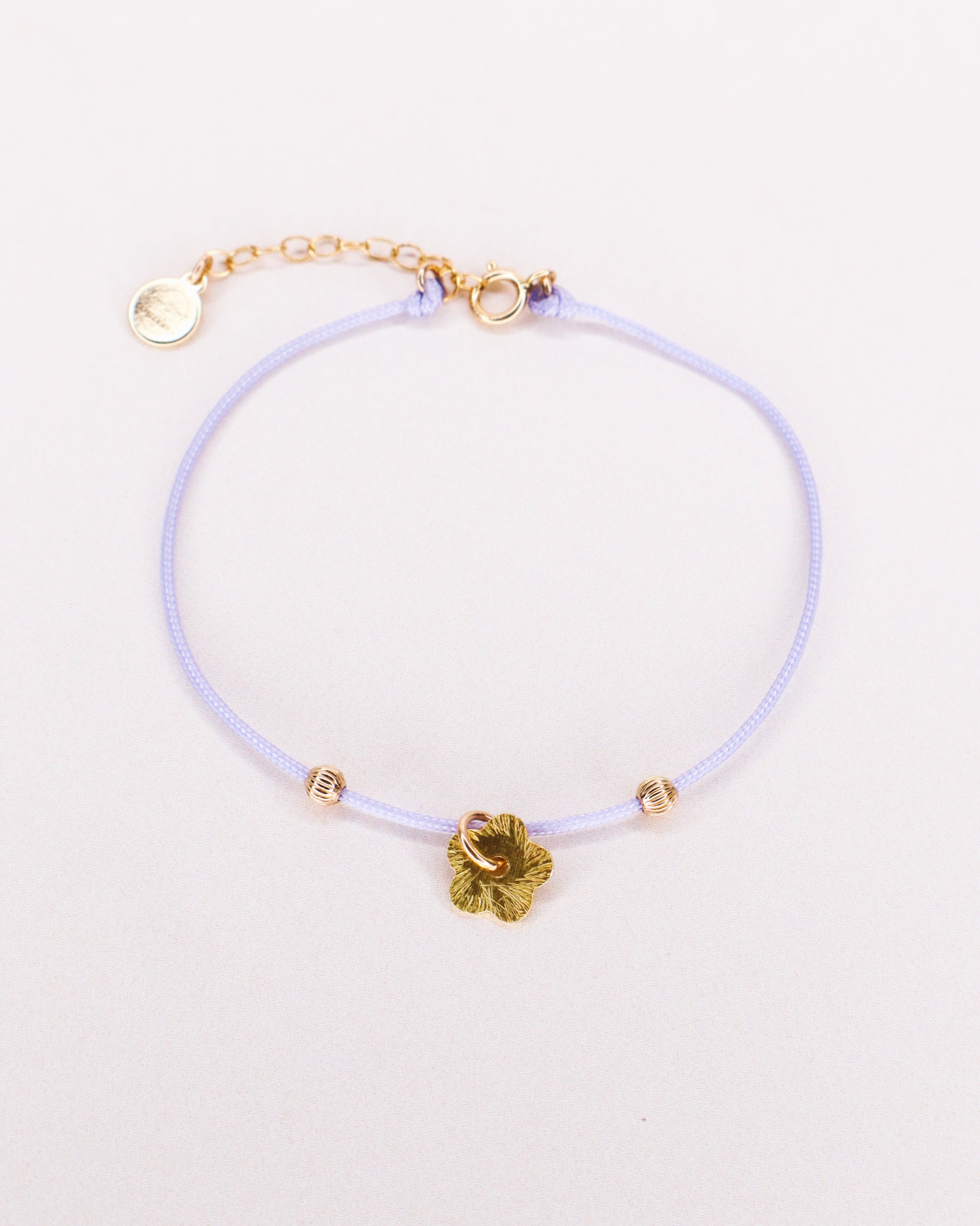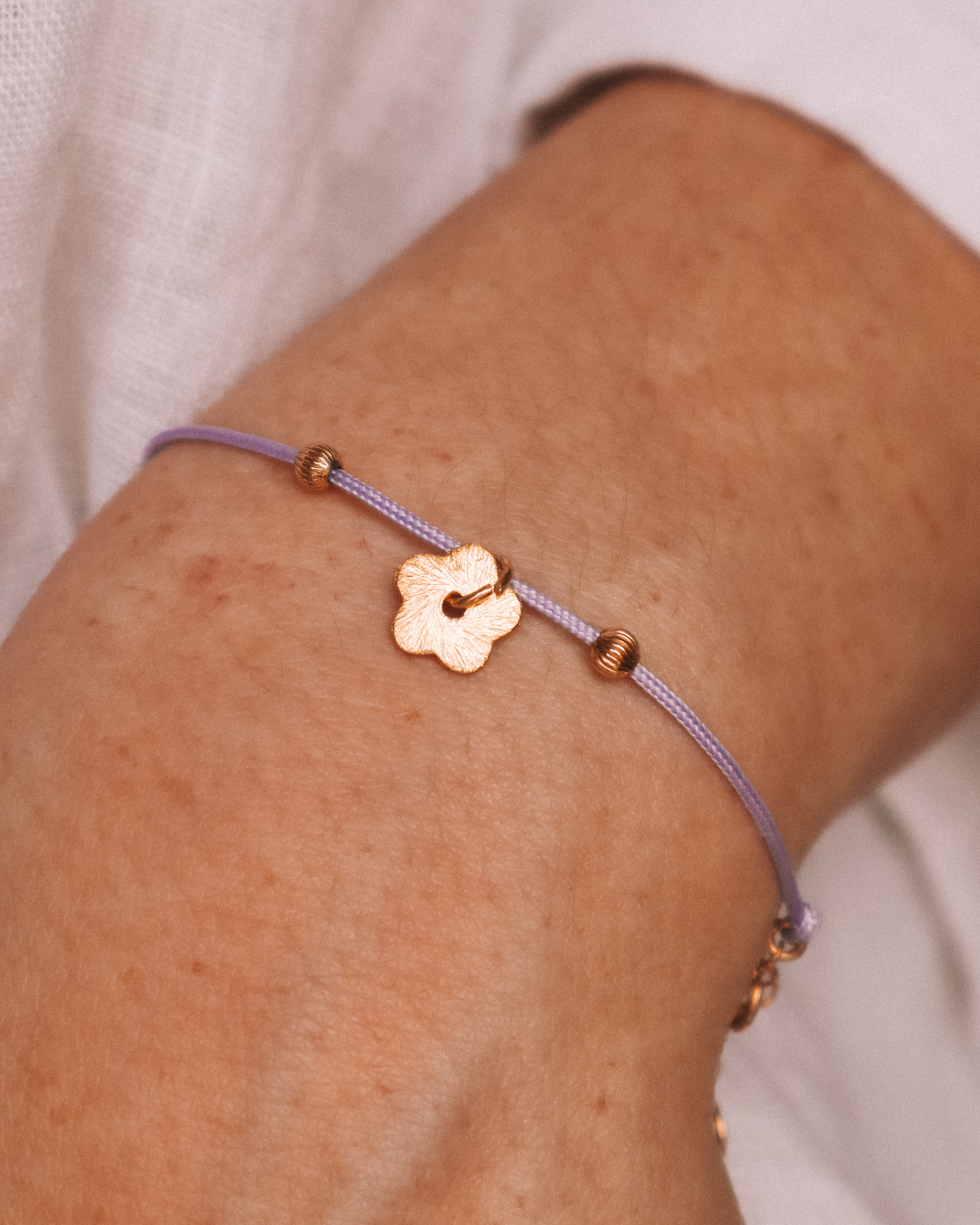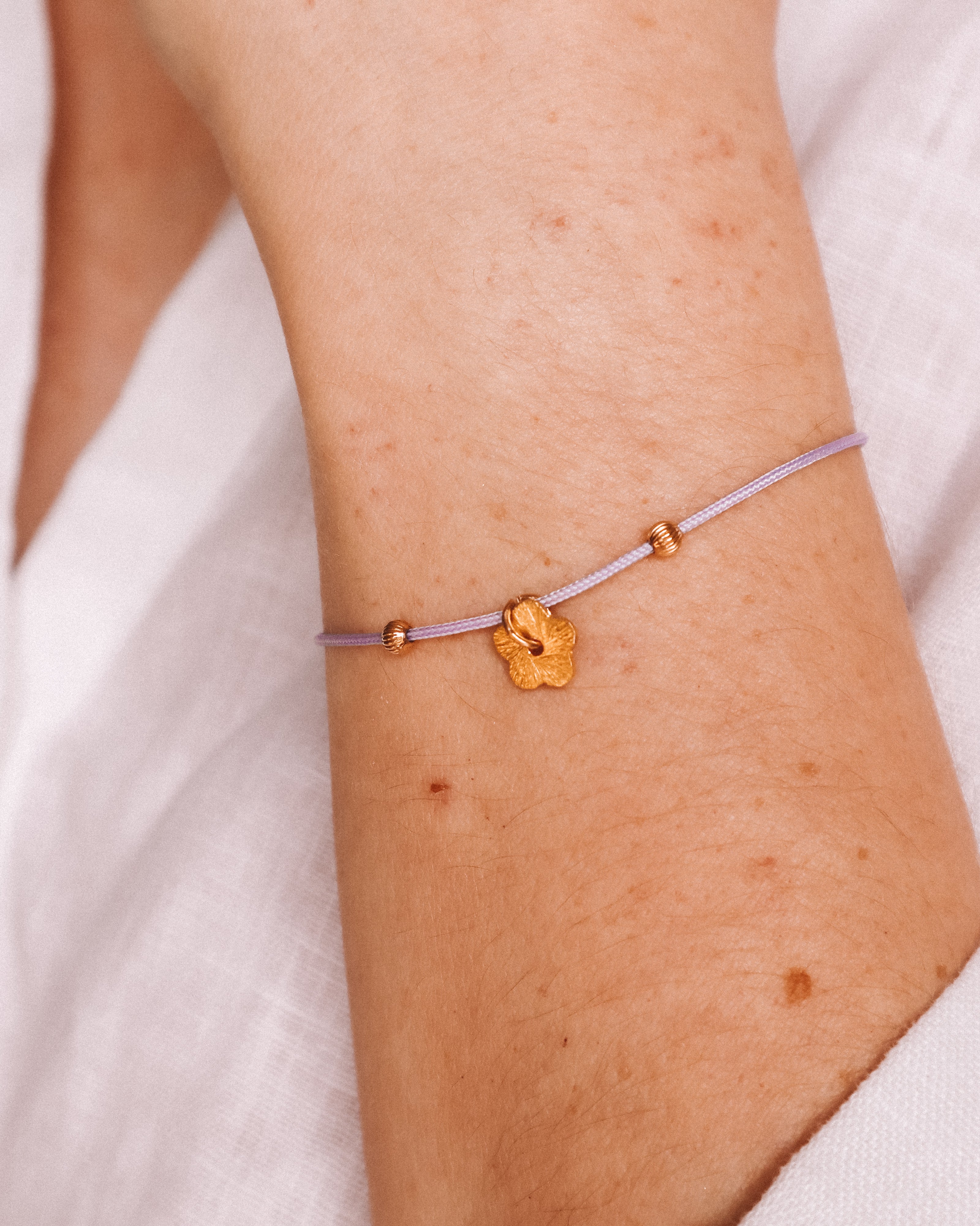 Découvrez le bracelet cordon Aster, fabriqué à partir d'un cordon en coton mauve, orné d'or laminé 14ct ou d'argent 925. Une fleur précieuse brossée se promène en son centre.