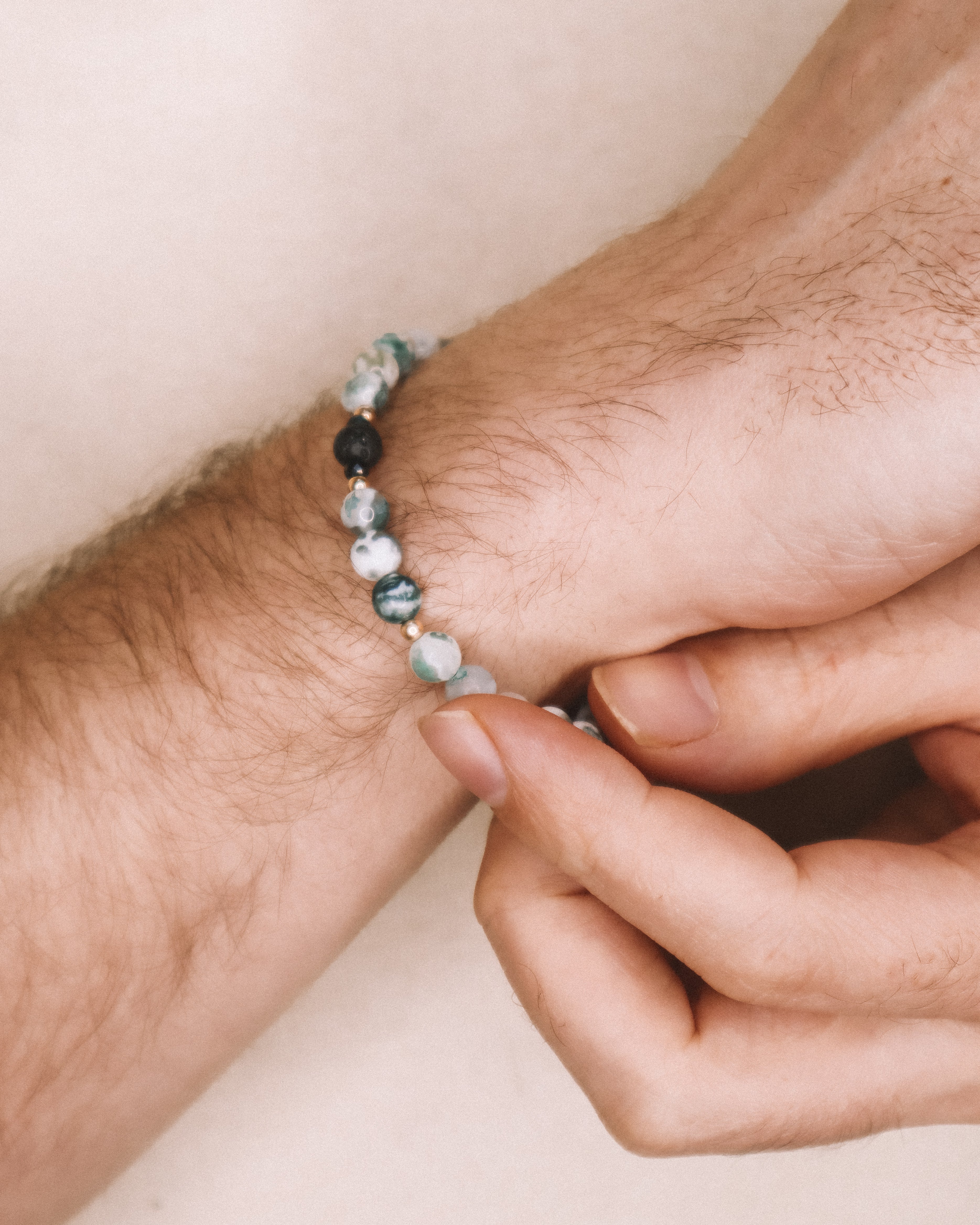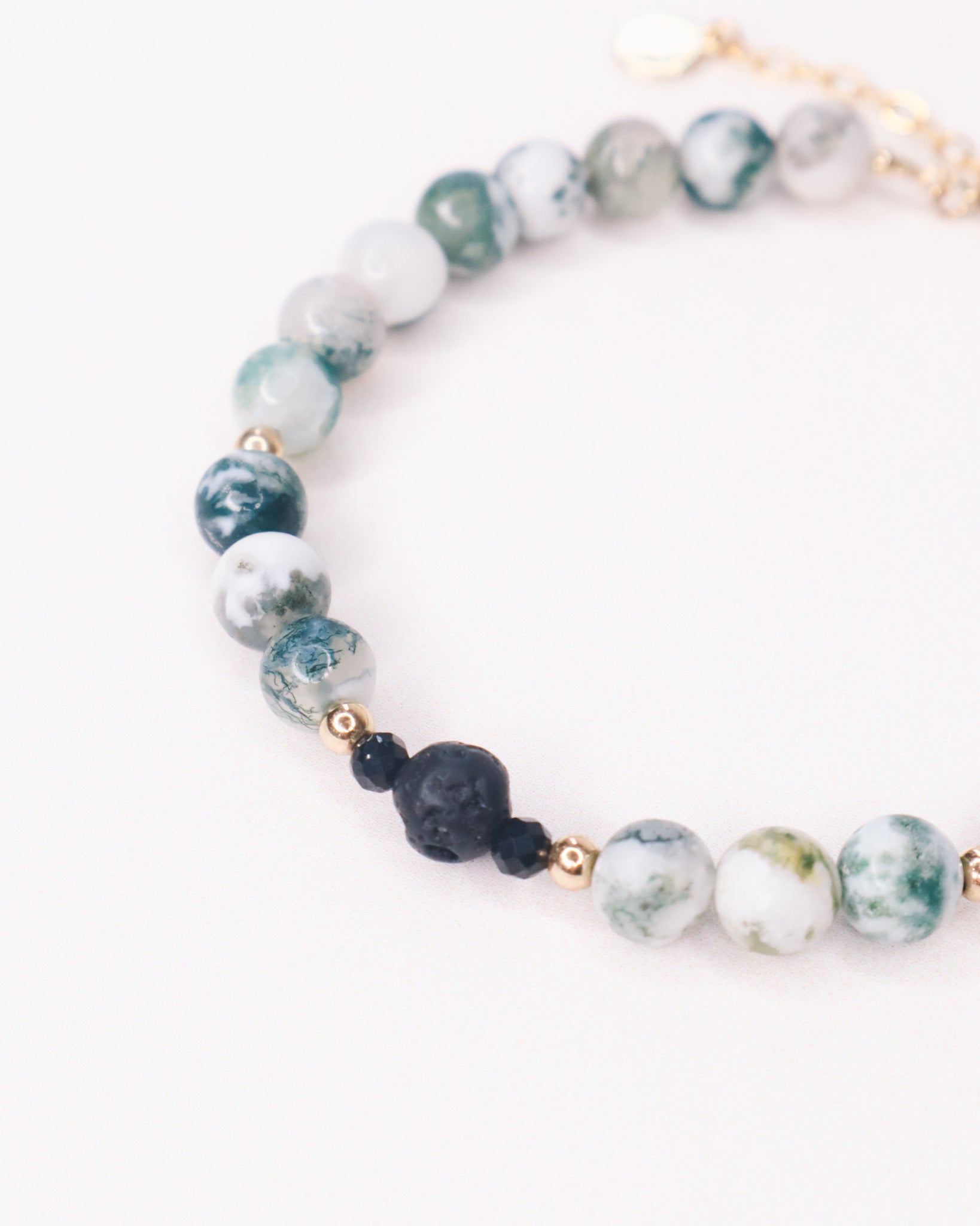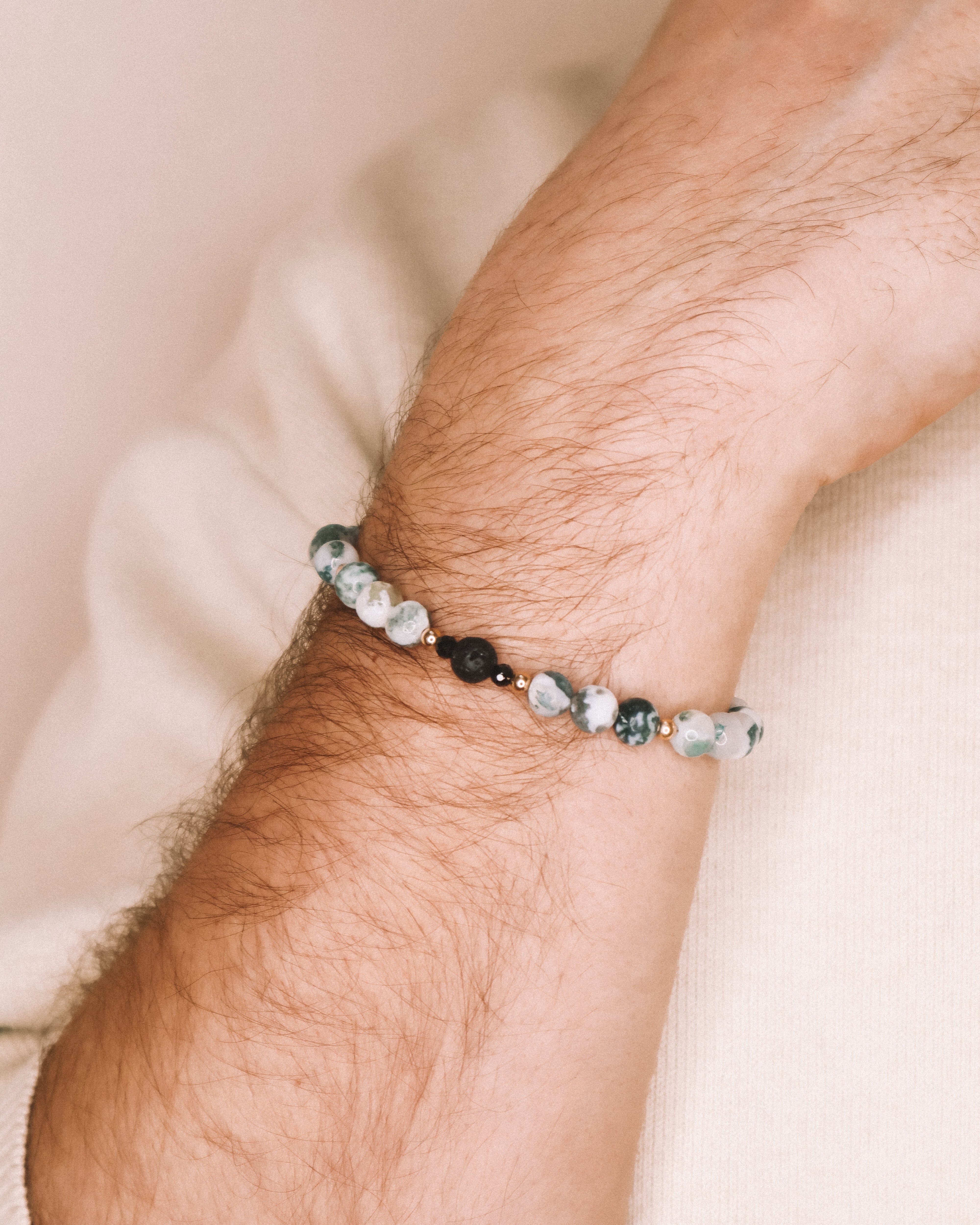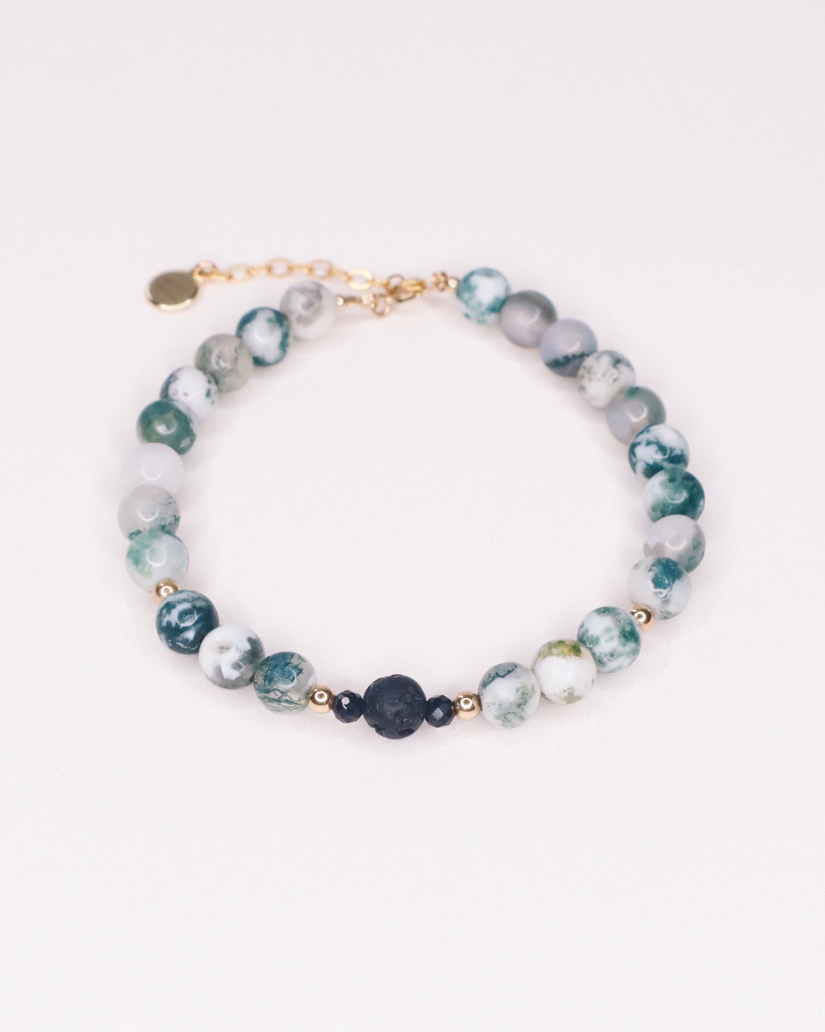 Bracelet précieux en goldfilled (alliage de laiton et d'or 14ct) ornée de pierres naturelles d'agate mousse verte, d'une pierre de lave noire centrale entourée de spinelles noires. Le bracelet fait 17cm de longueur avec une chaine d'extension de 3cm.
