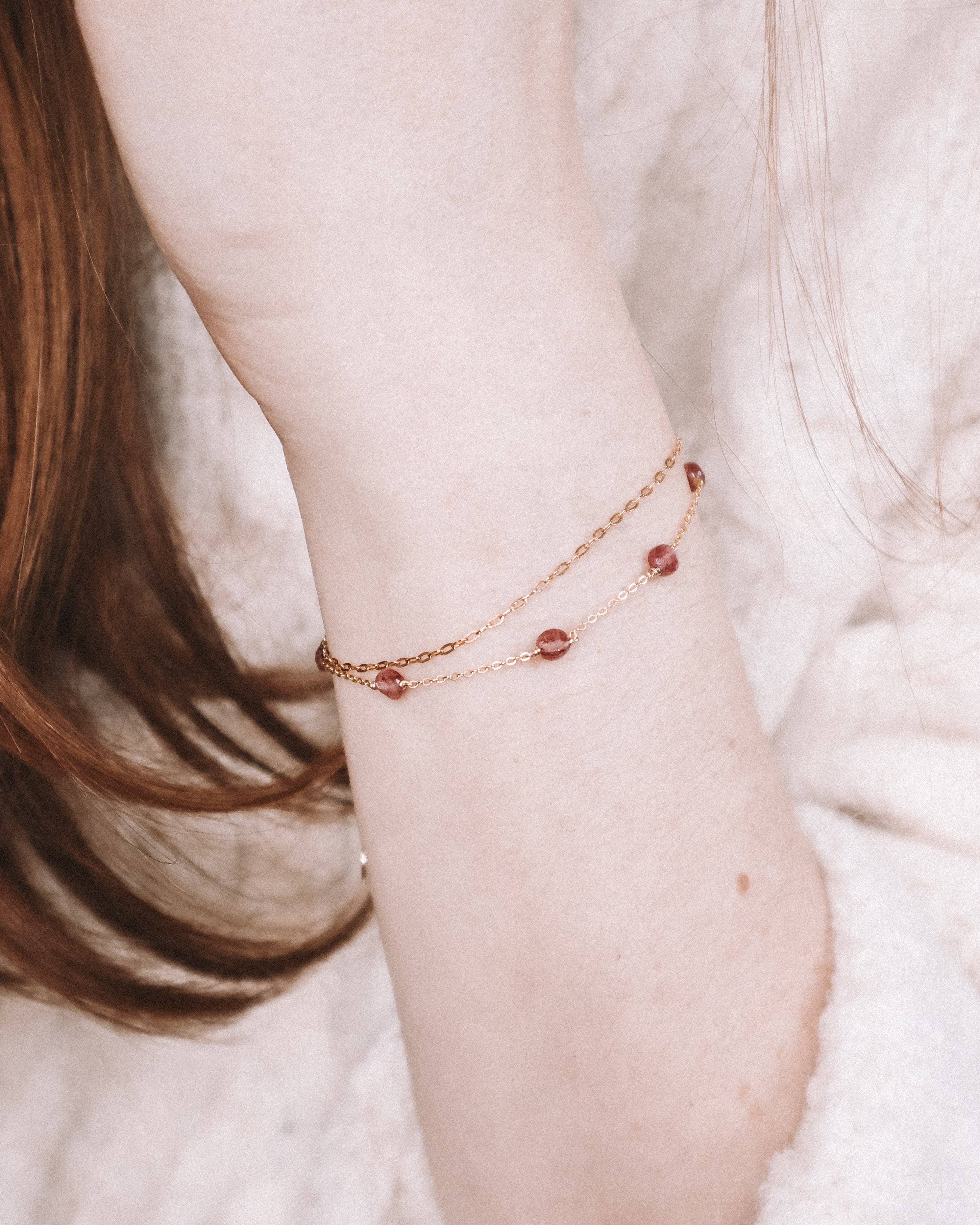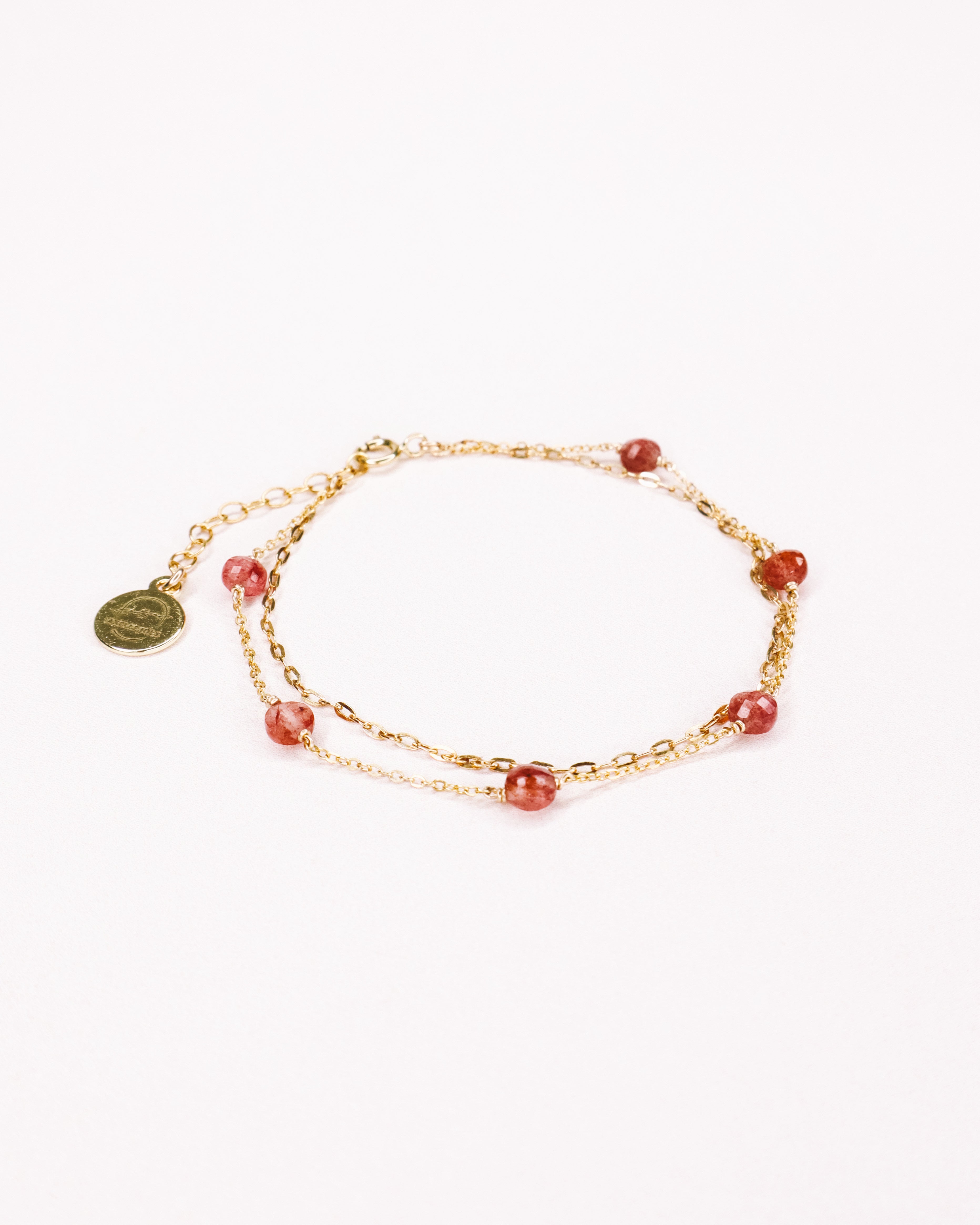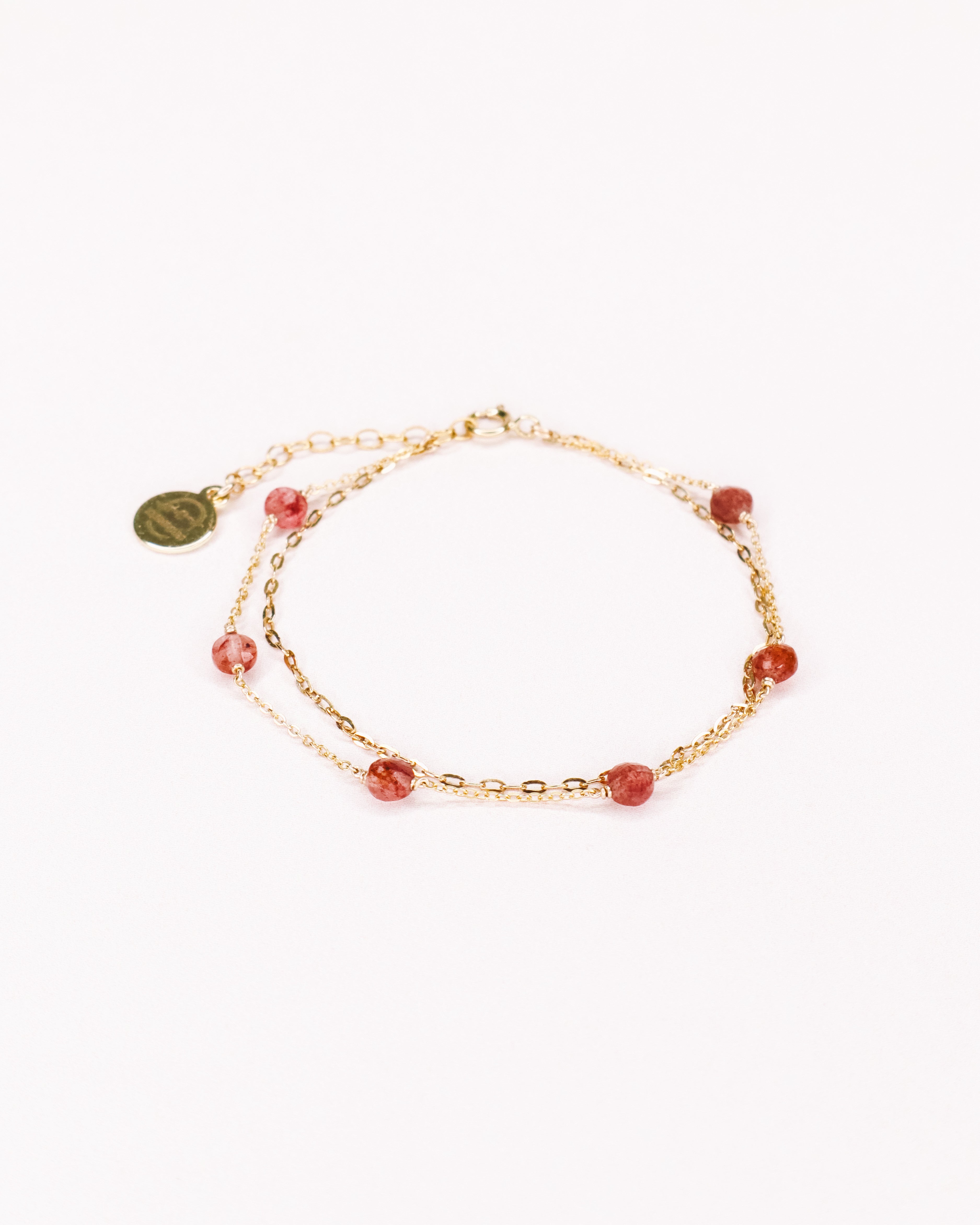 Bracelet précieux en goldfilled (alliage de laiton et d'or 14ct) ou en argent 925, orné de pierres de quartz fraise. Le bracelet fait 14,5cm de longueur avec une chaine d'extension de 3cm.
