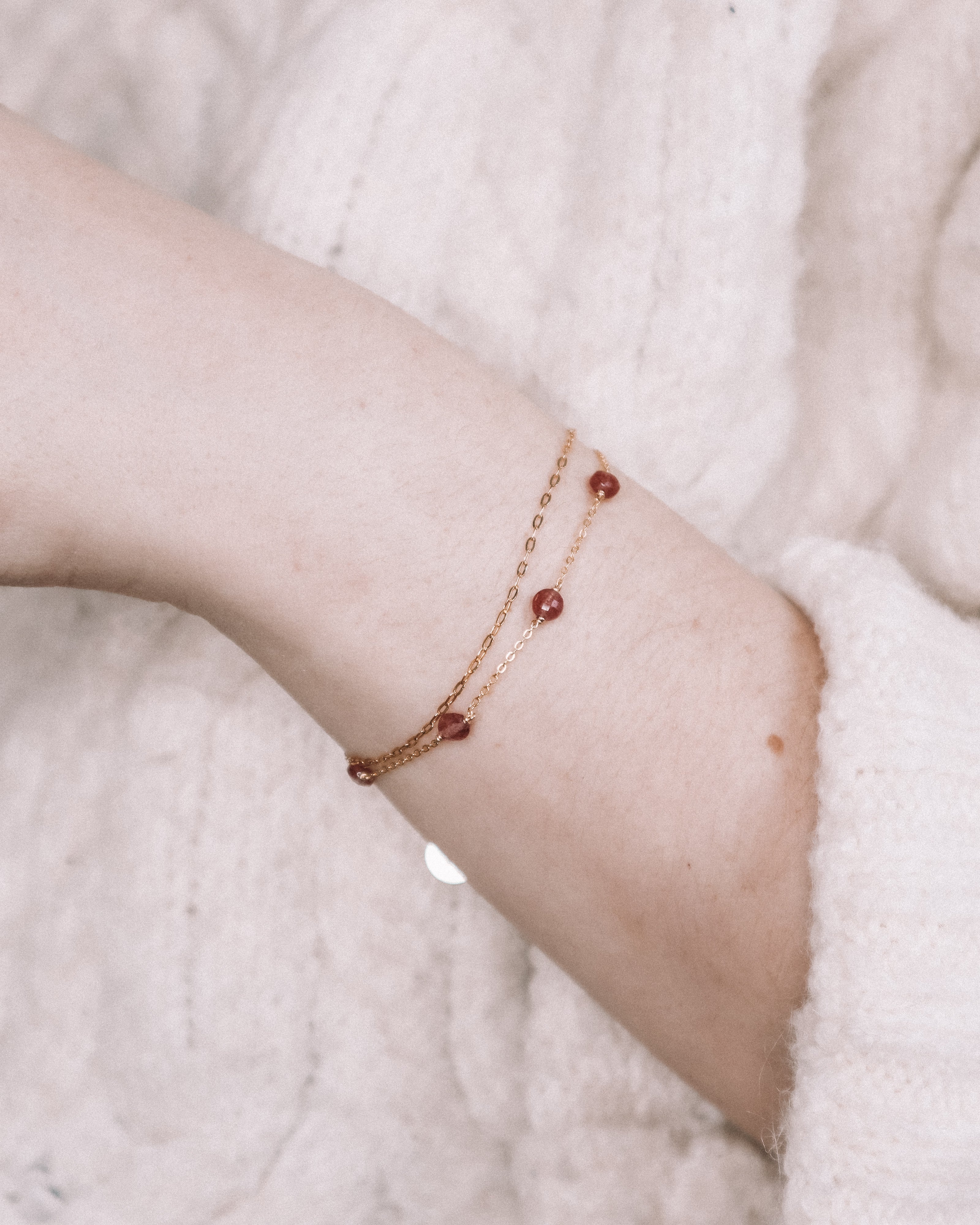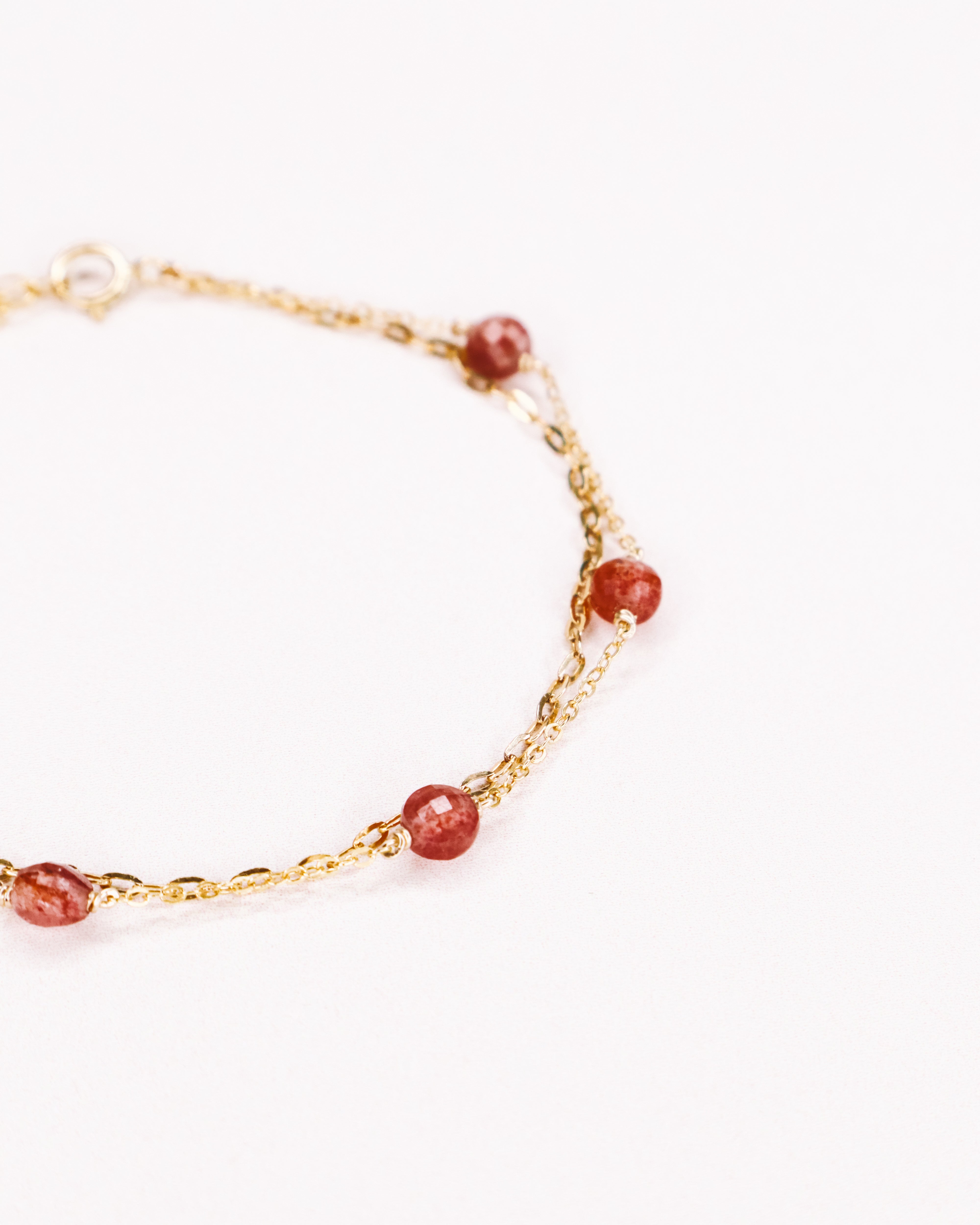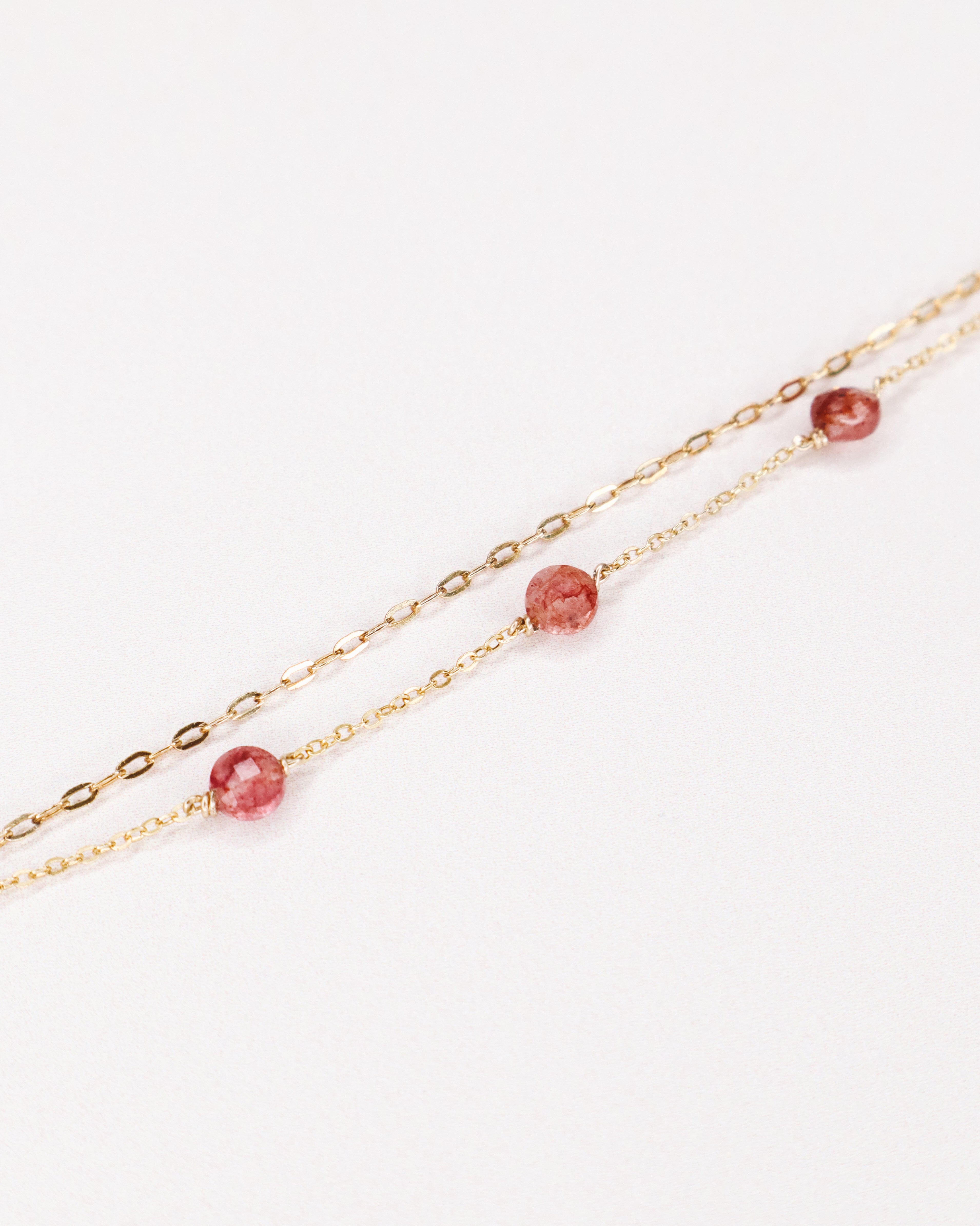 Bracelet précieux en goldfilled (alliage de laiton et d'or 14ct) ou en argent 925, orné de pierres de quartz fraise. Le bracelet fait 14,5cm de longueur avec une chaine d'extension de 3cm.