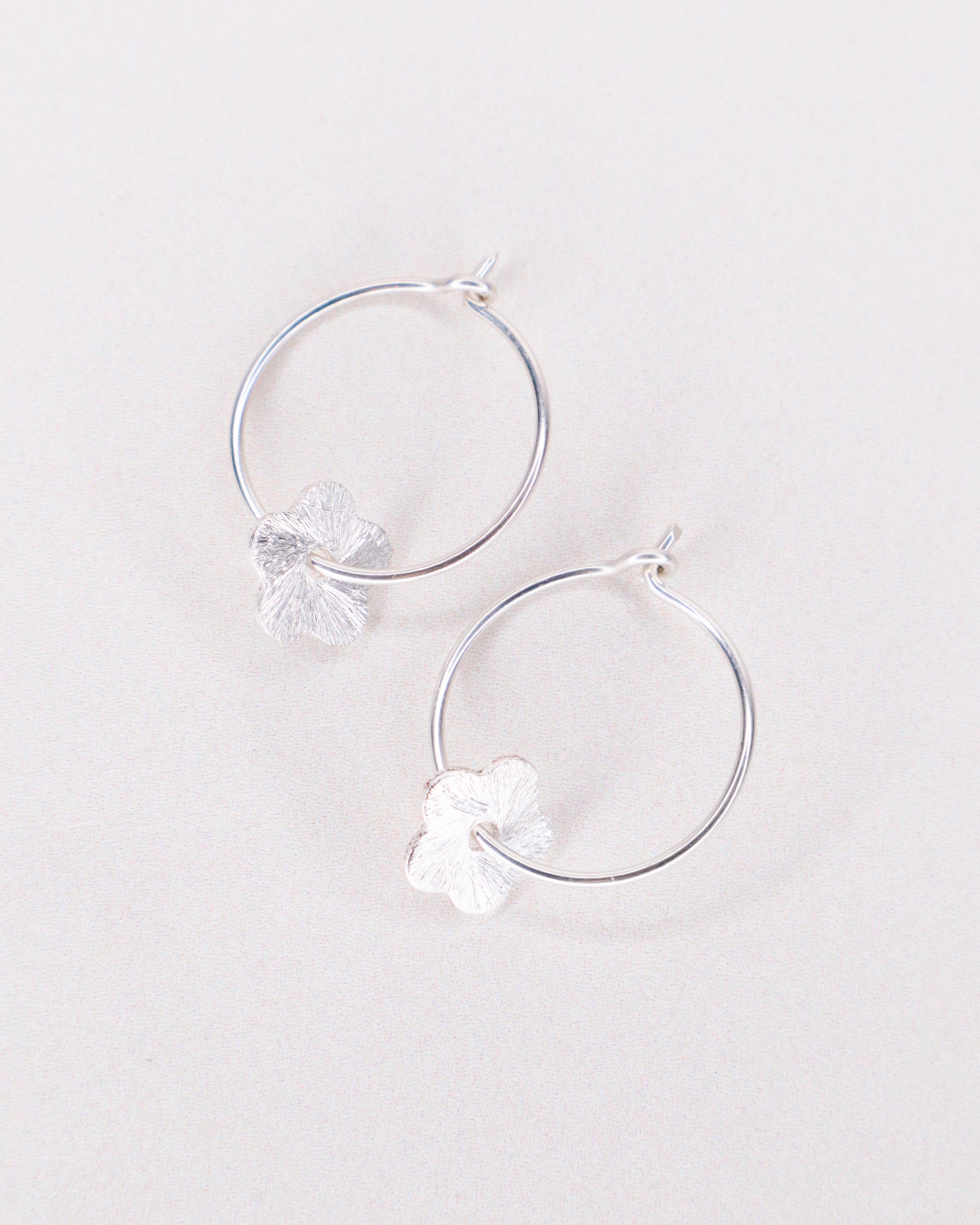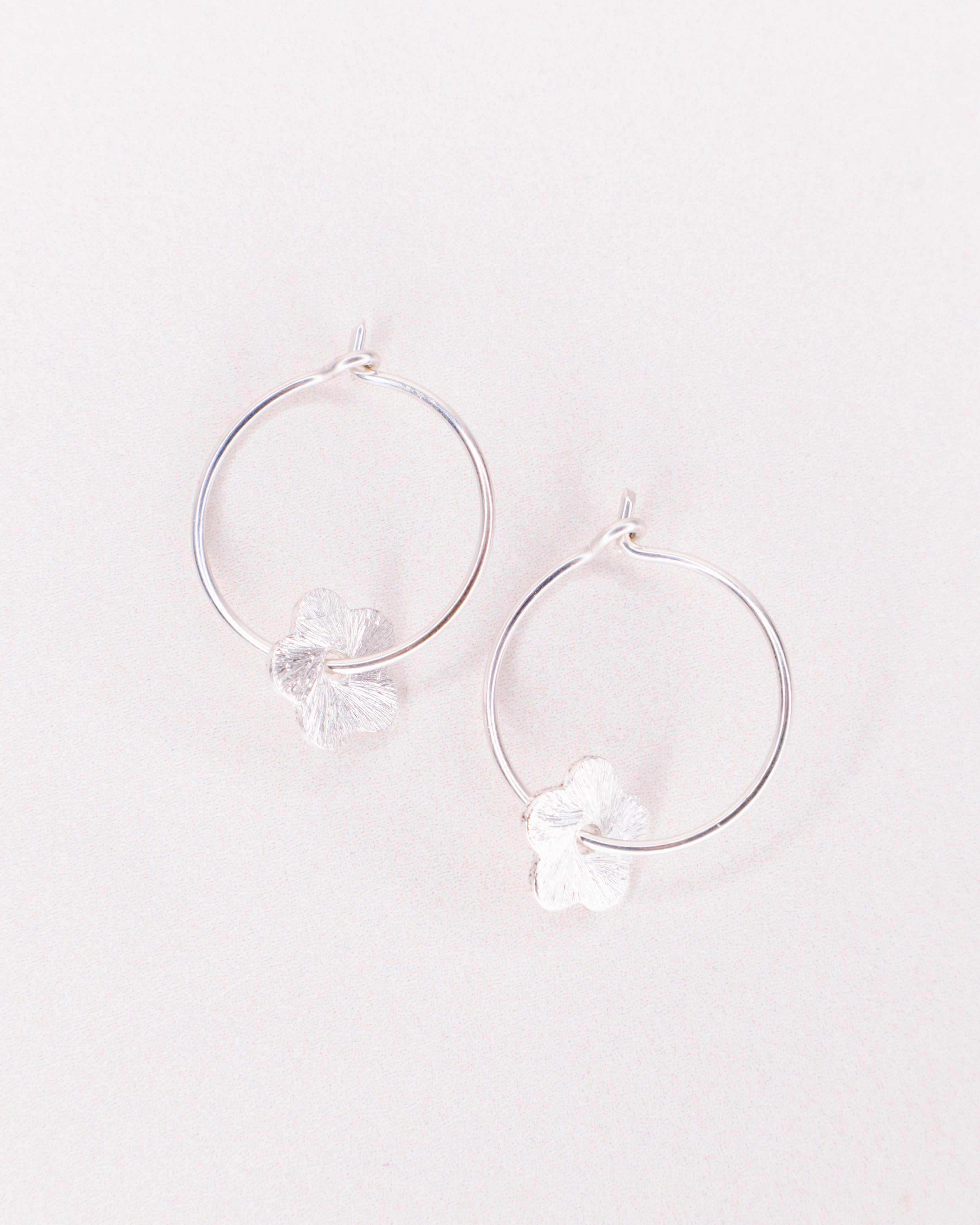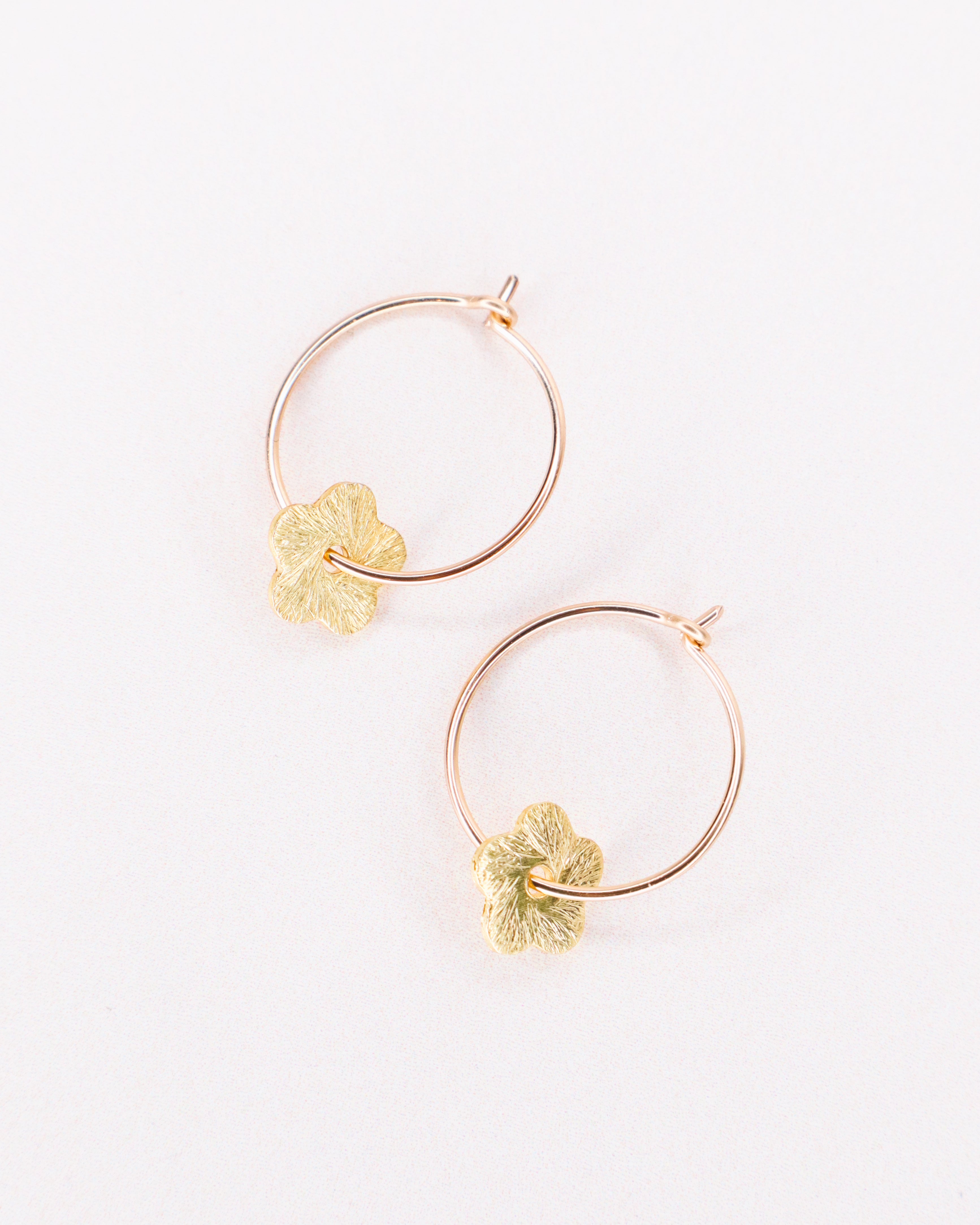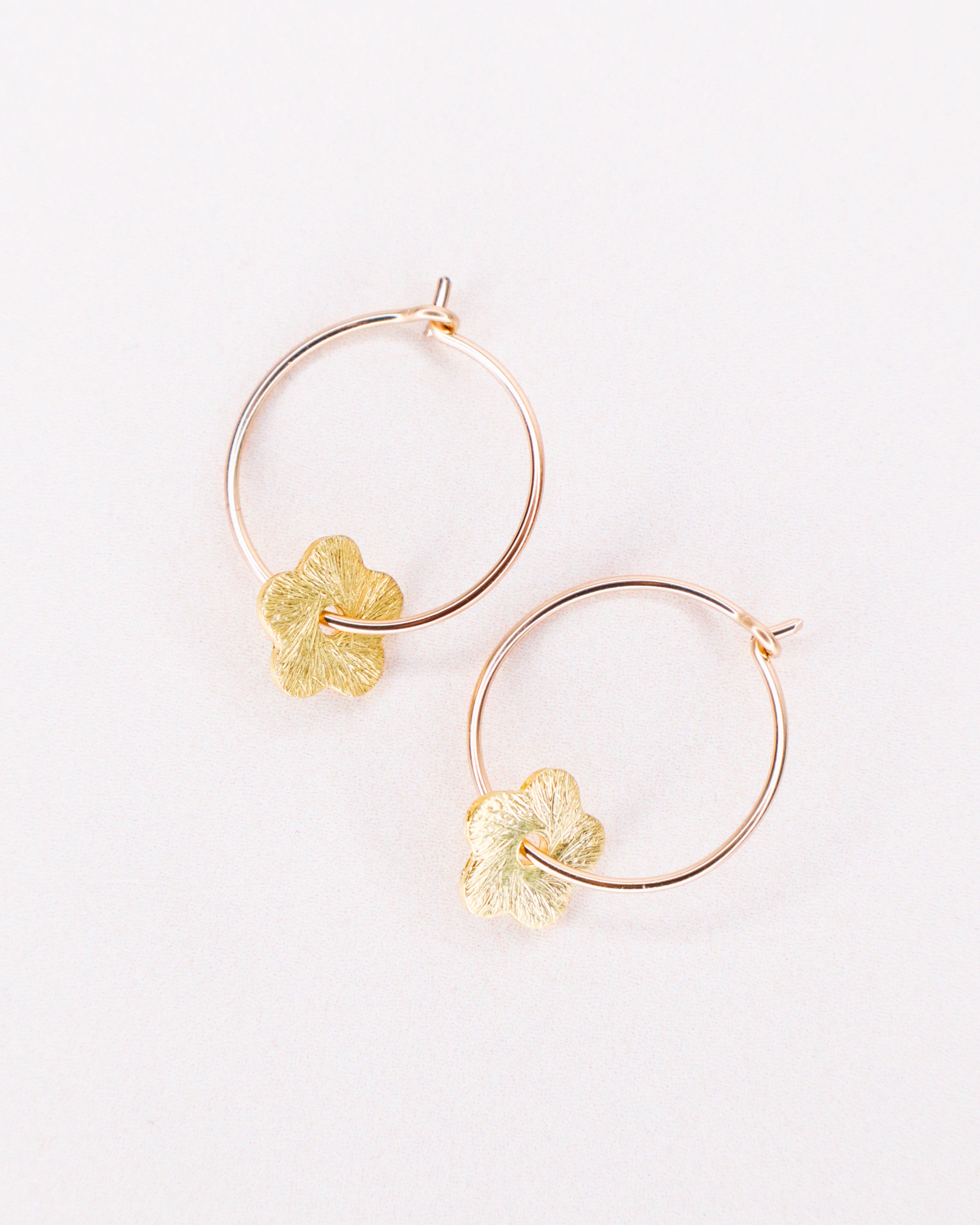 Fabriquées à partir d'or laminé 14ct ou d'argent 925, les pampilles fleurs sont brossées et texturées. Les boucles ont un diamètre de 2cm.