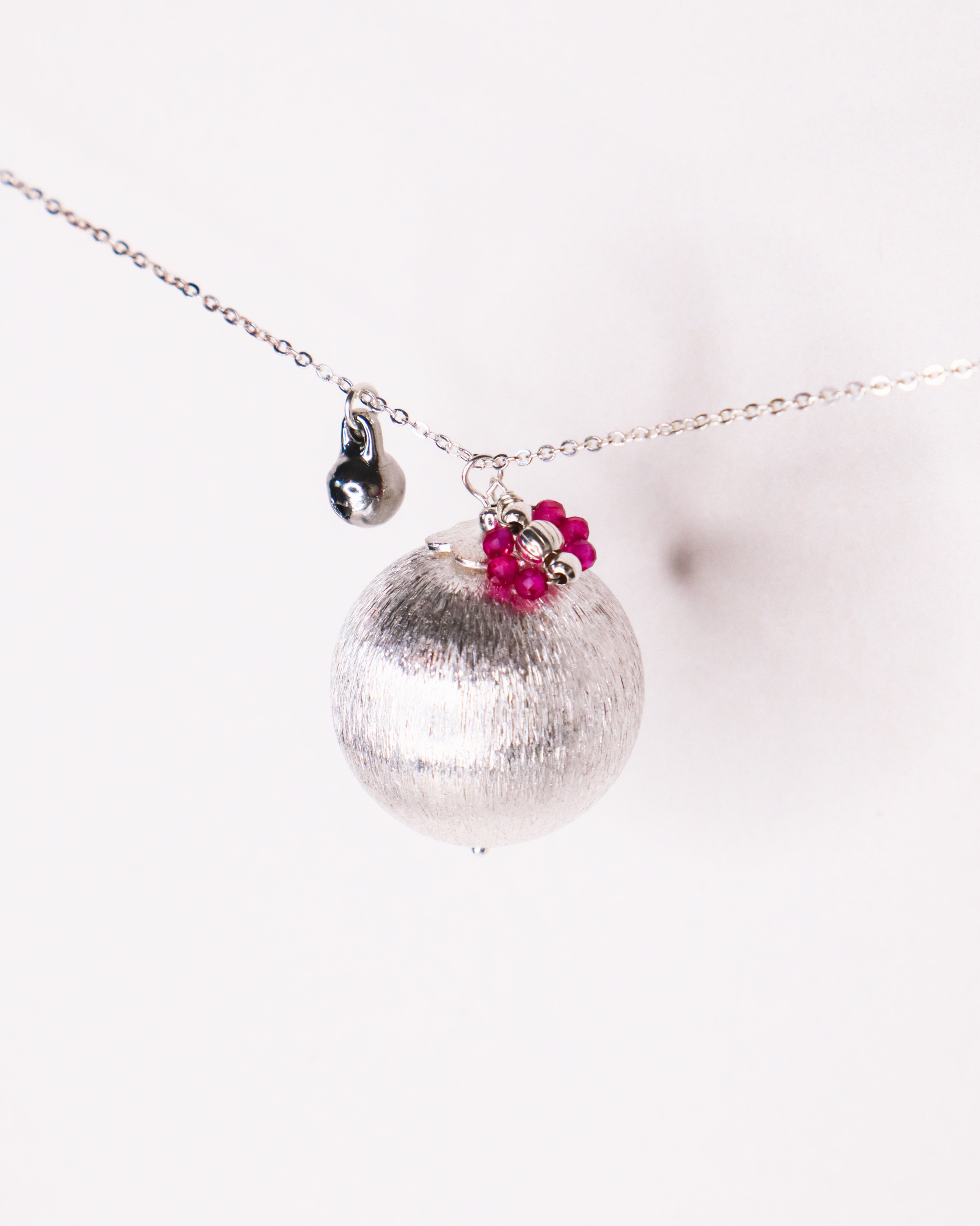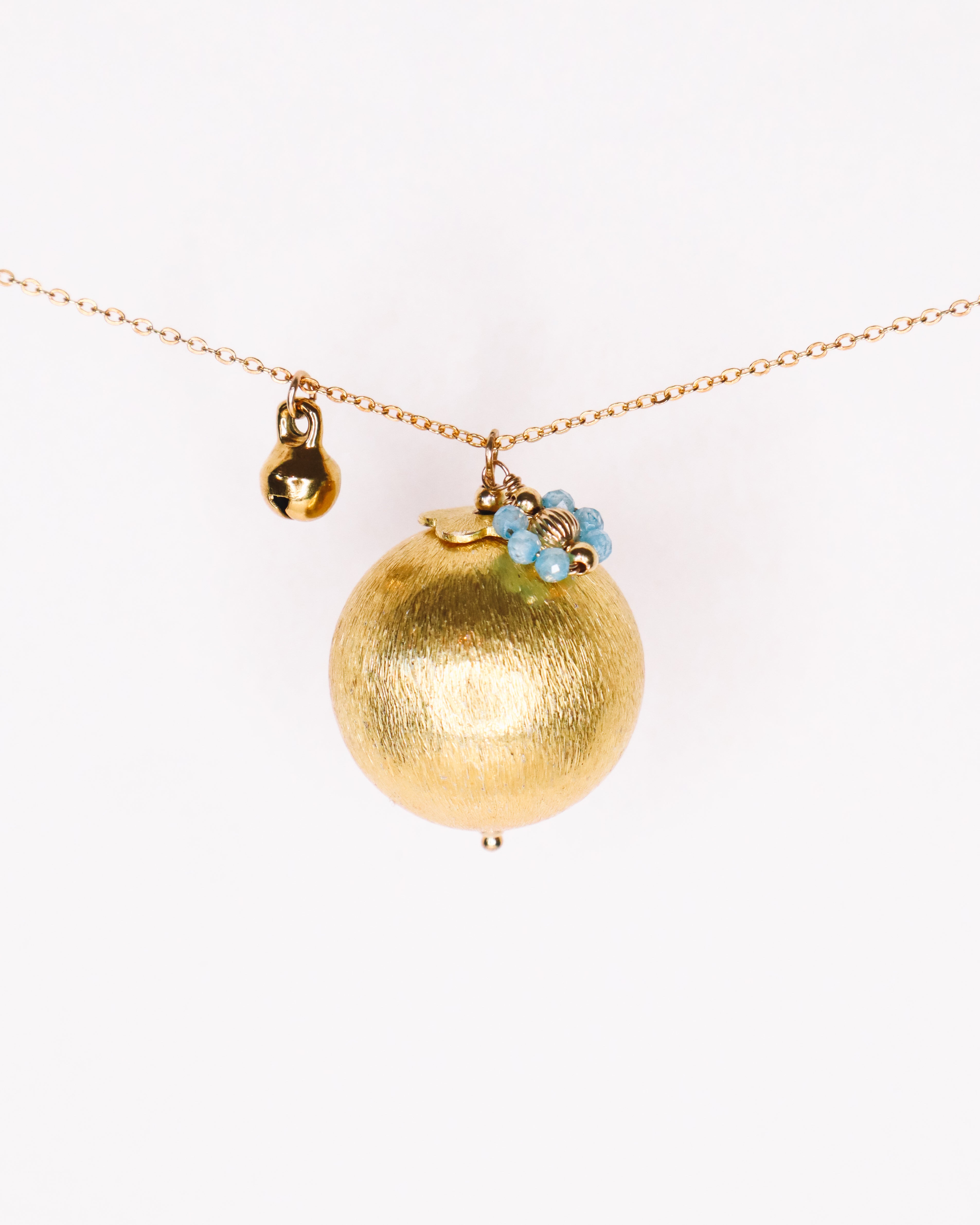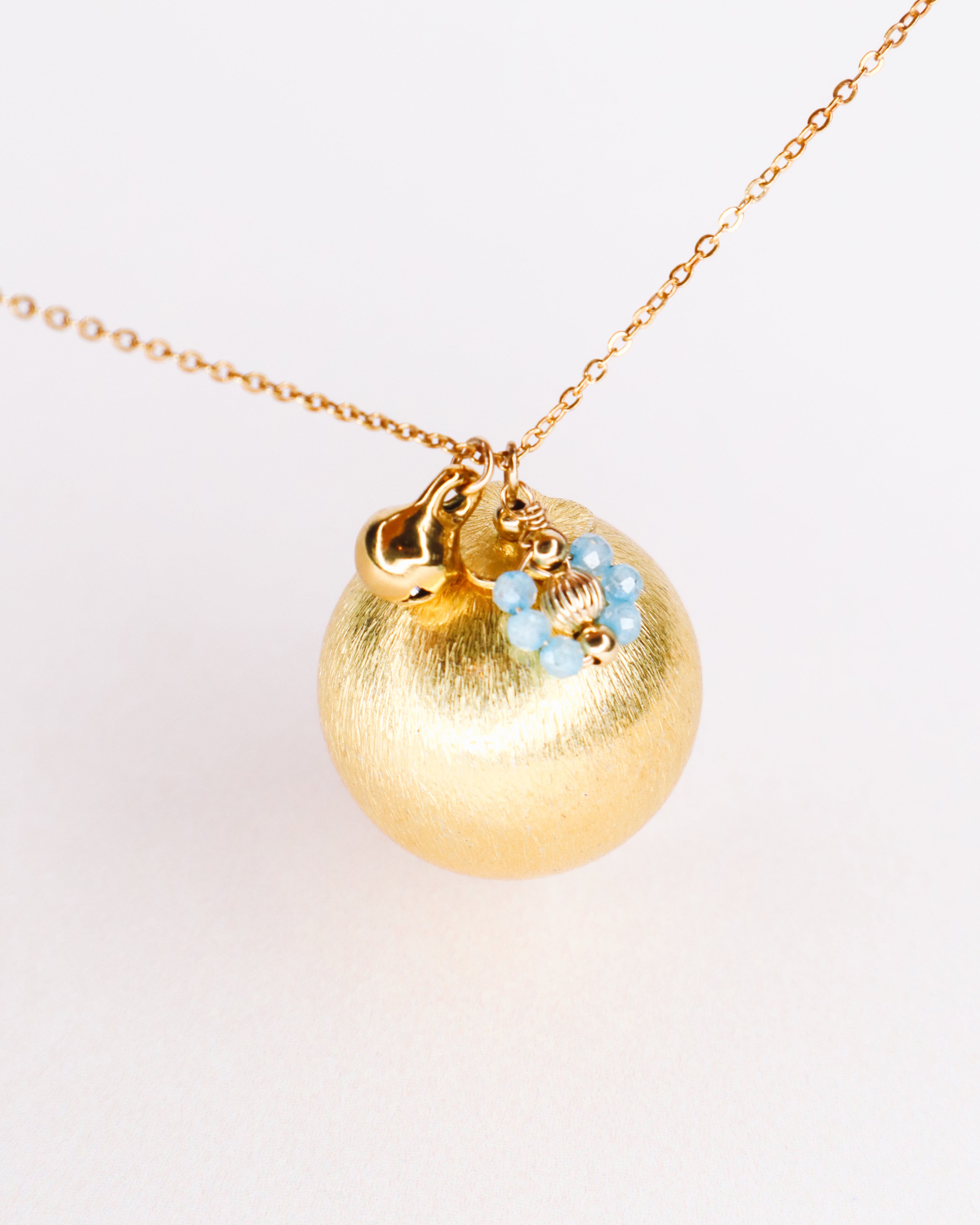 Le collier de 98cm de long, et pouvant s'ajuster jusqu'à 103cm, est conçu pour reposer sur le ventre arrondi d'une femme enceinte. Le pendentif roule au gré de vos mouvements et tinte légèrement avec le petit grelot et les différents éléments qui s'entrechoquent.