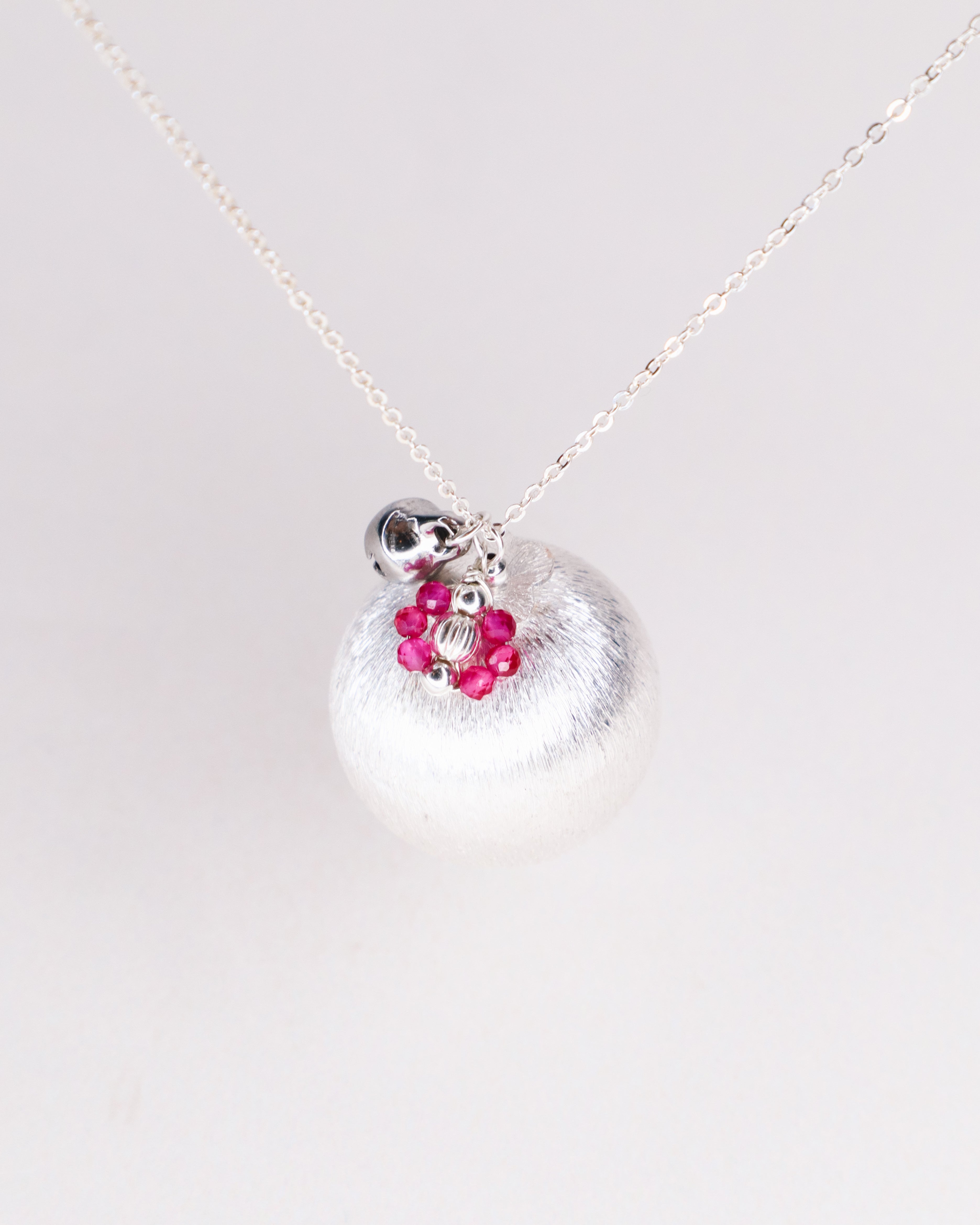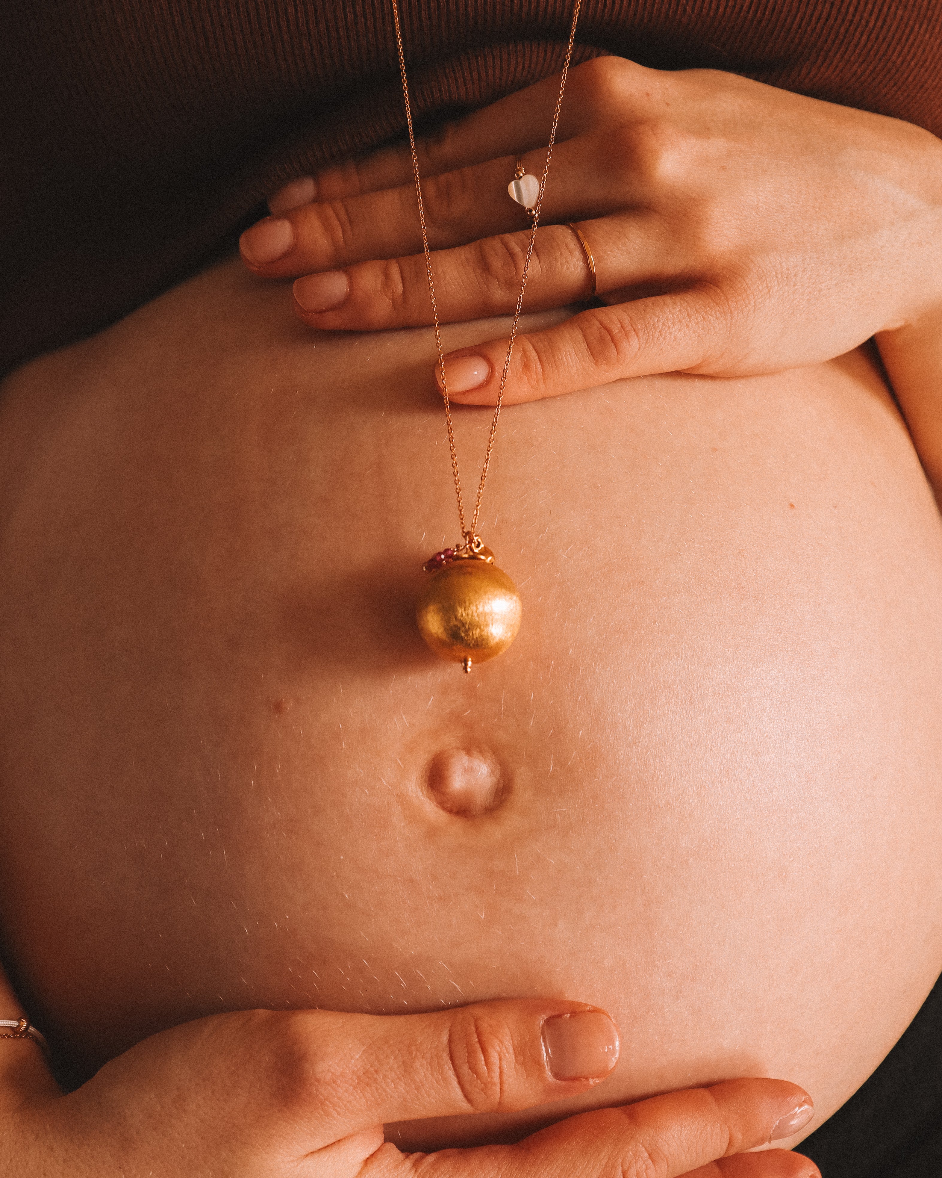 Notre bola de grossesse est façonné en or laminé 14ct ou en argent 925, personnalisable avec un pendentif fleuri serti de pierres précieuses de naissance.