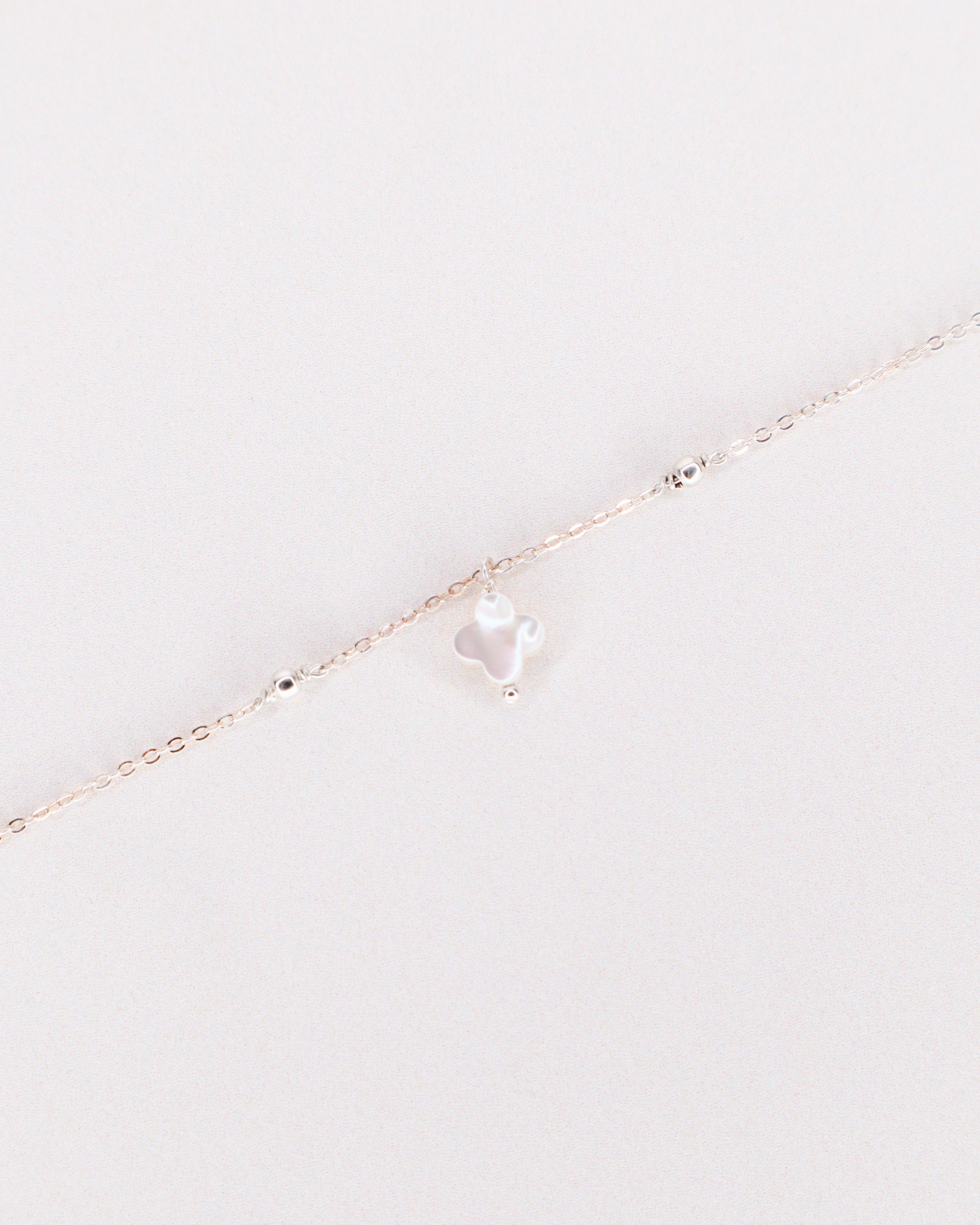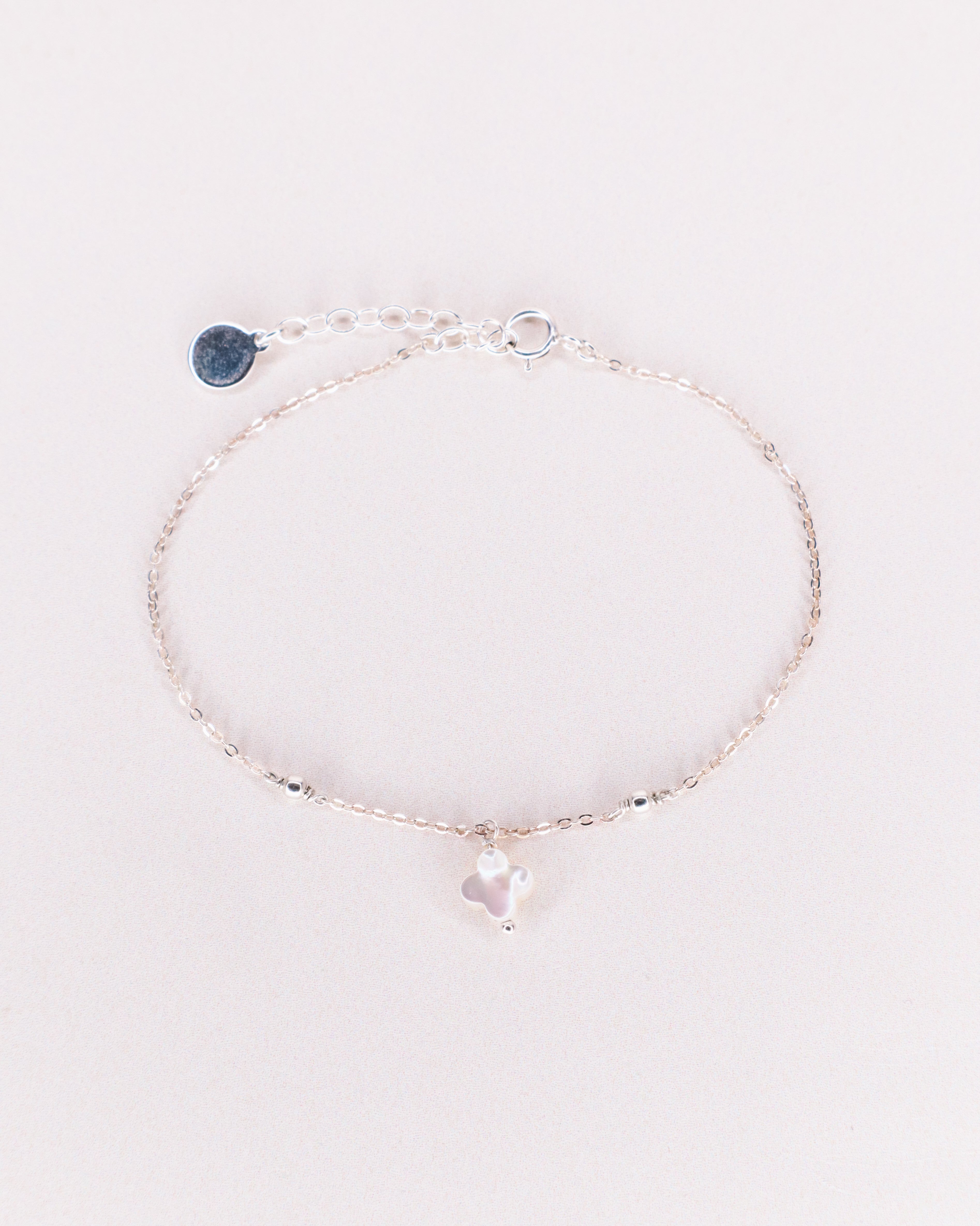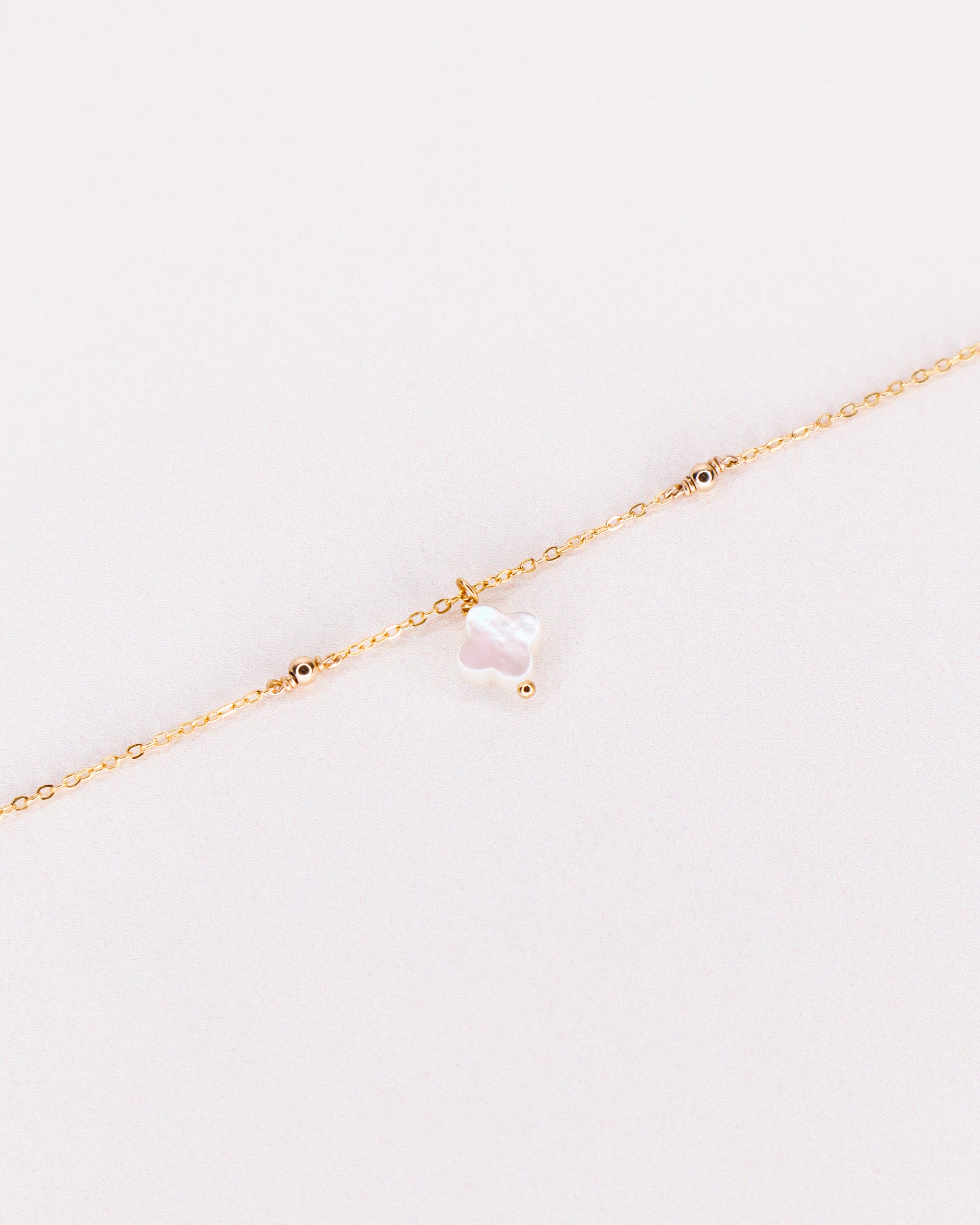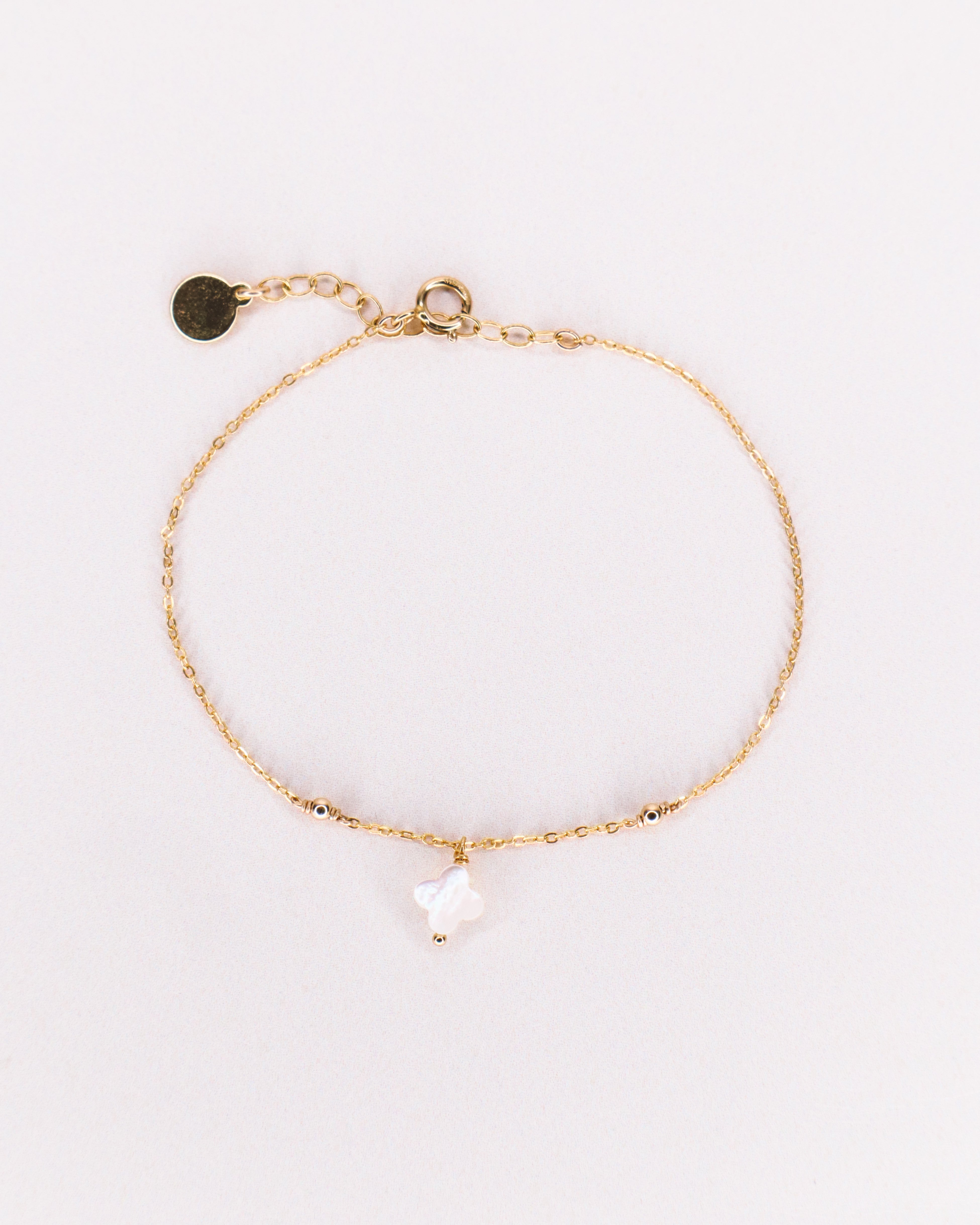 Découvrez le bracelet Fresia en or laminé 14ct ou argent 925 orné d'une pampille taille trèfle de nacre blanche.