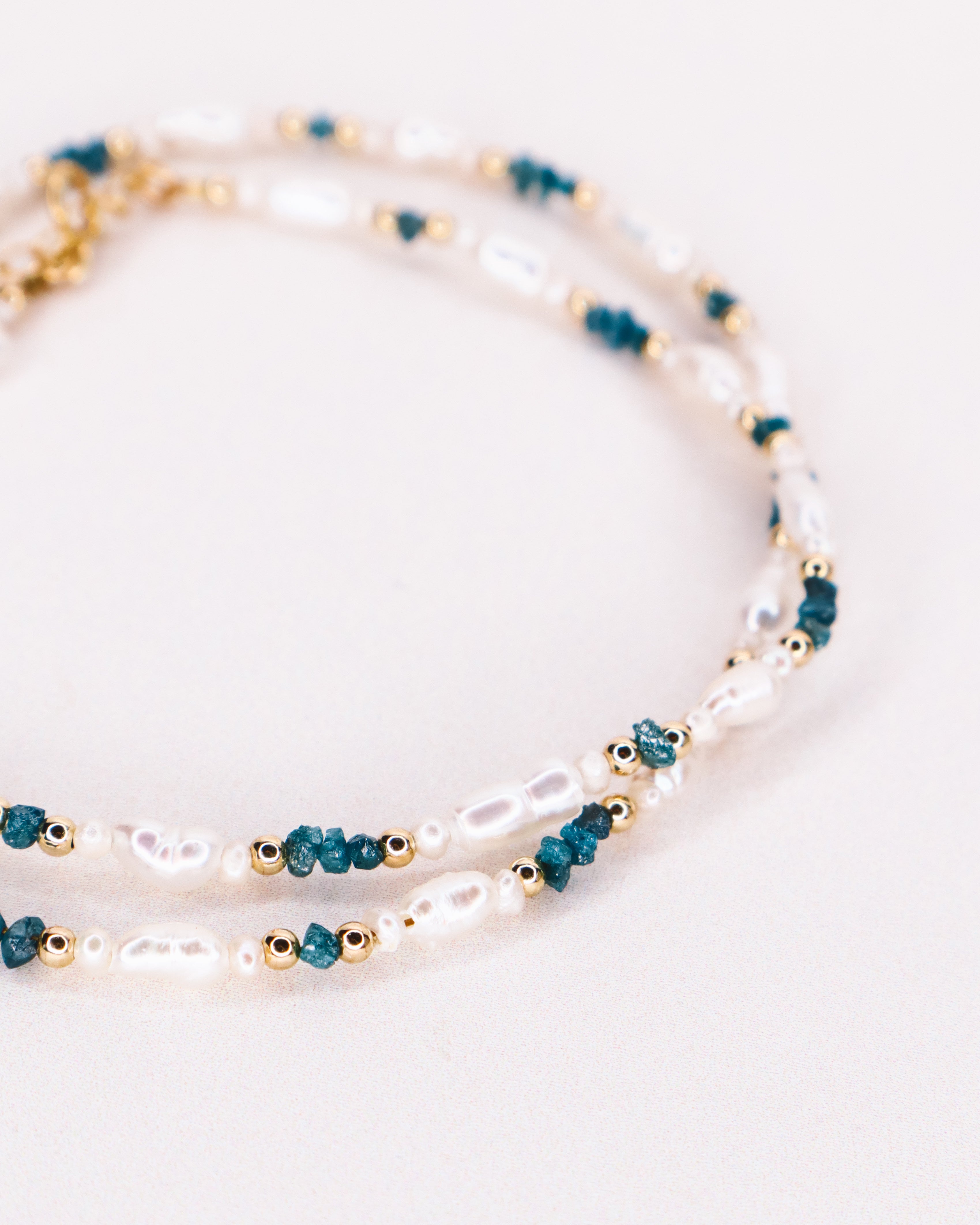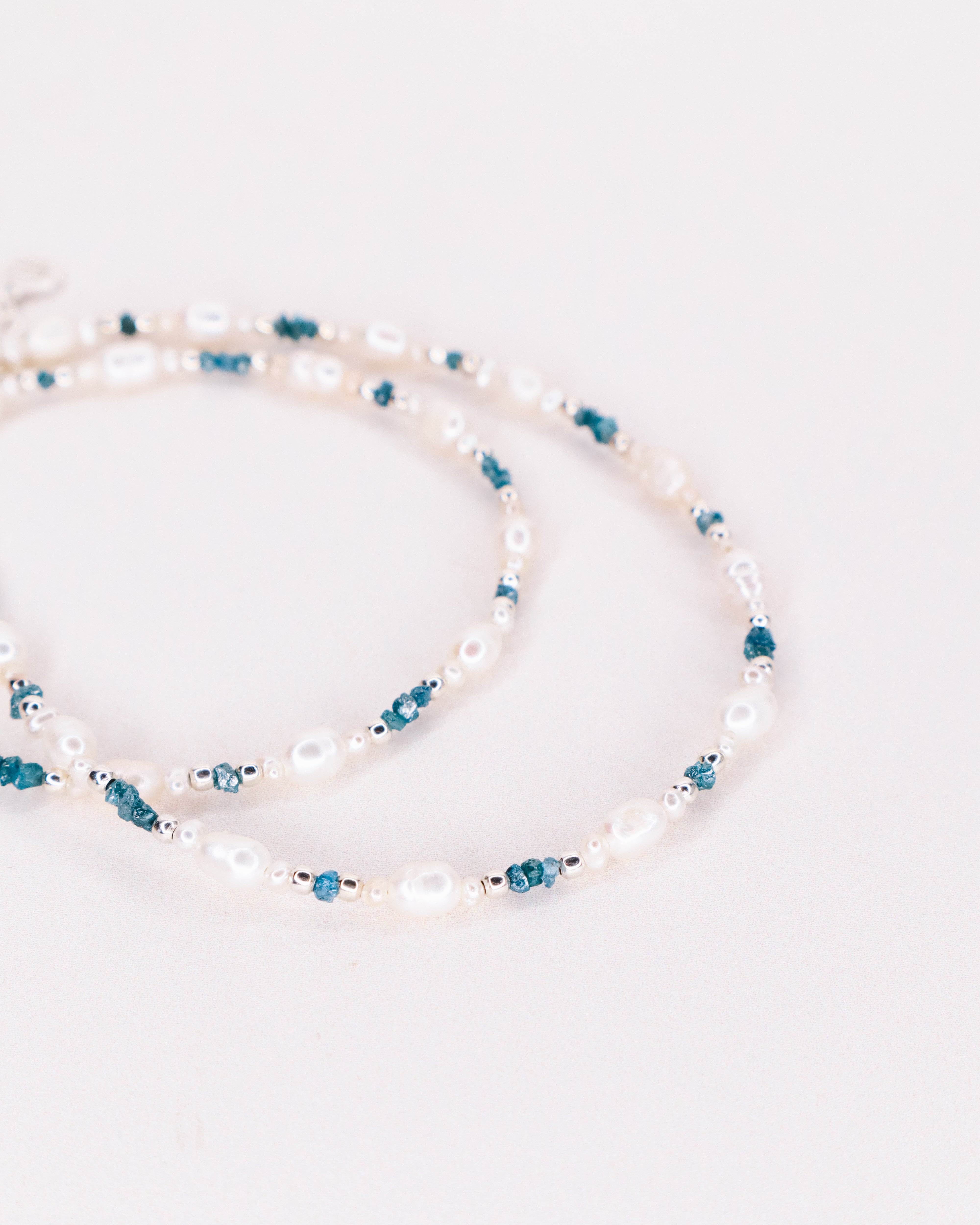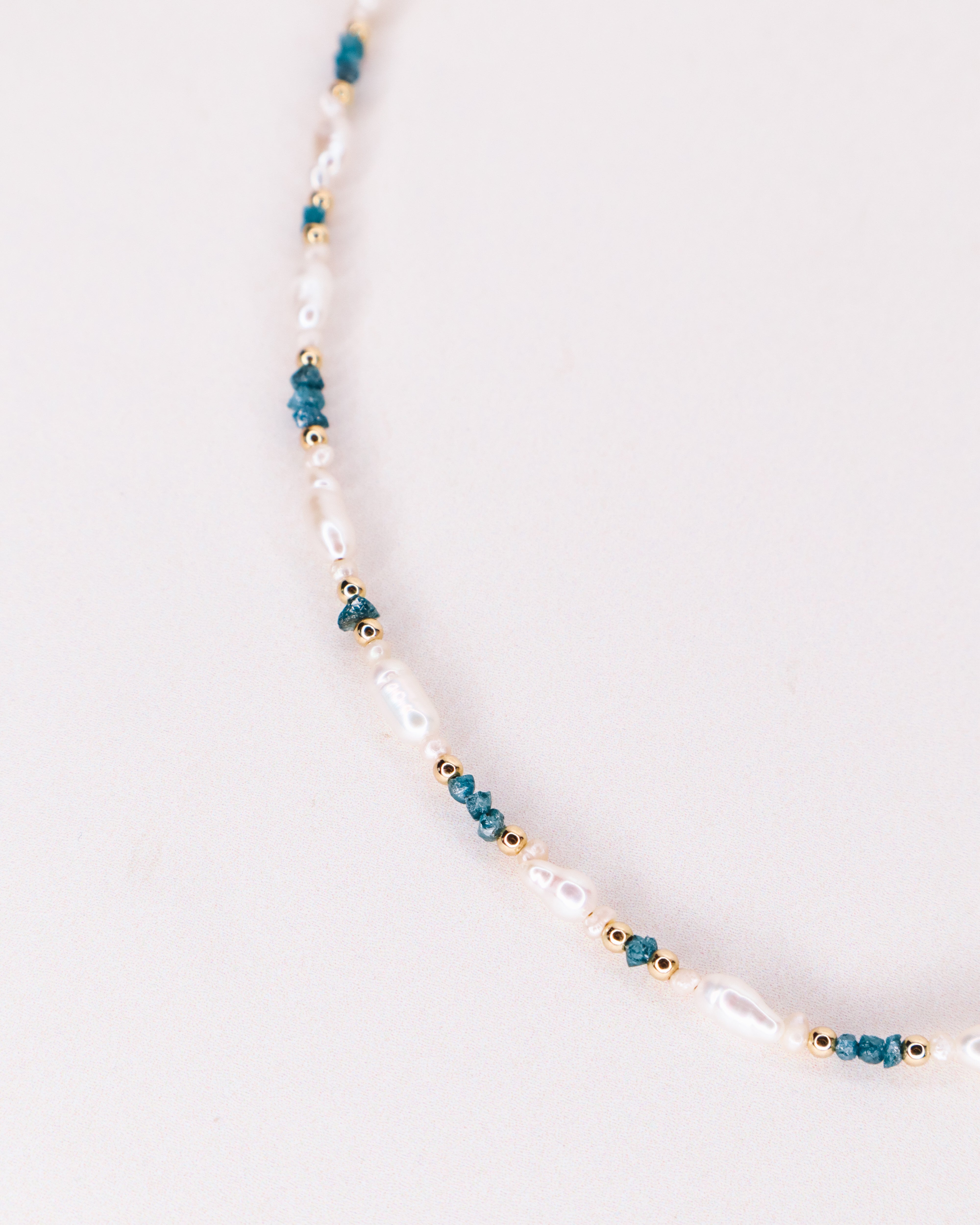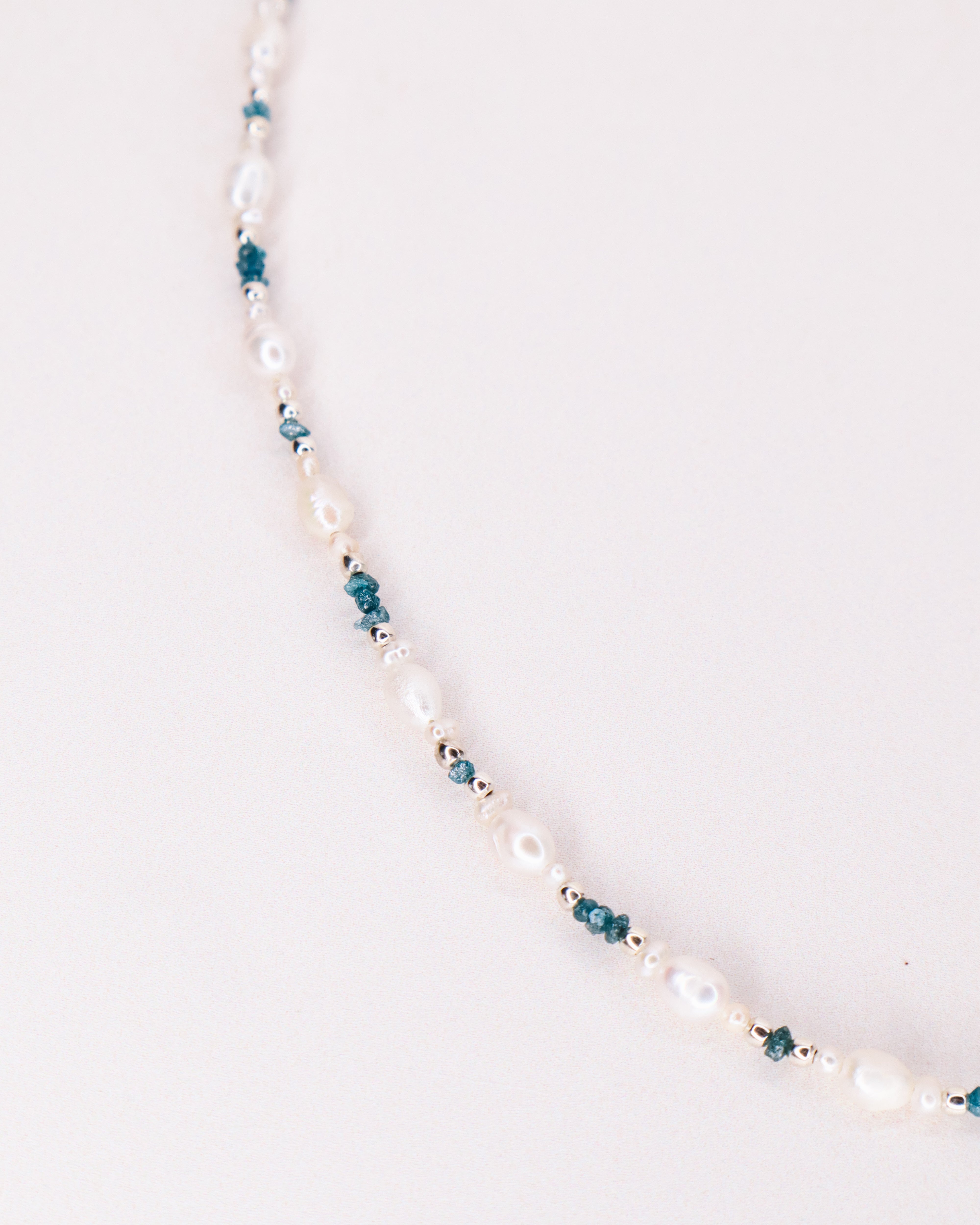 Son enfilage de perles de culture et de pierres de diamants bleus bruts apporte élégance et originalité.