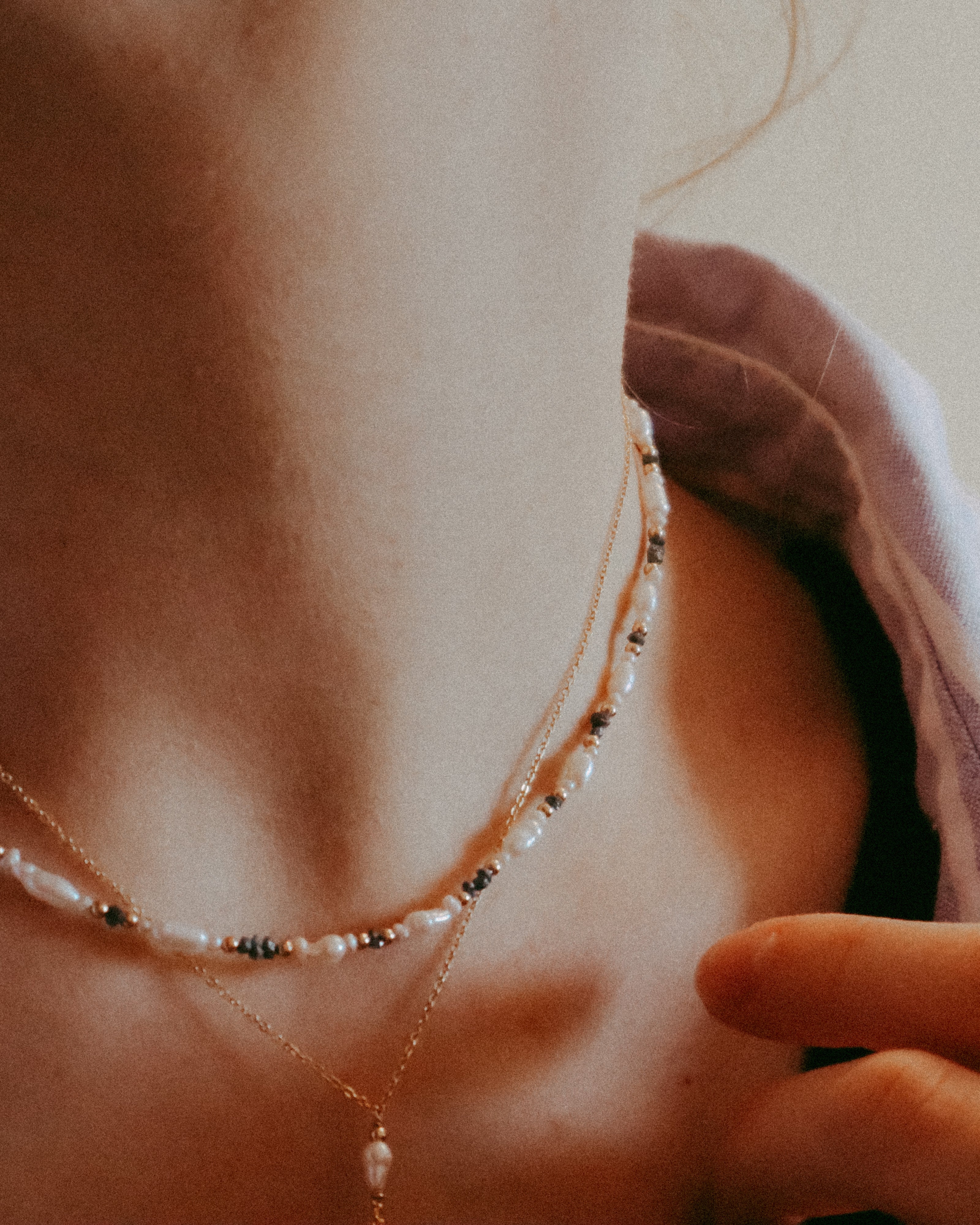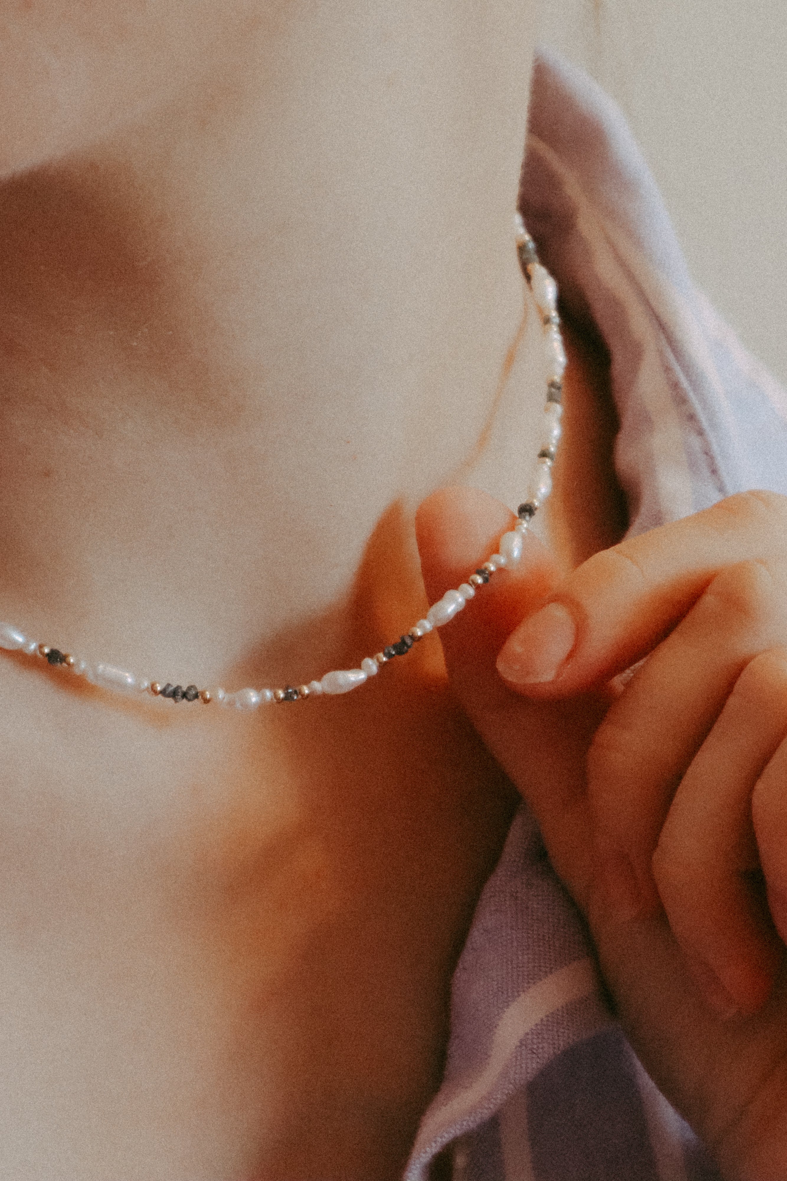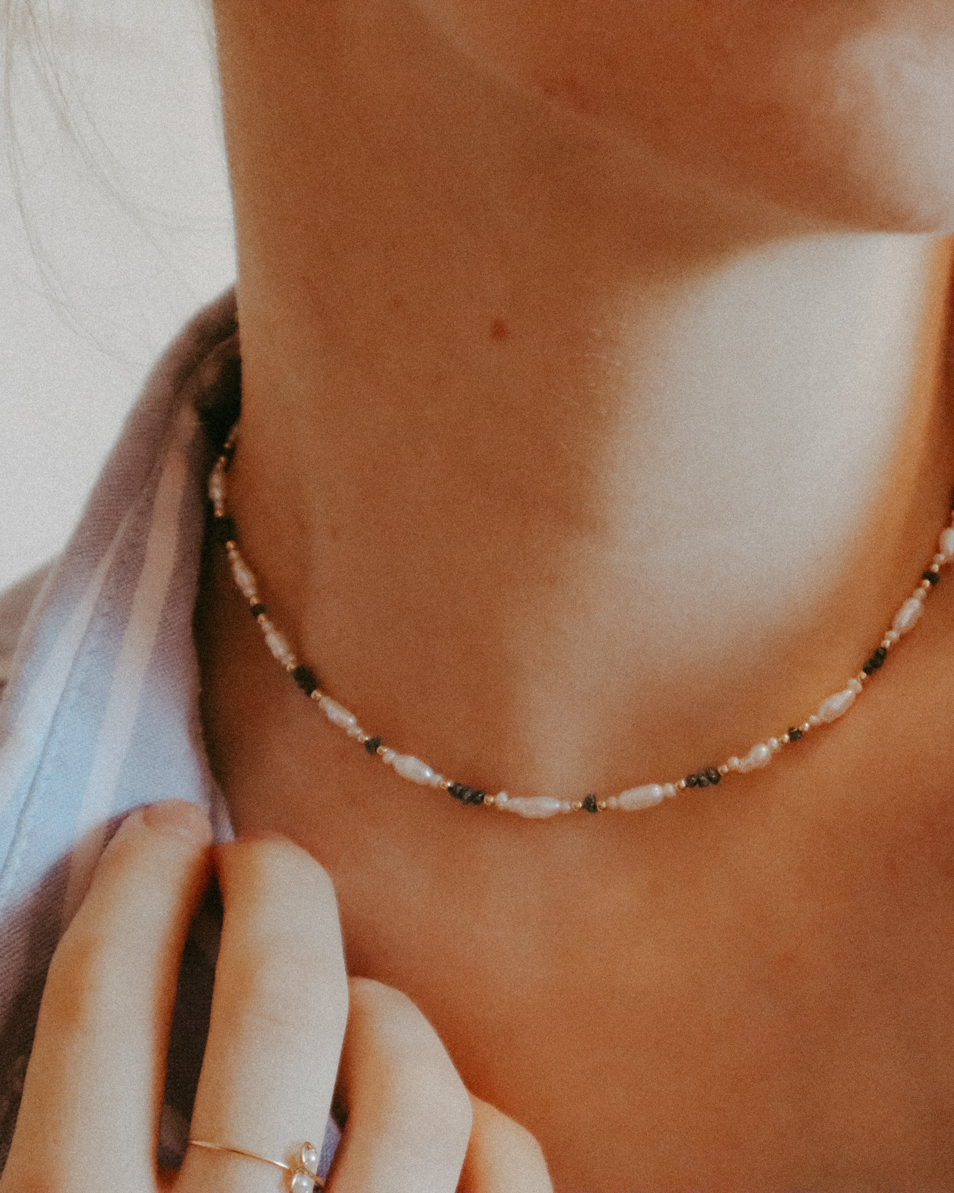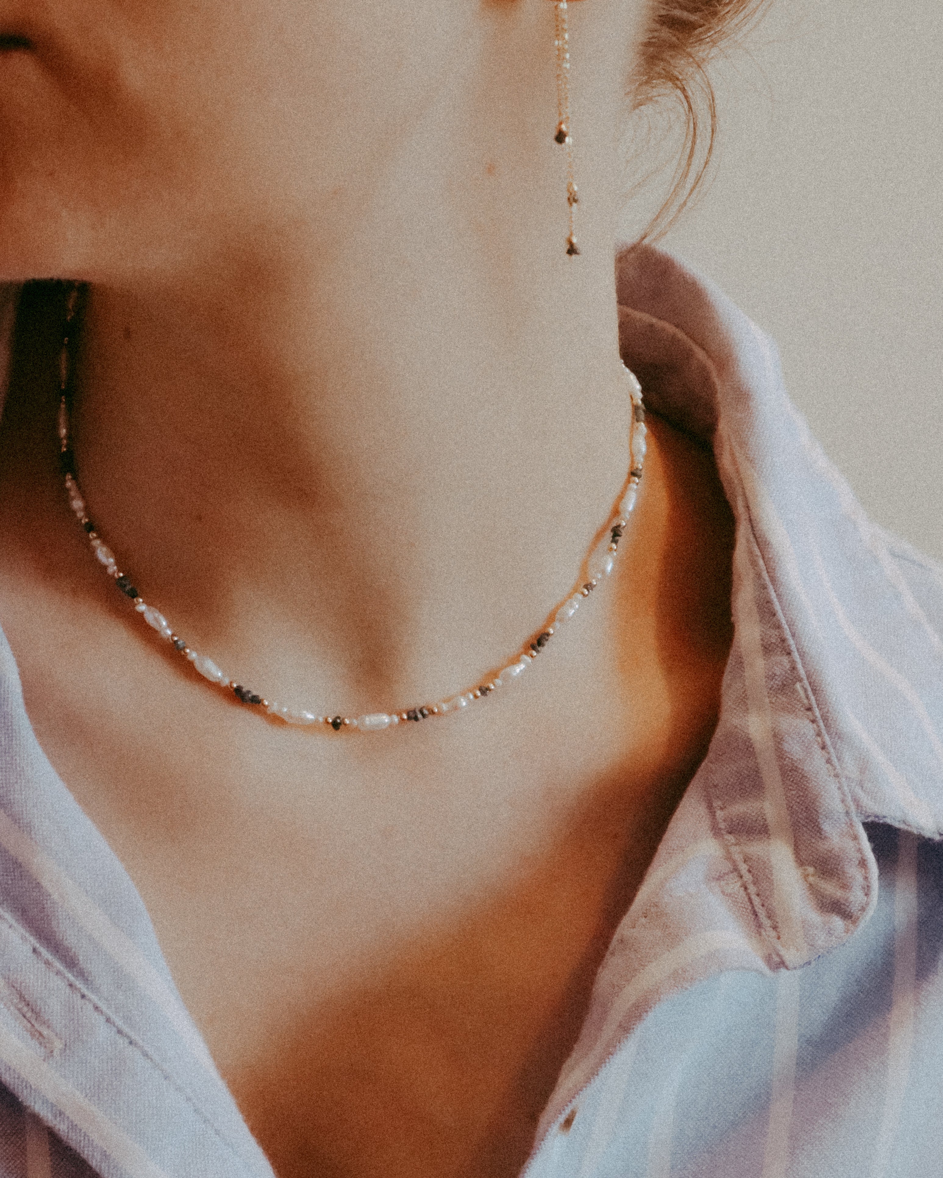 Découvrez notre collier Lyséa, ras de cou de perles en or laminé 14ct ou en argent 925.