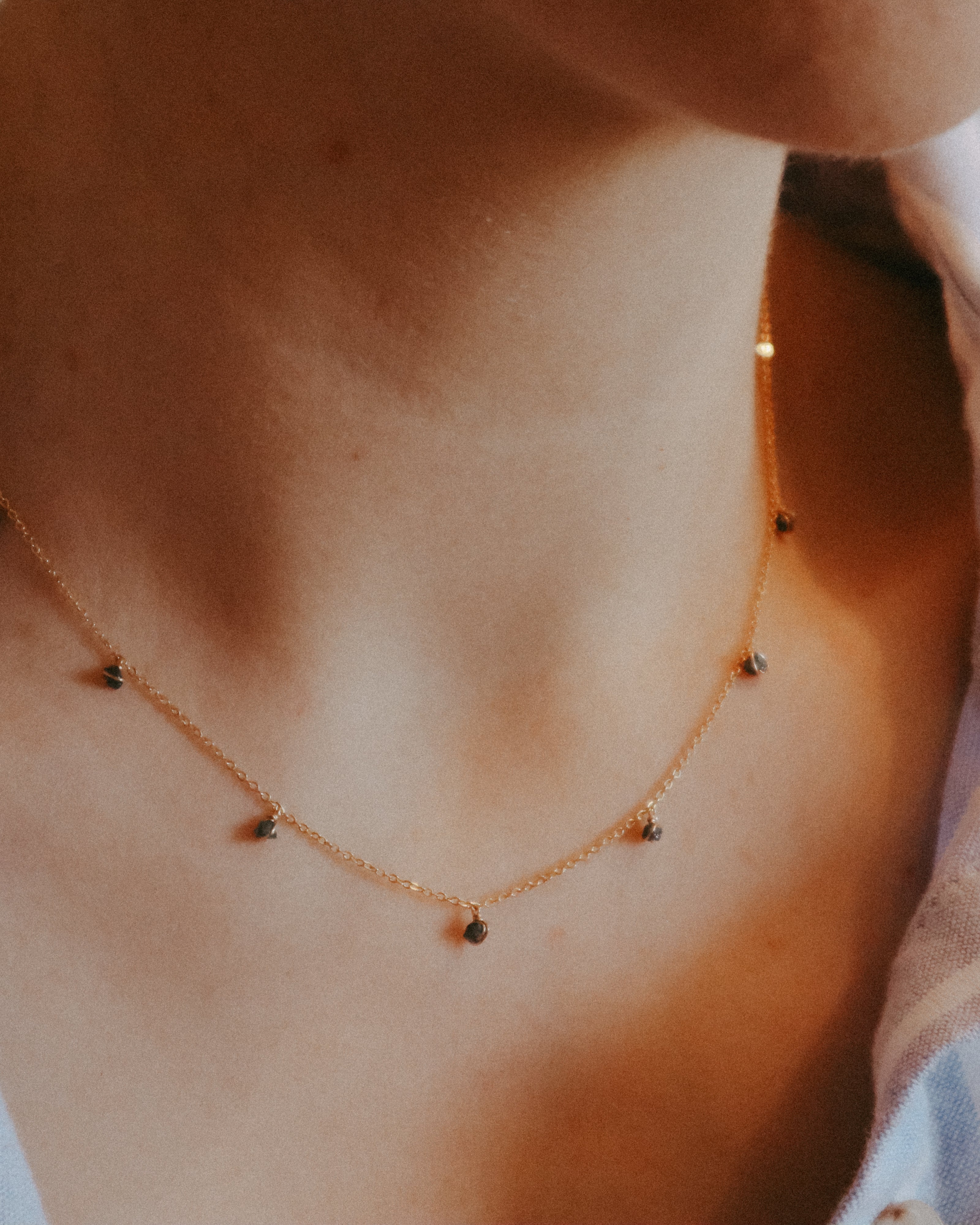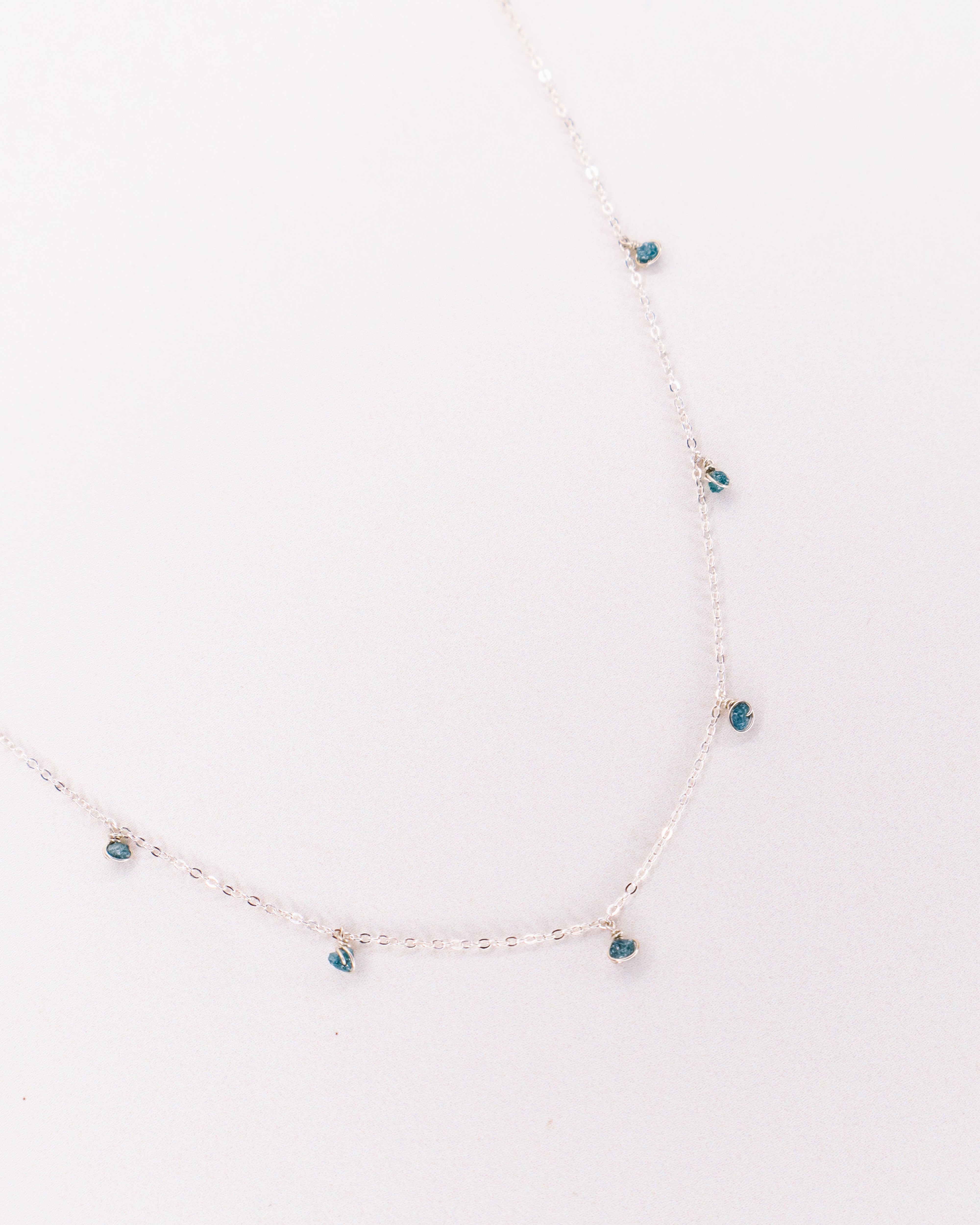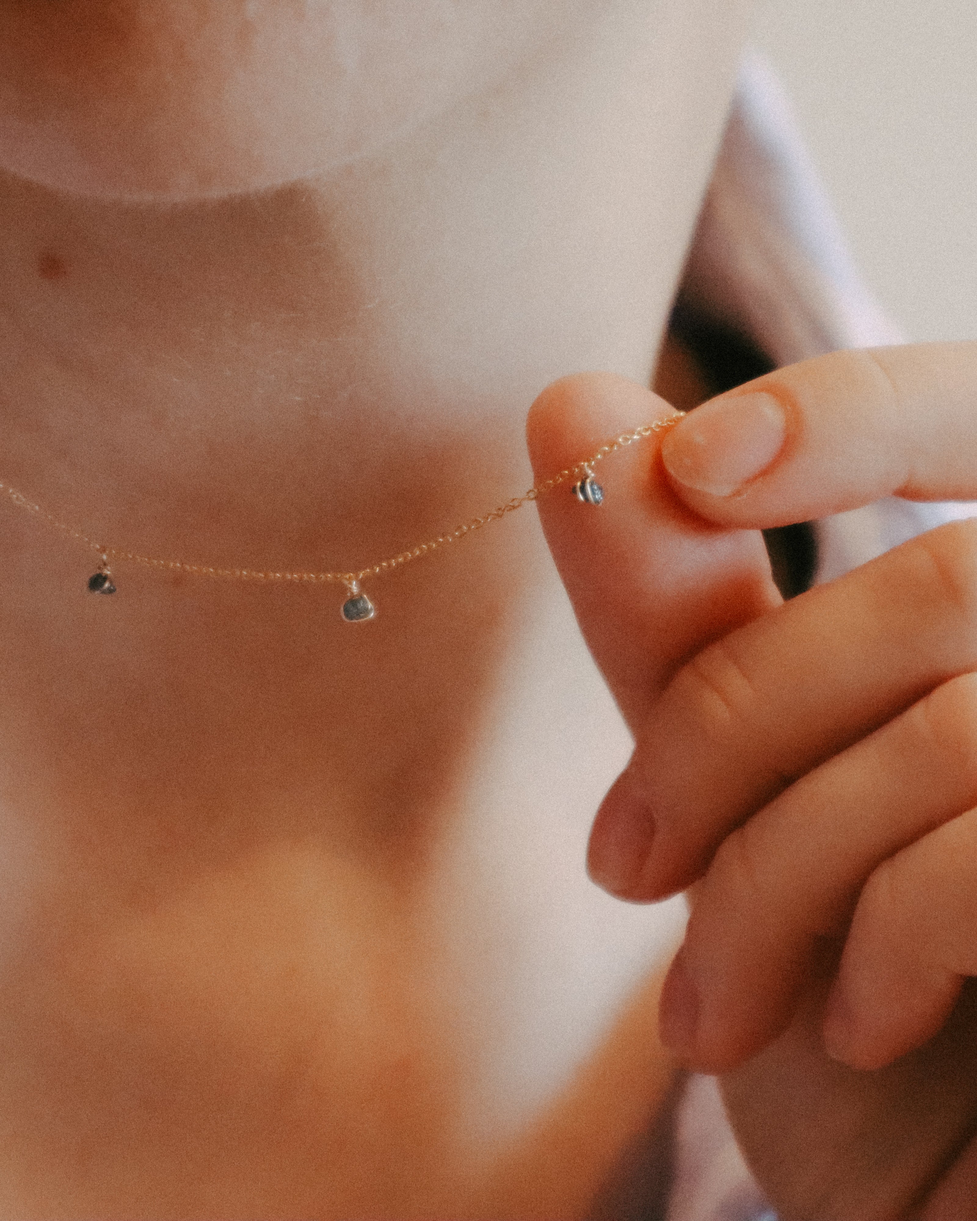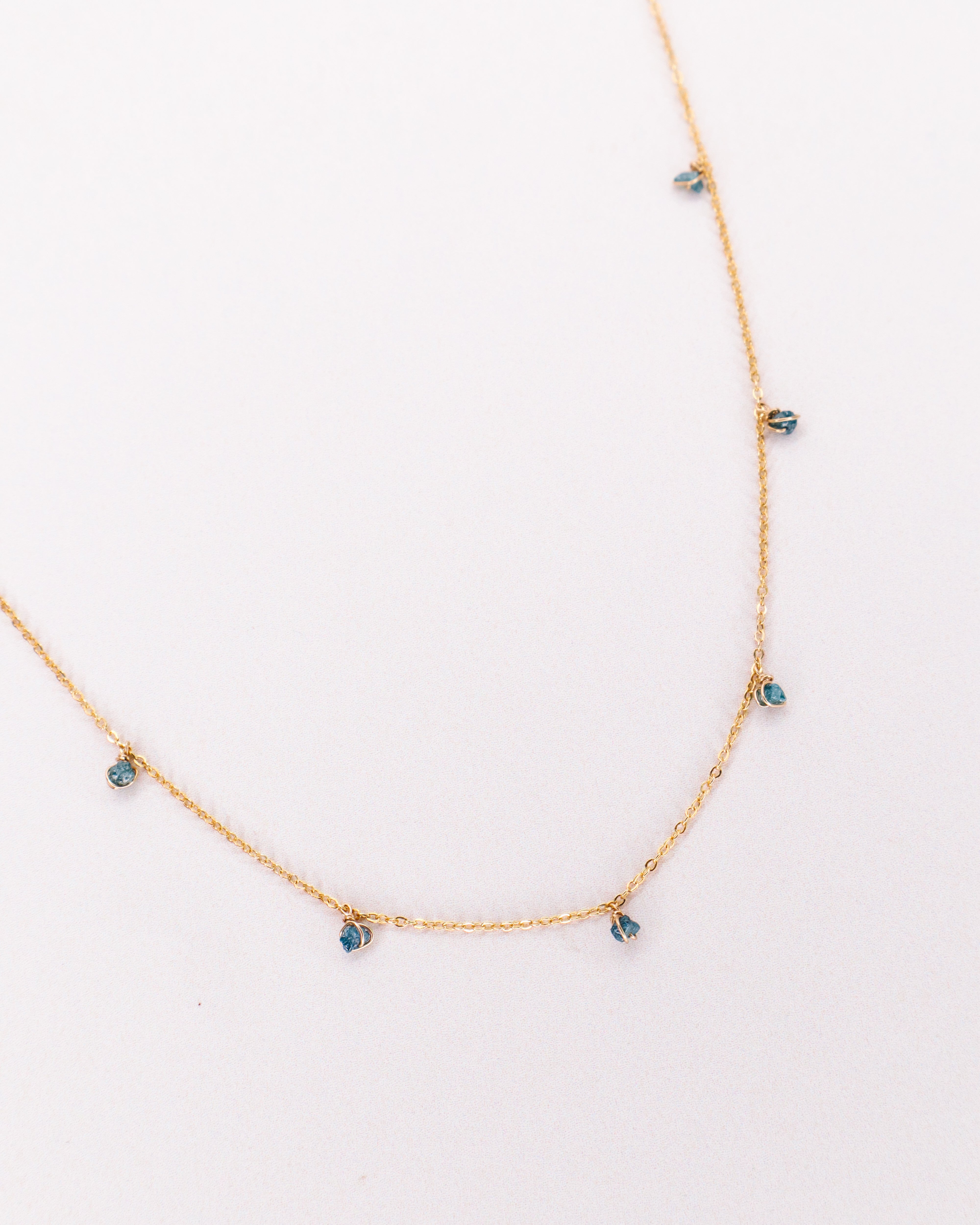Découvrez Nova, le collier en or laminé de 14 carats ou en argent 925 orné de pampilles de diamants bruts bleus.