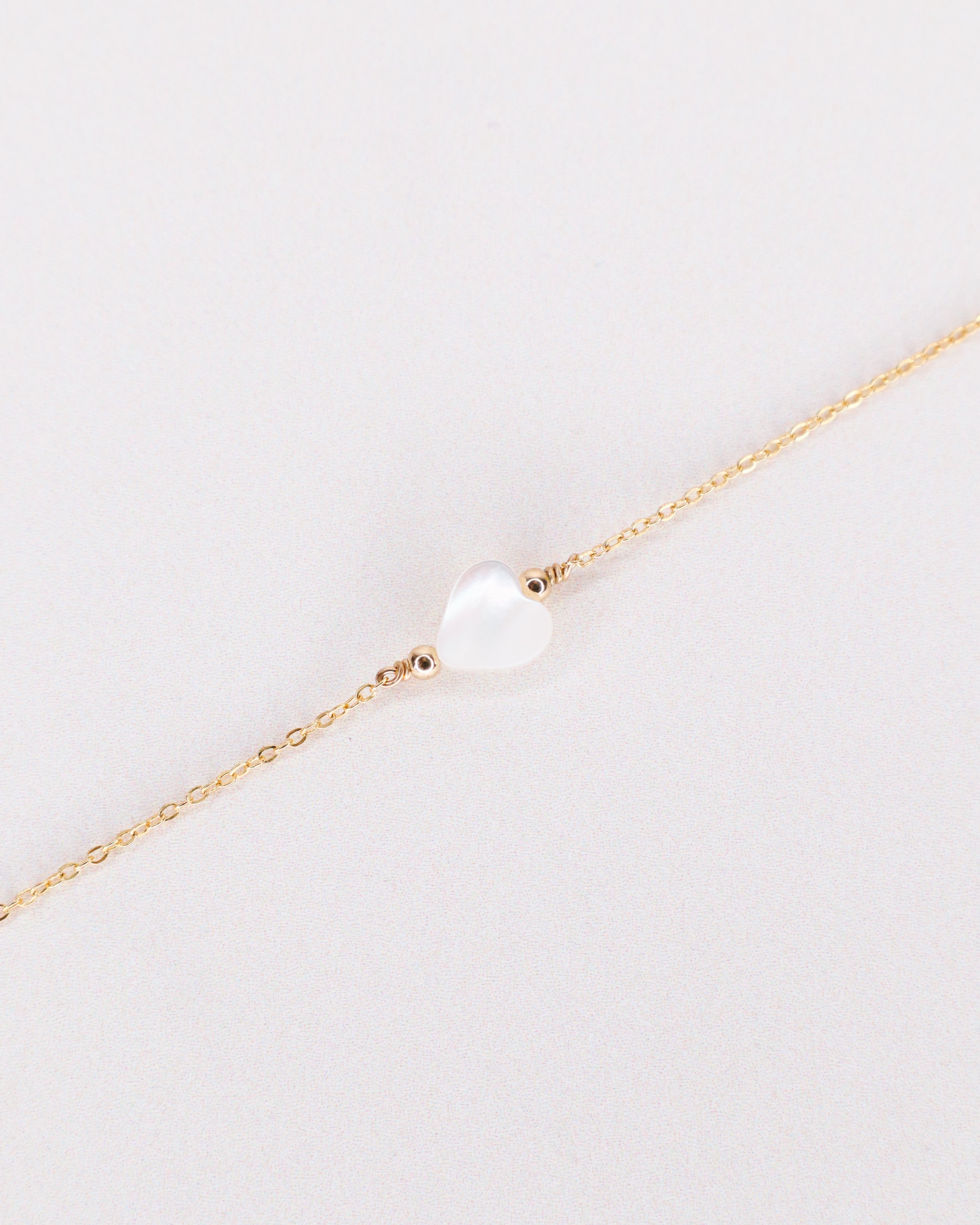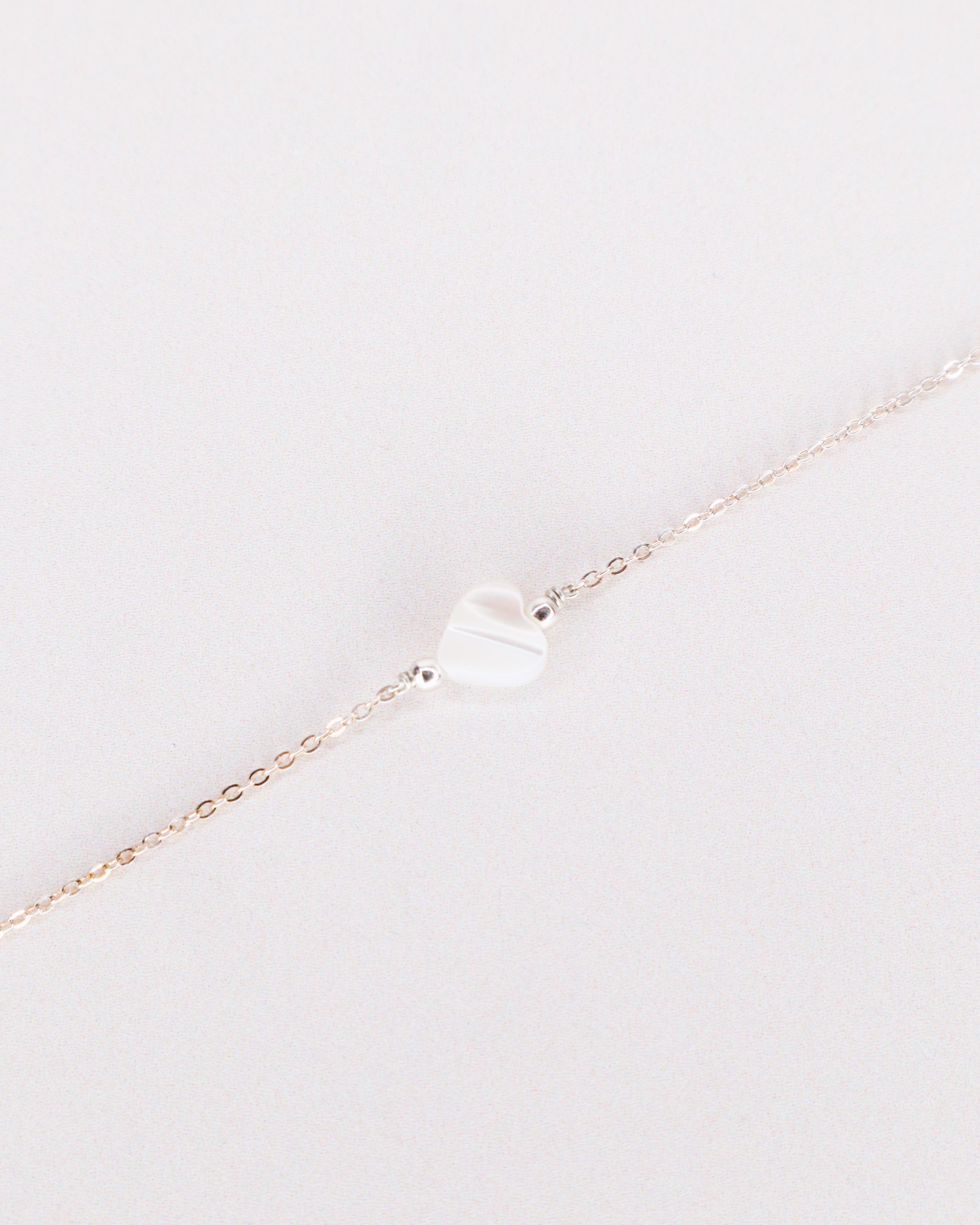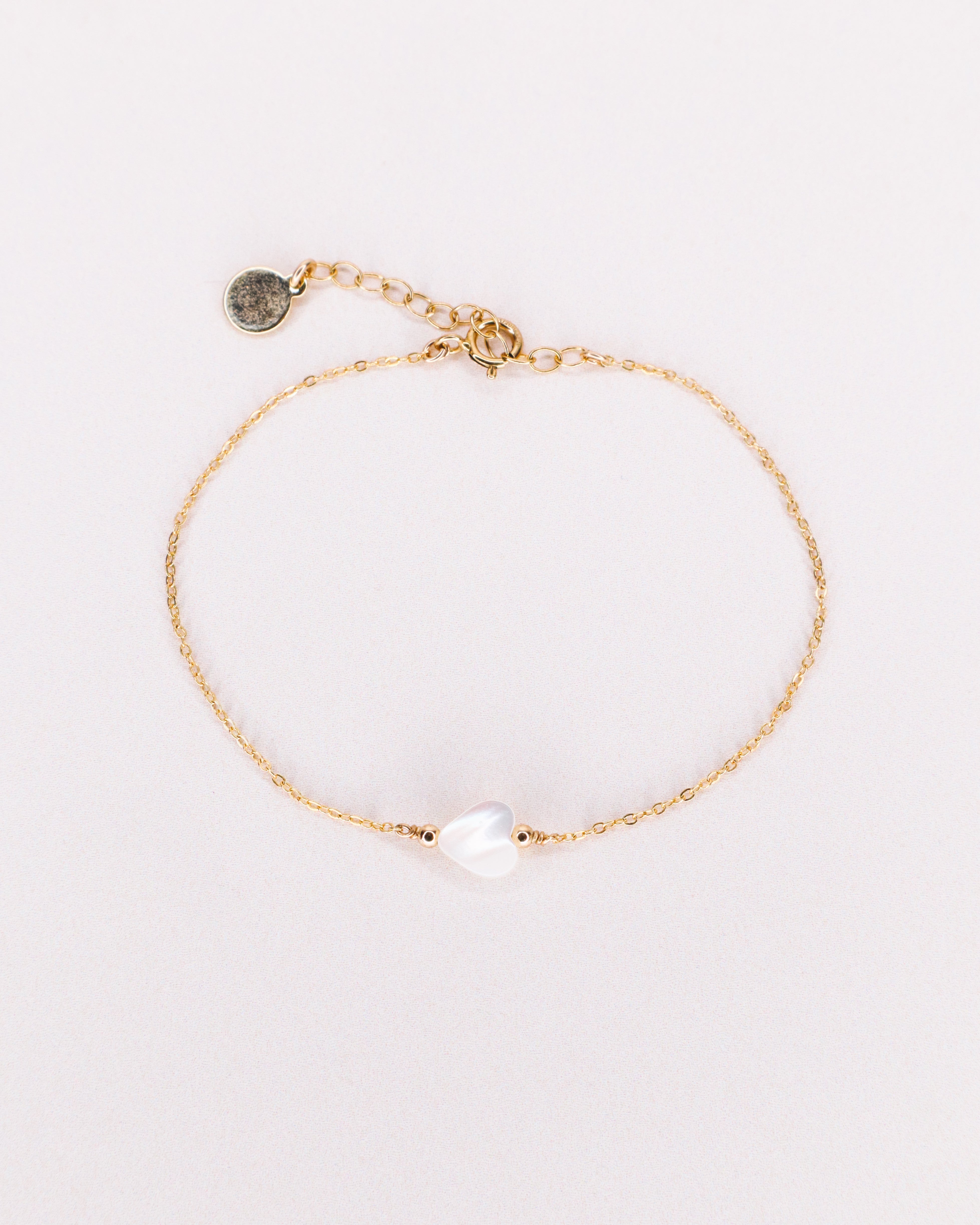 Découvrez le bracelet Rose en or laminé 14ct ou argent 925 incrusté d'un pierre de nacre en forme de cœur.