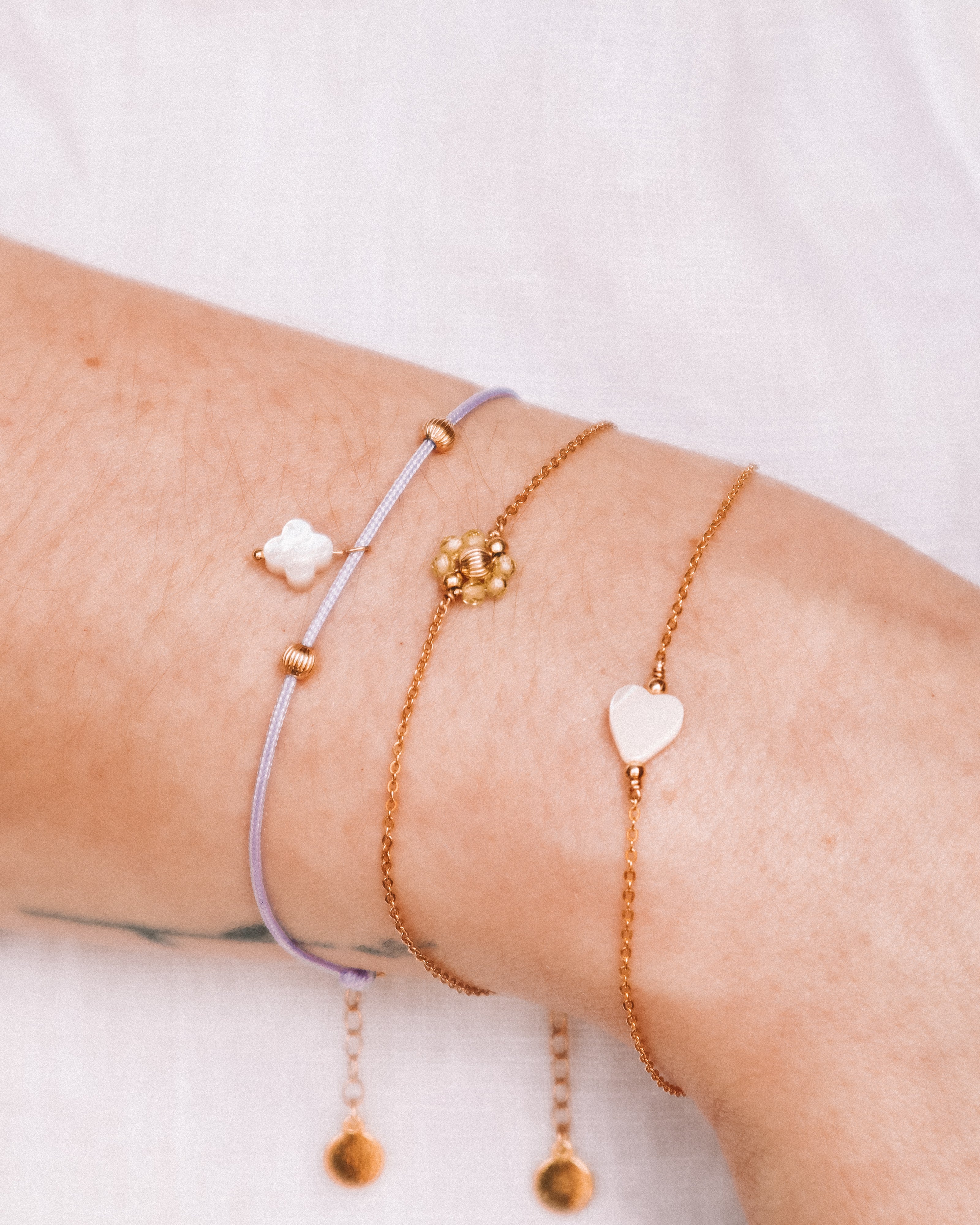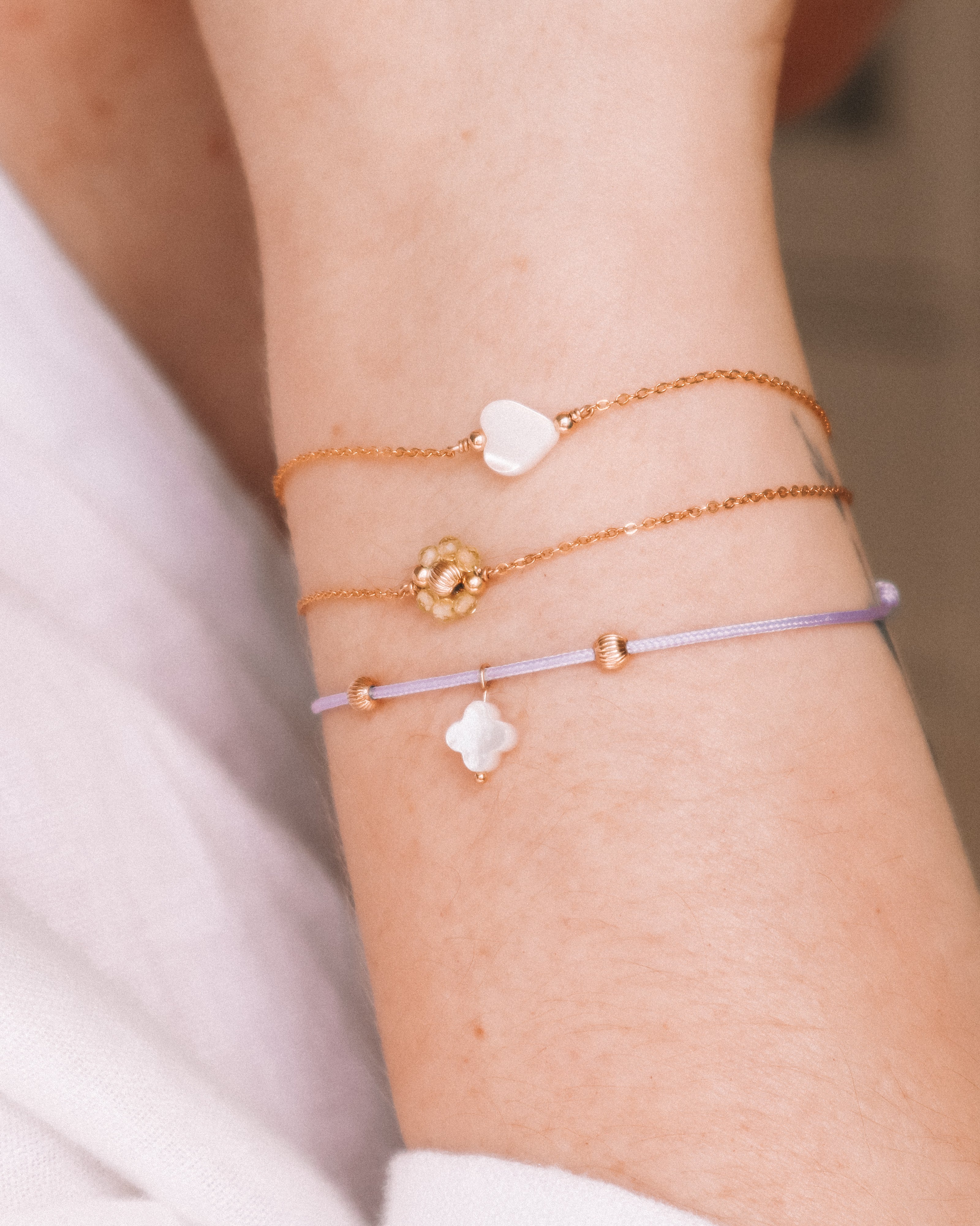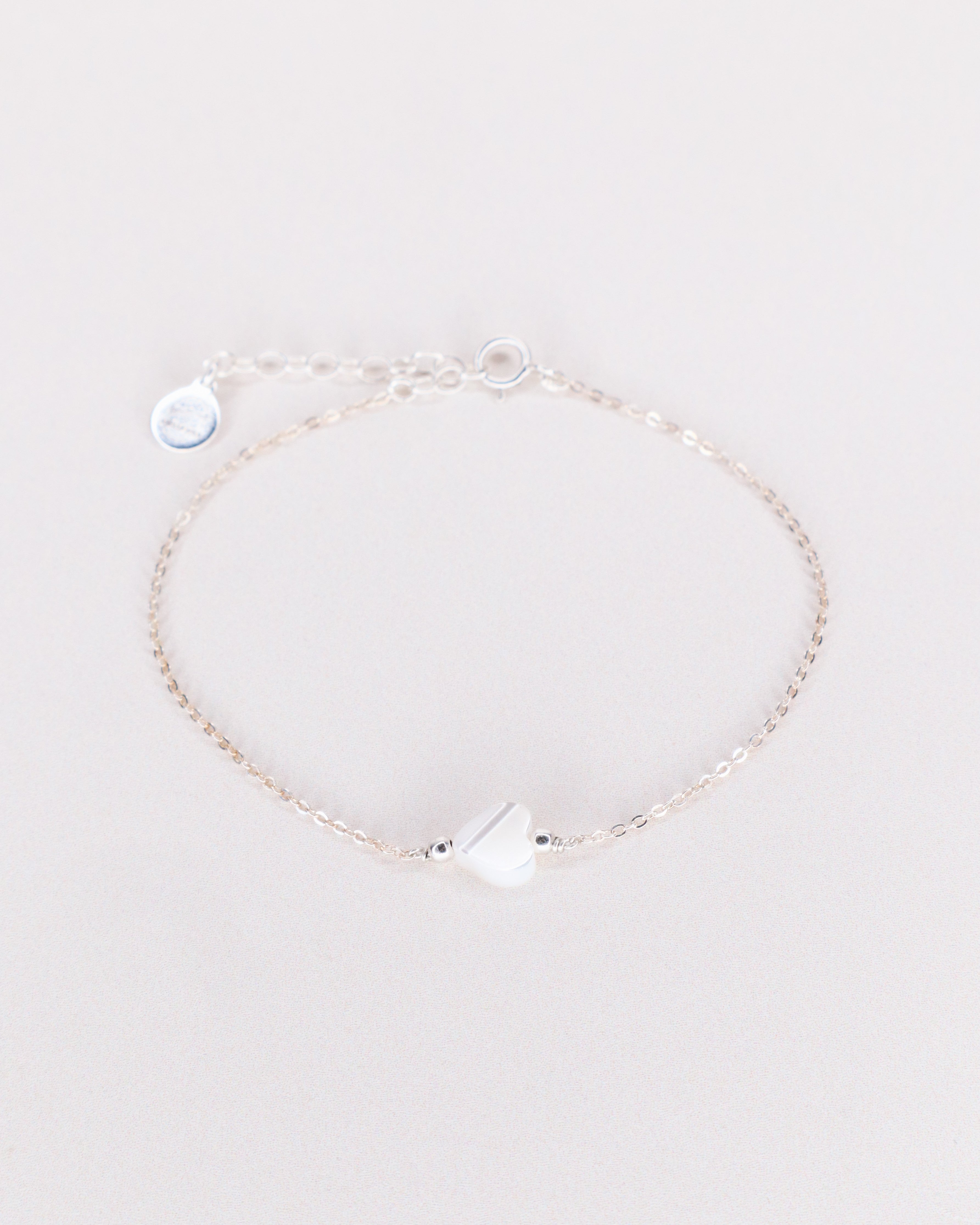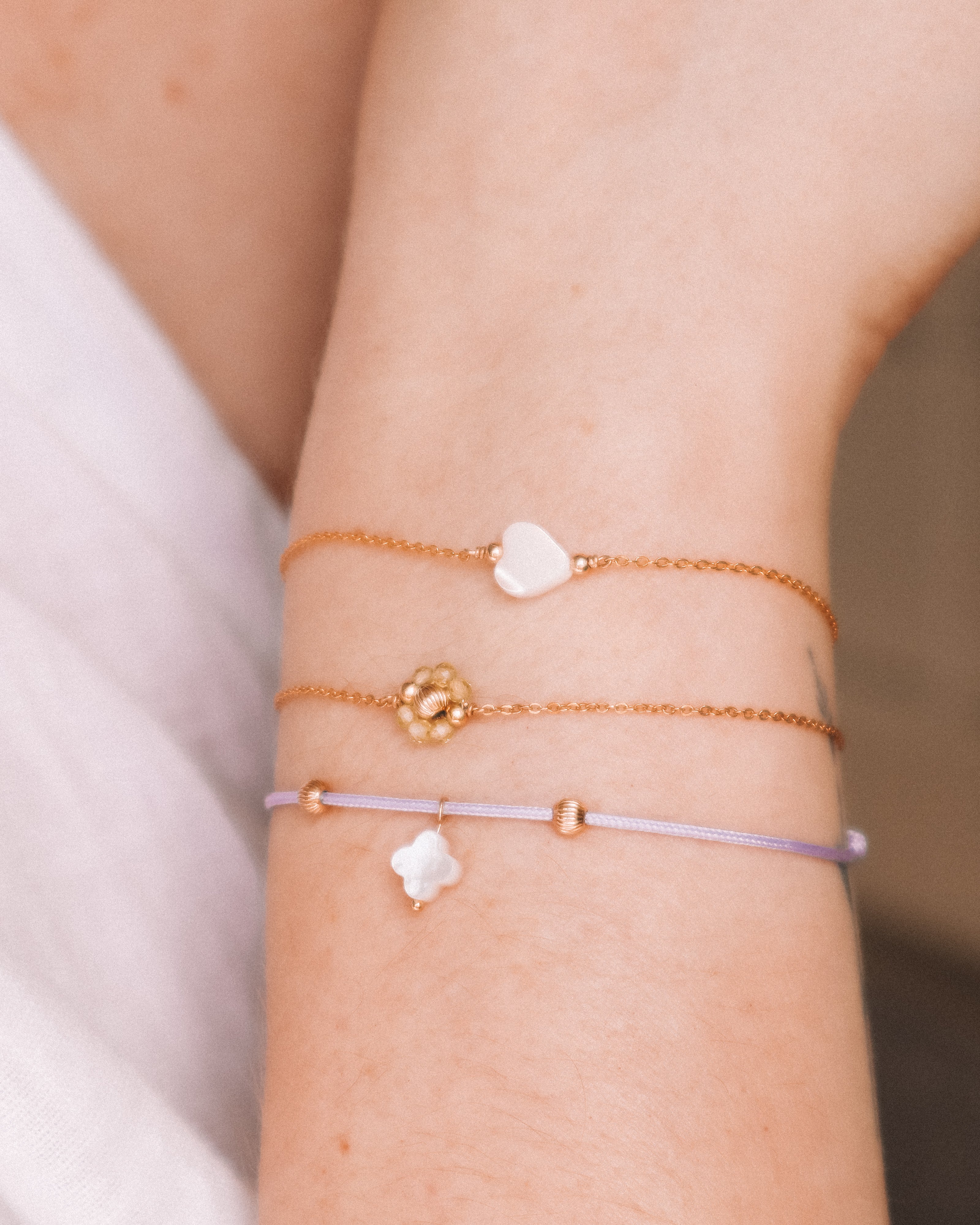 Découvrez le bracelet Rose en or laminé 14ct ou argent 925 incrusté d'un pierre de nacre en forme de cœur.