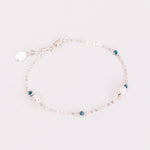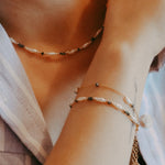 Fabriqué en or laminé 14ct ou argent 925, il est incrusté de perles de culture blanches et de pierres de diamants bleus bruts.