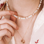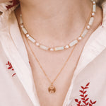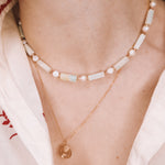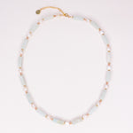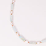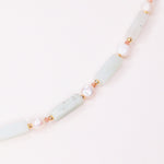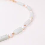 Collier précieux en goldfilled (alliage de laiton et d'or 14ct) ou en argent 925, orné de pierres naturelles d'amazonite verte, de perle de culture blanche et de rhodochrosite rose. Le collier fait 38cm de longueur avec une chaine d'extension de 5cm.