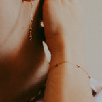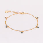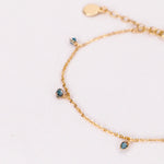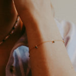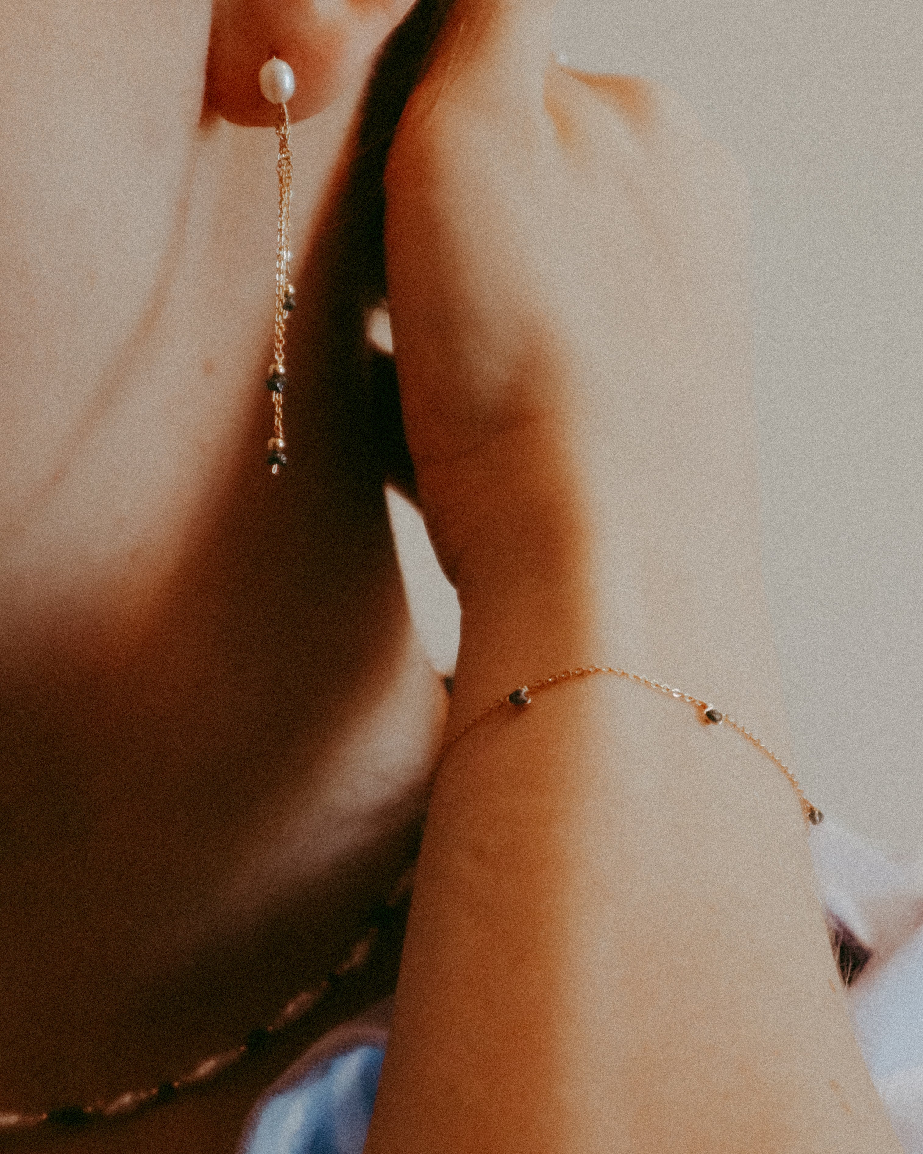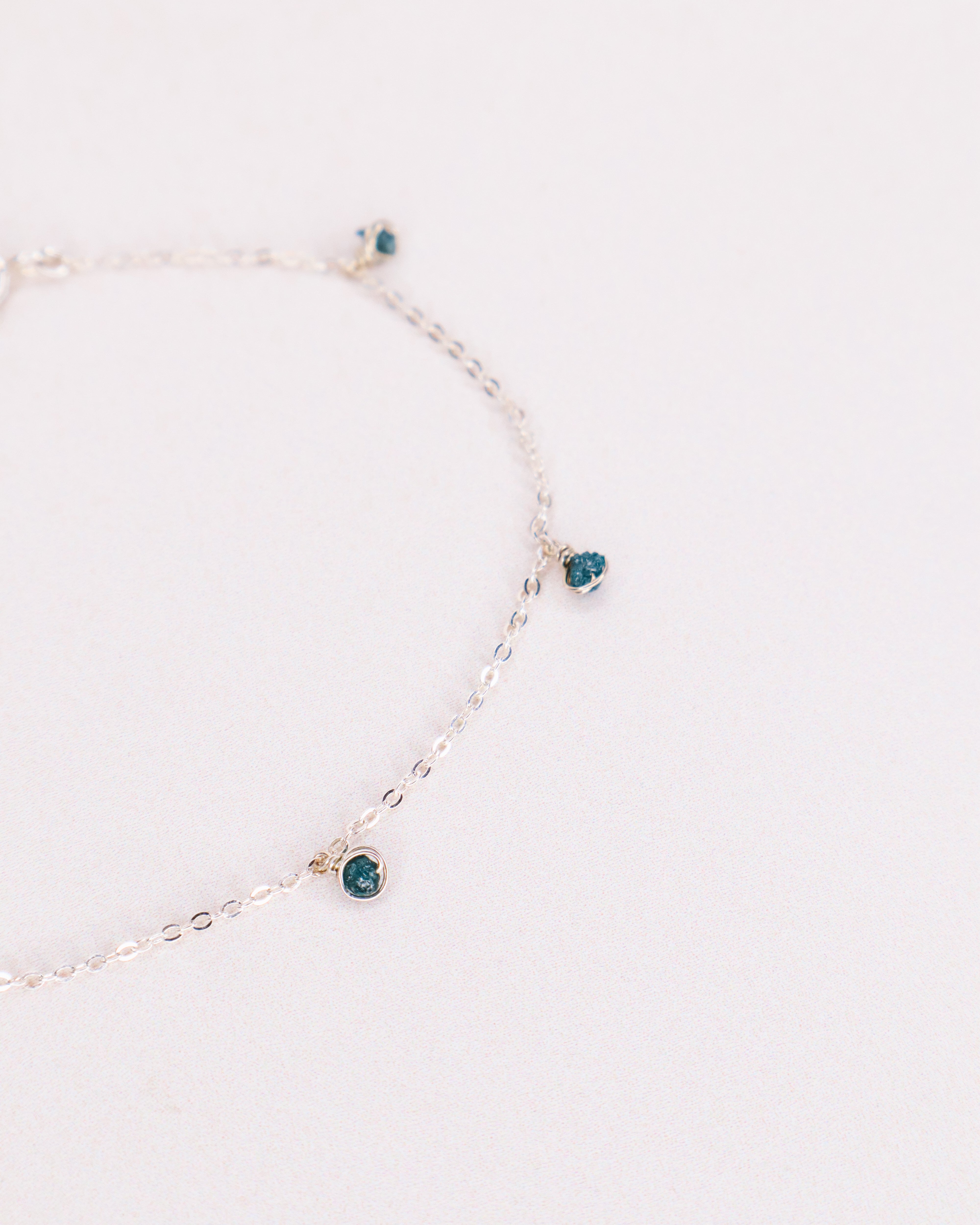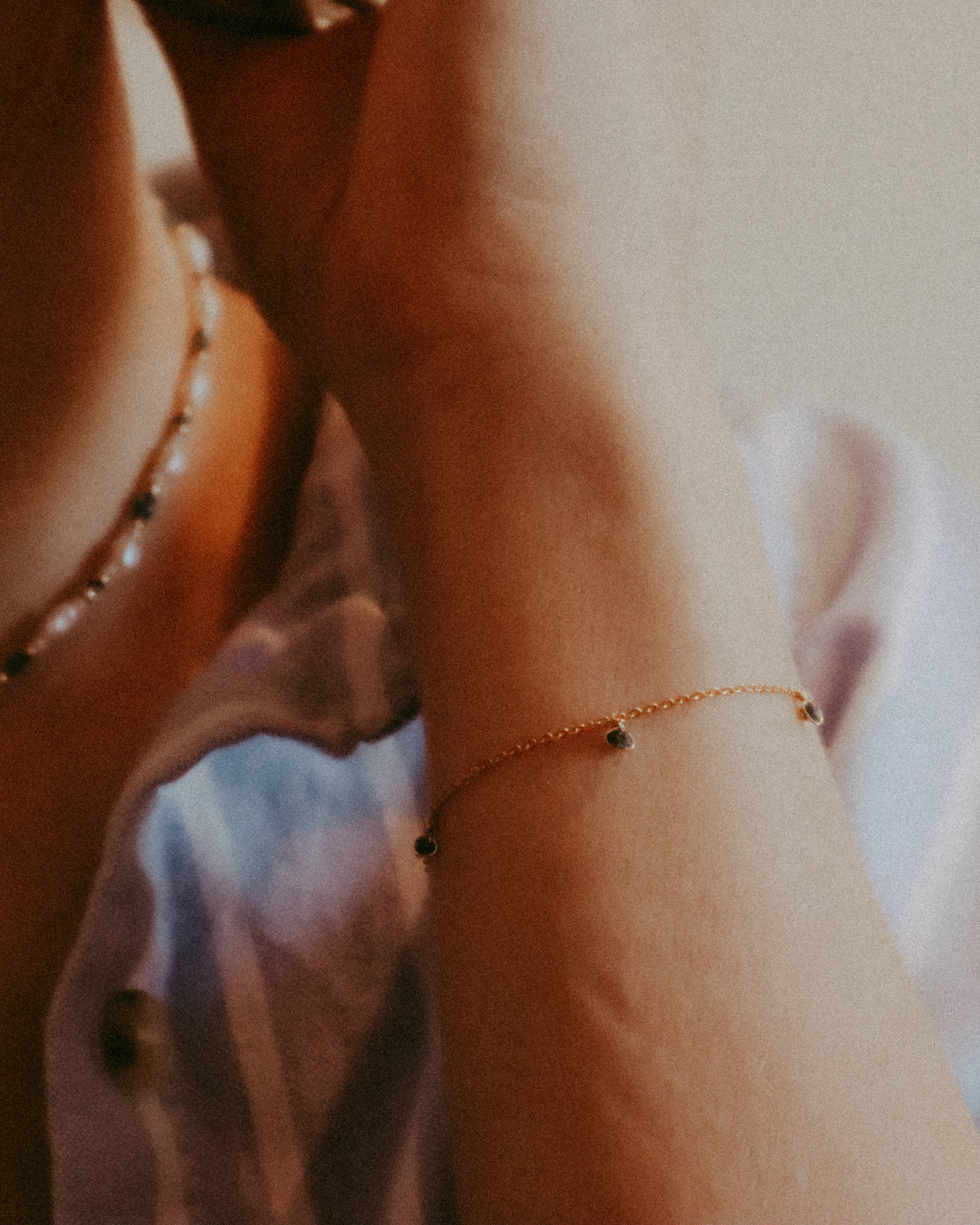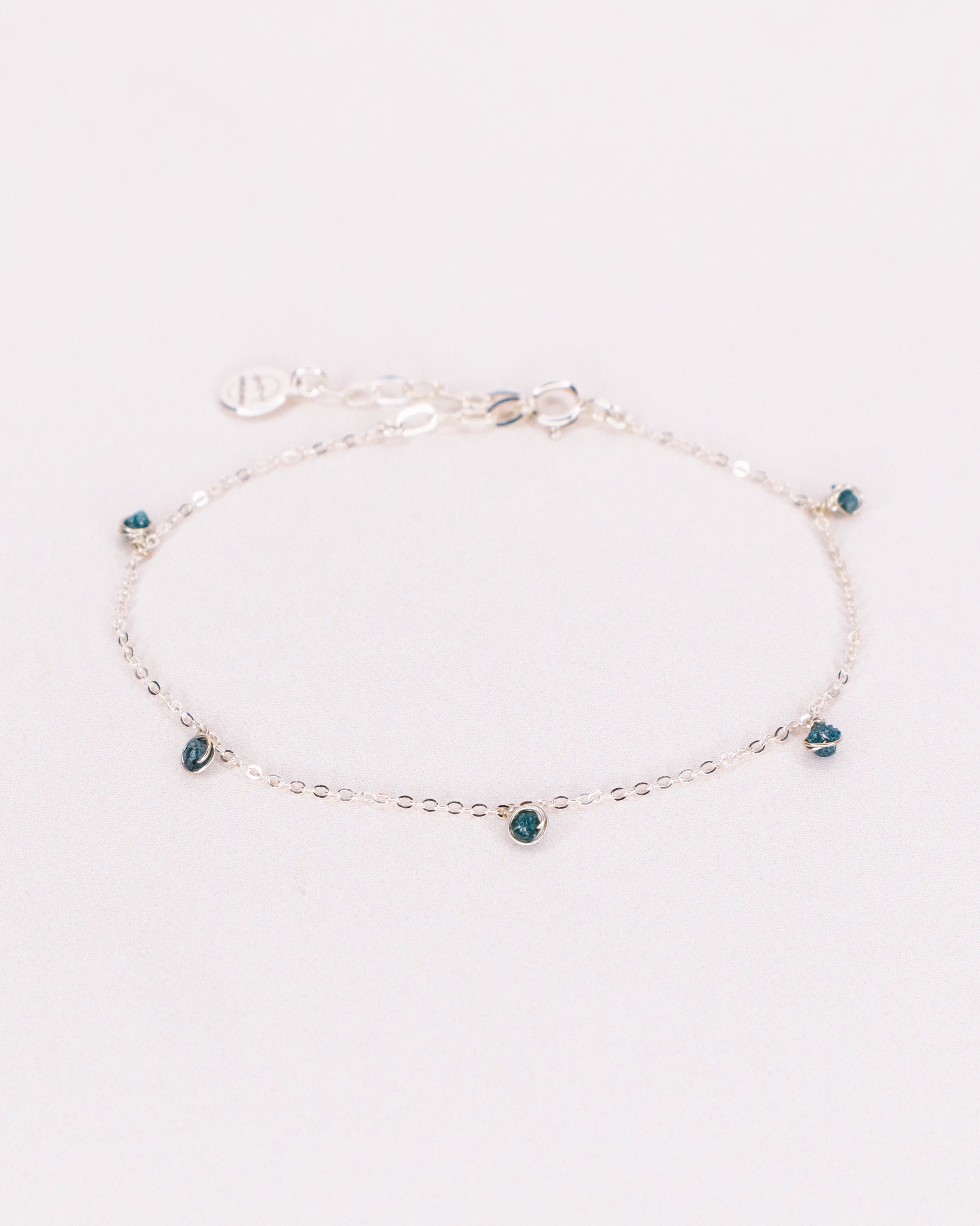 Le bracelet Haumea, en or laminé 14ct ou argent 925, est serti de diamants bleus bruts en pampilles.
