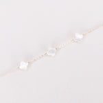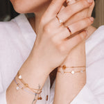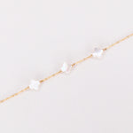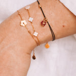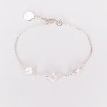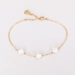 Découvrez le bracelet Jasmin en or laminé 14ct ou argent 925 incrusté de trois perles de nacre de taille trèfle.
