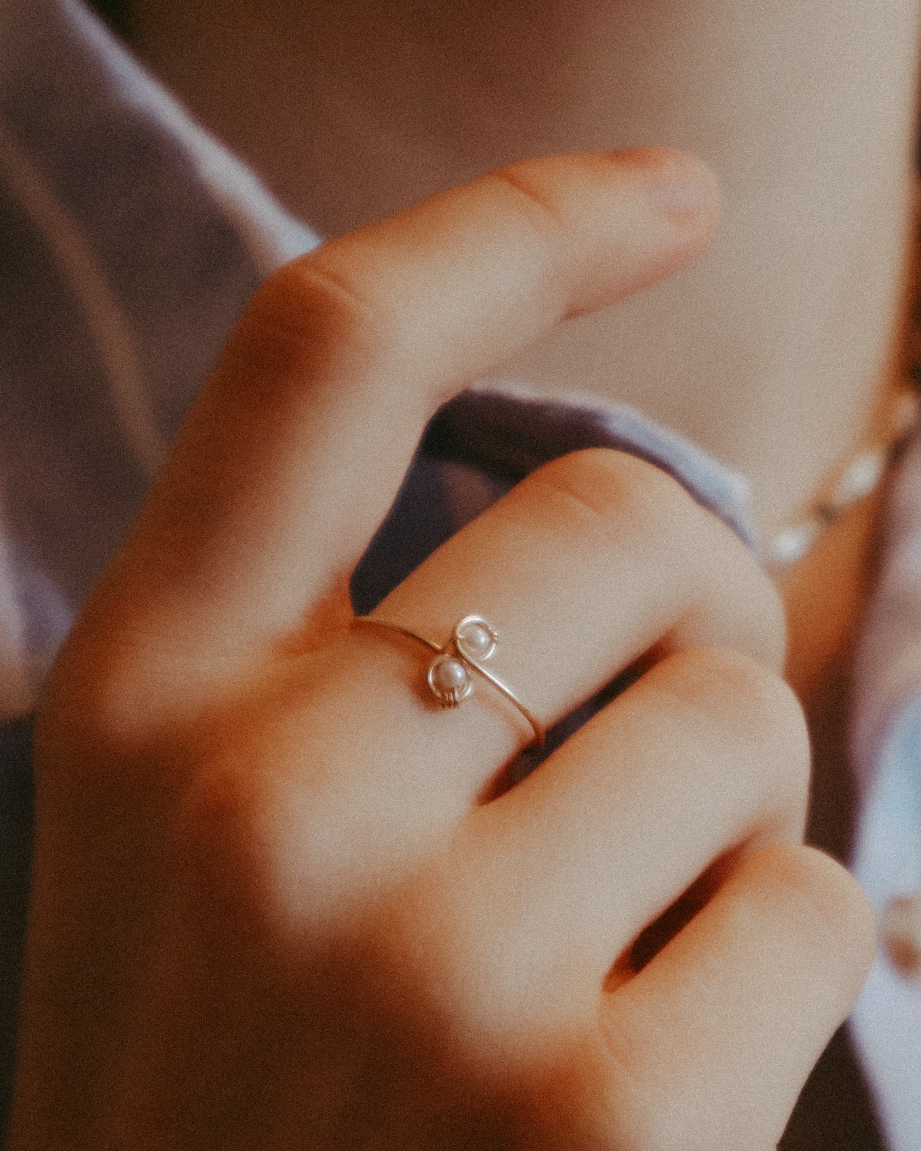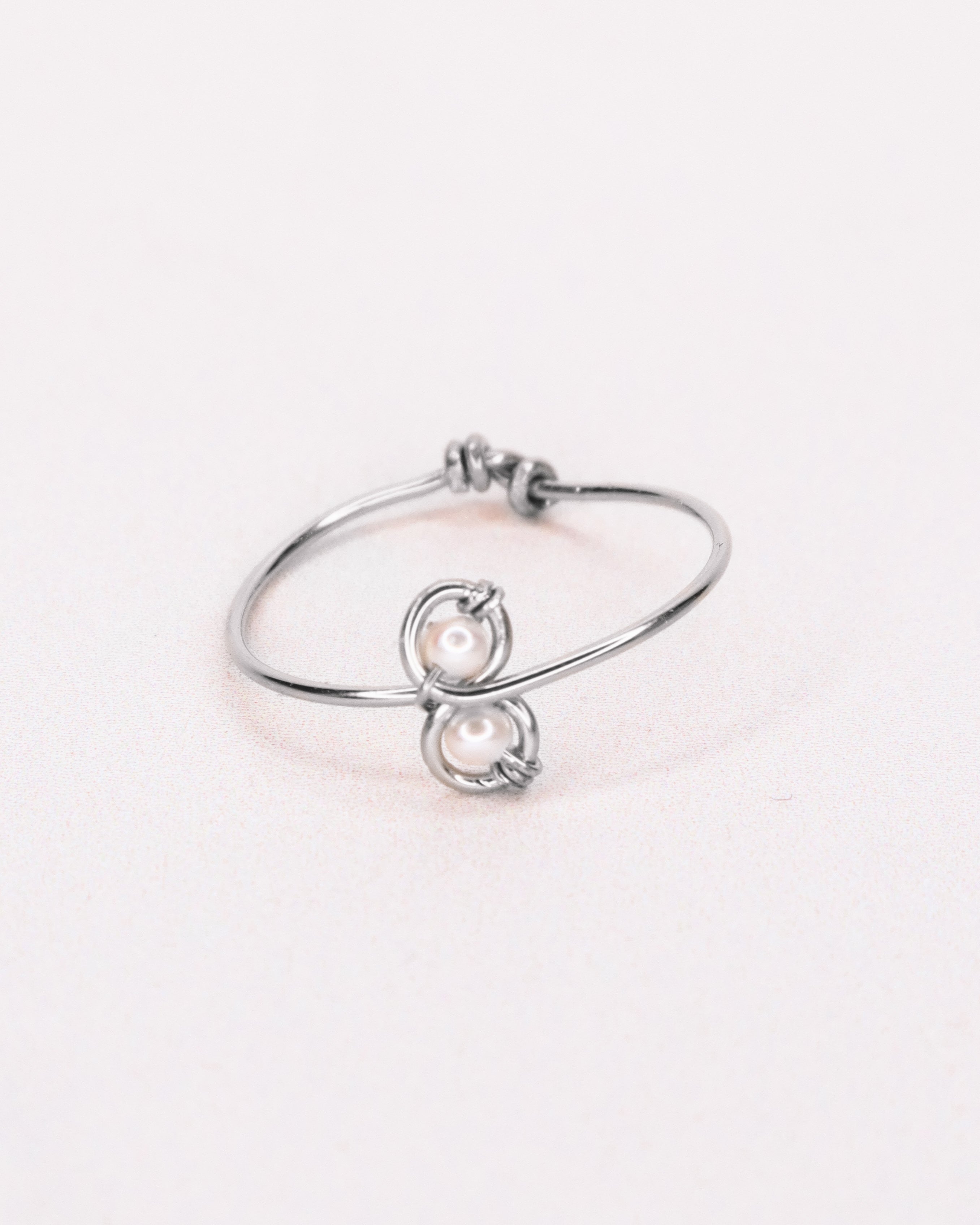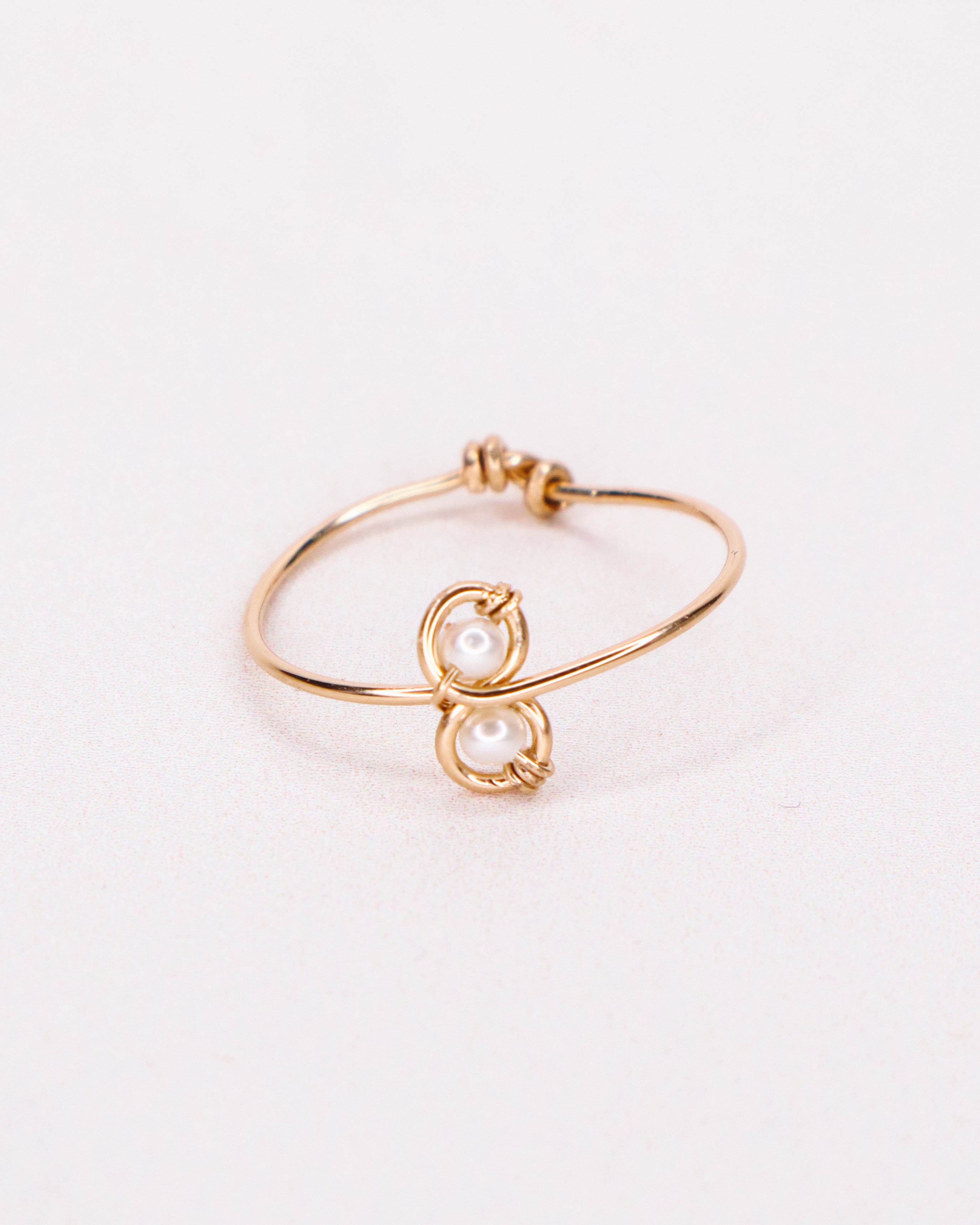Fabriquée à la main en or laminé 14ct ou argent 925, cette bague mise en forme sur mesure et sertie de perles de culture blanches ajoute une touche unique à votre style.