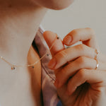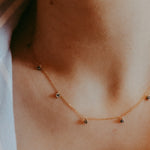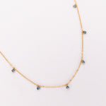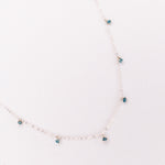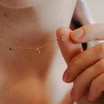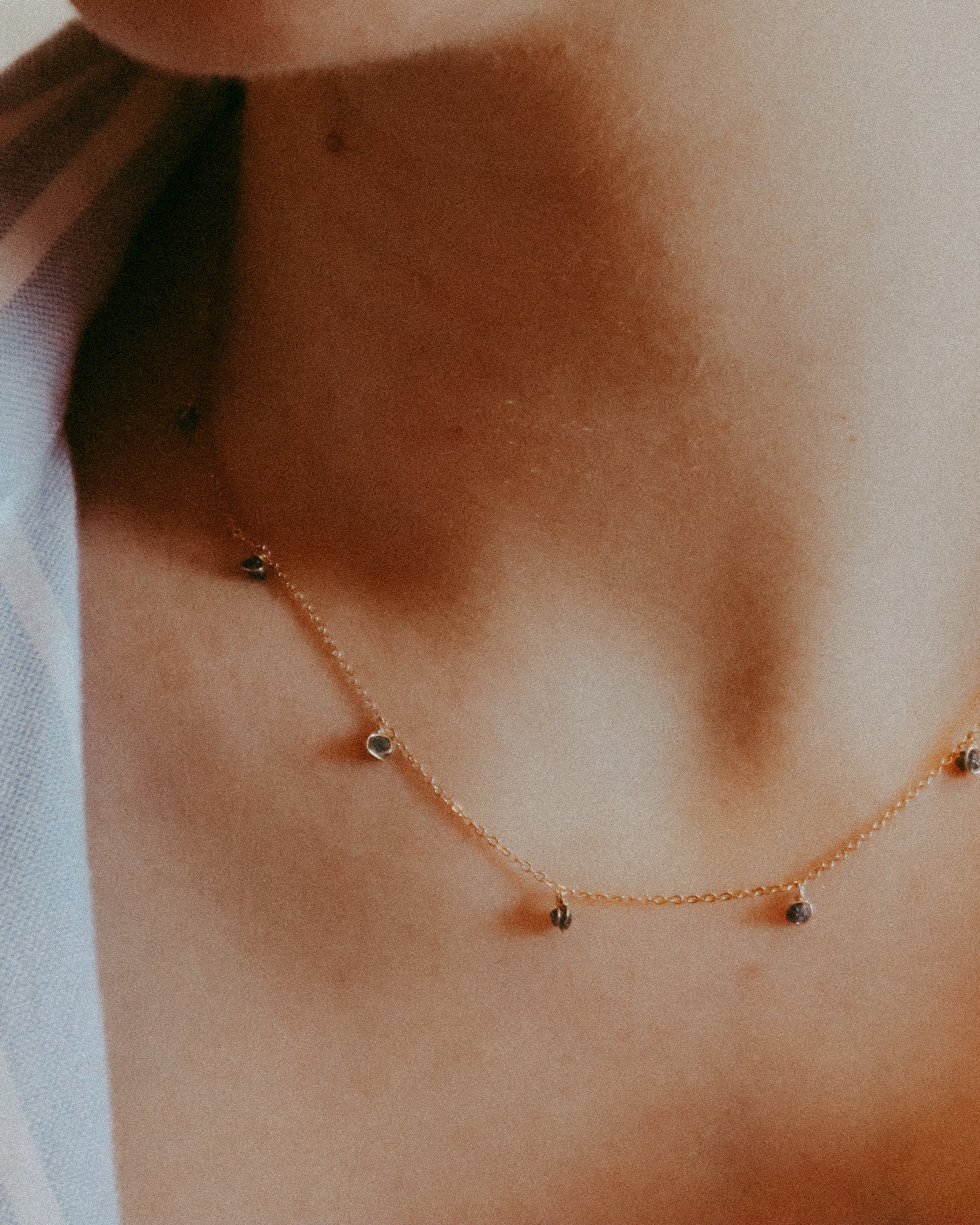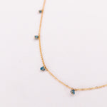 Découvrez Nova, le collier en or laminé de 14 carats ou en argent 925 orné de pampilles de diamants bruts bleus.